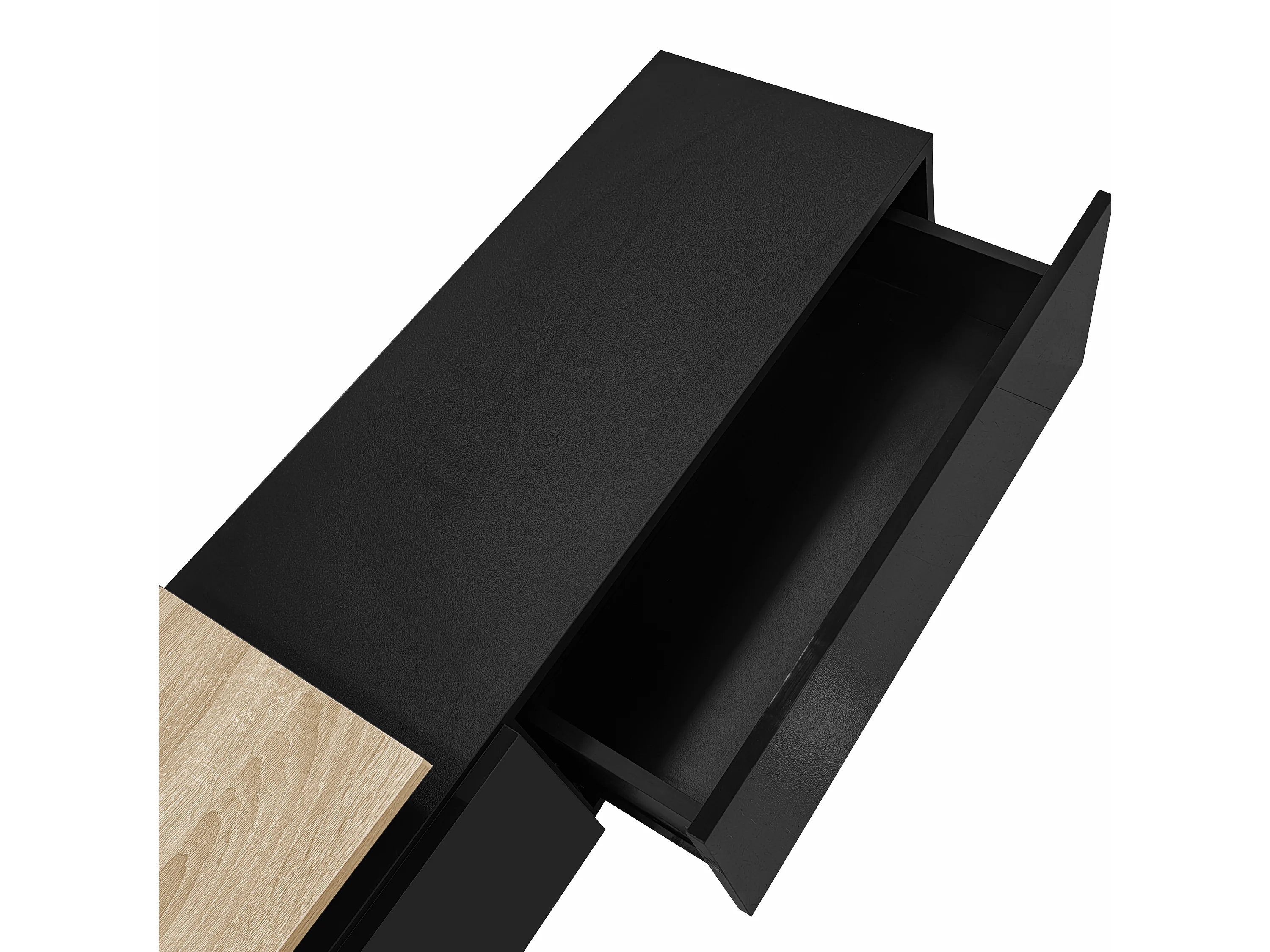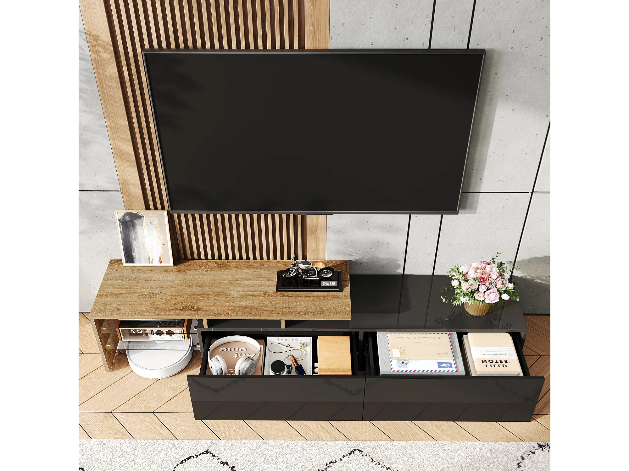 Mueble TV de madera natural y negra, con 3 puertas, 2 compartimentos abiertos y 1 cajón, con LED