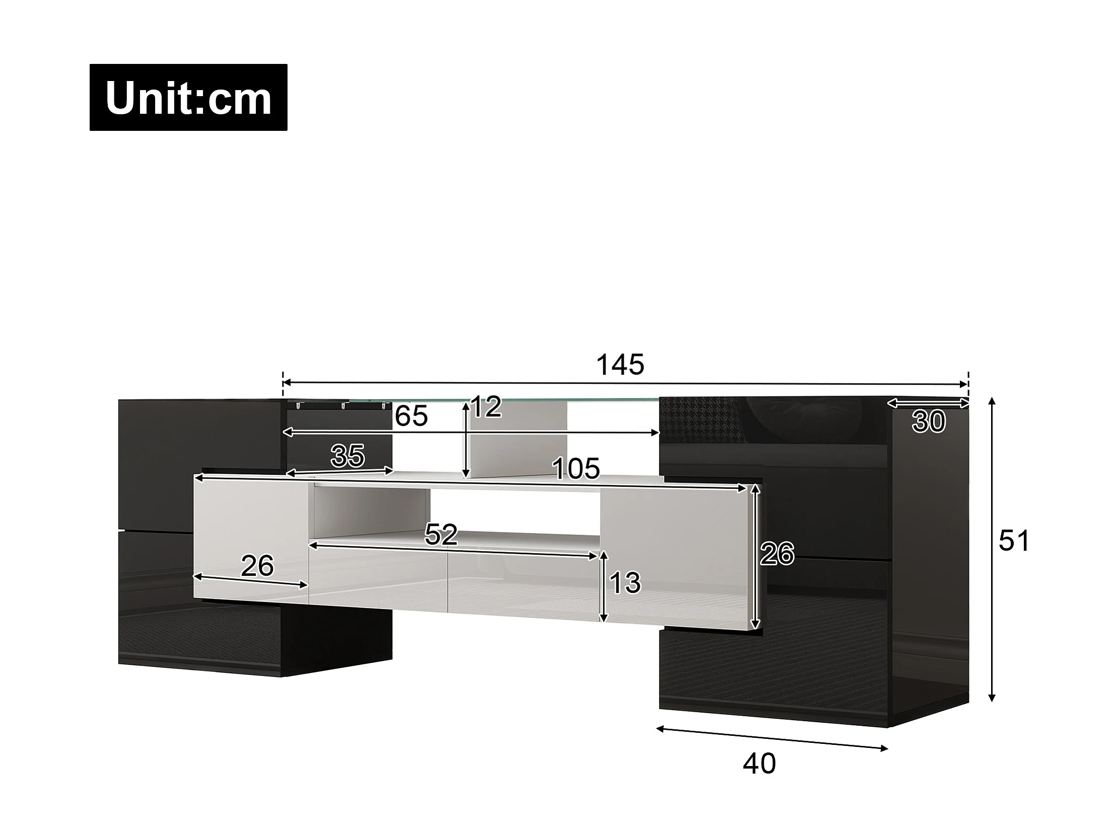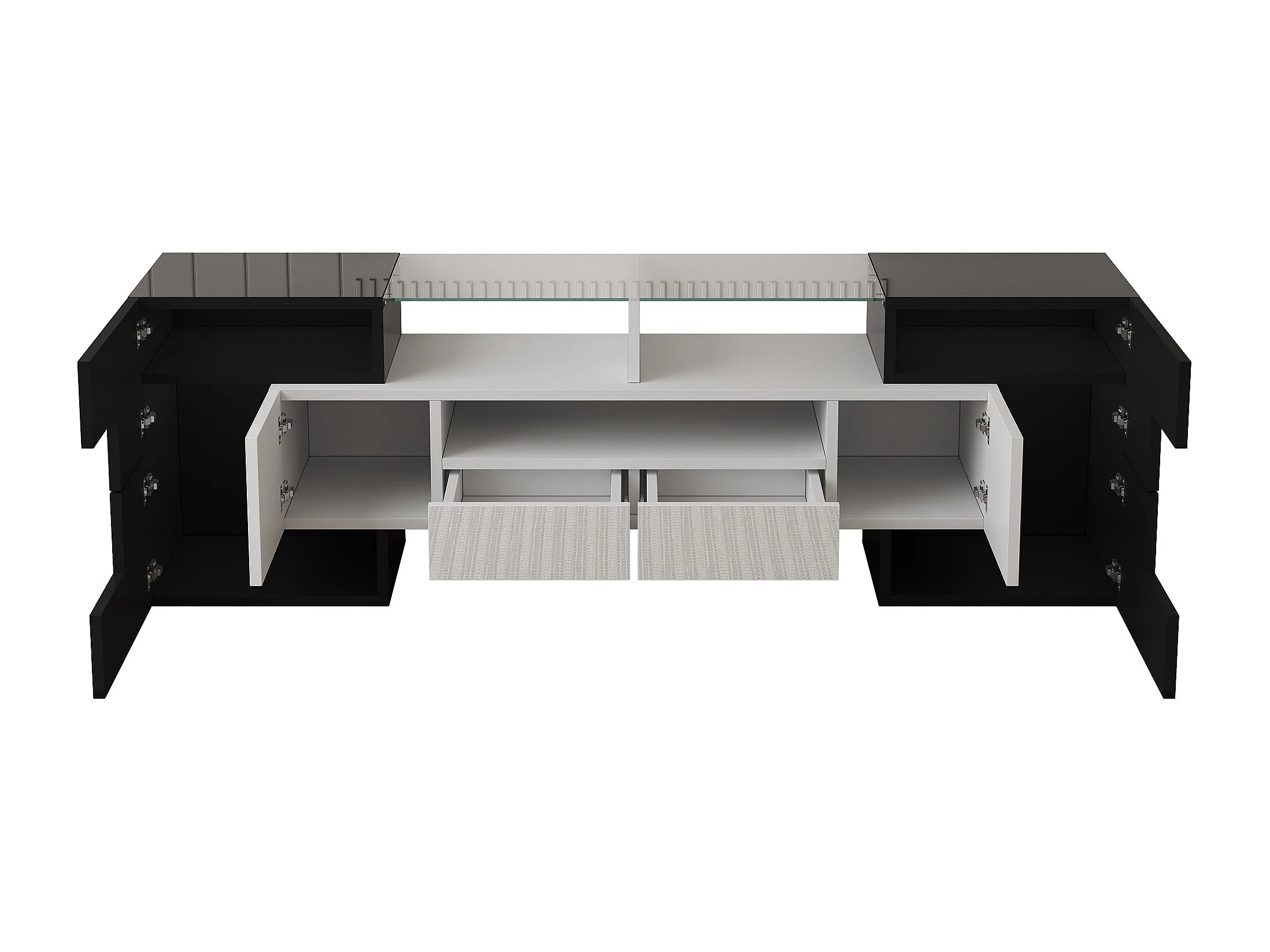 Mueble de TV moderno de alto brillo con LED, 4 puertas y 2 cajones, almacenamiento abierto, color negro