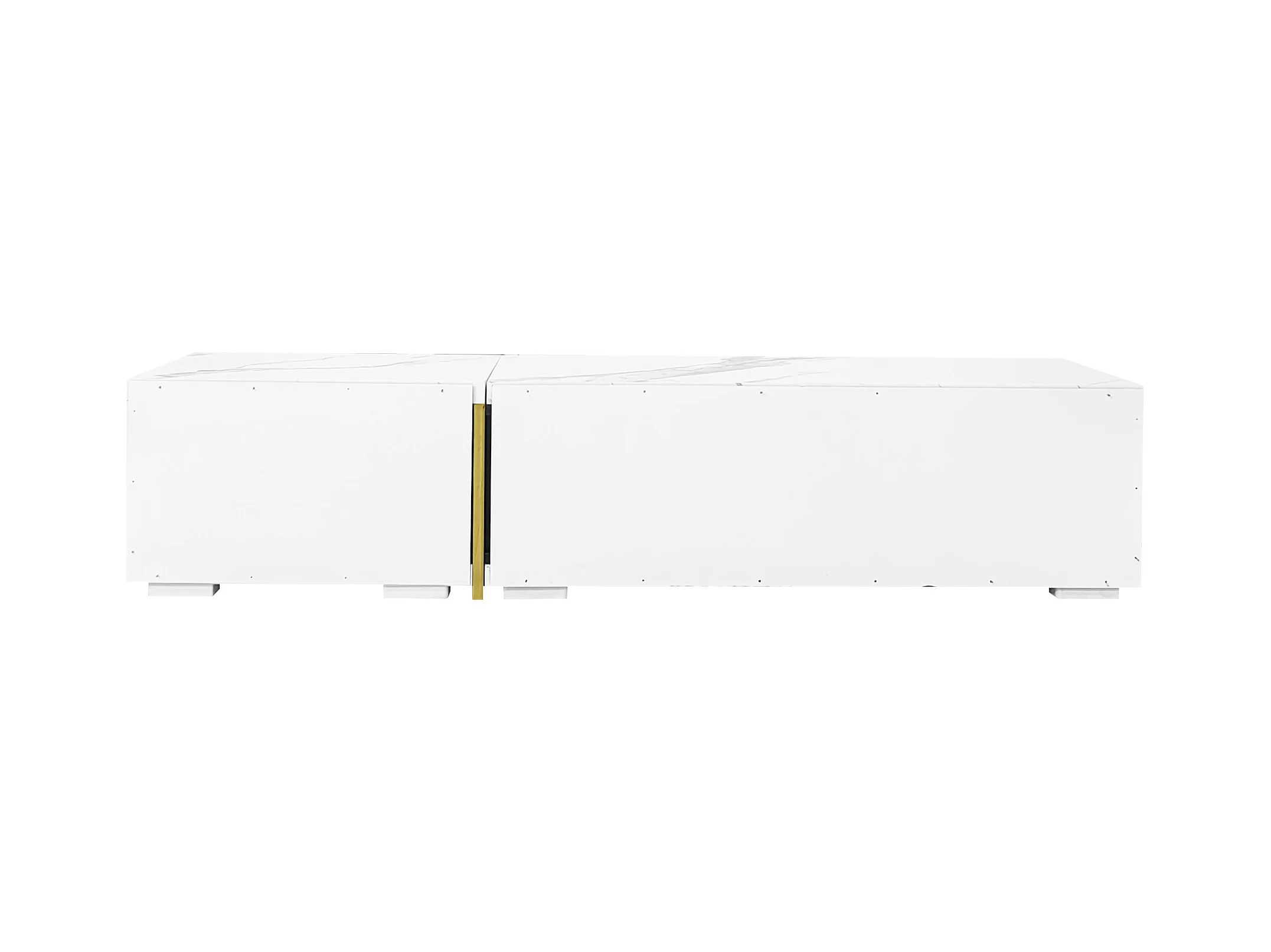 Mueble de TV con almacenaje, 2 puertas y 4 cajones, mueble de TV bajo, patas y tiradores dorados, color negro