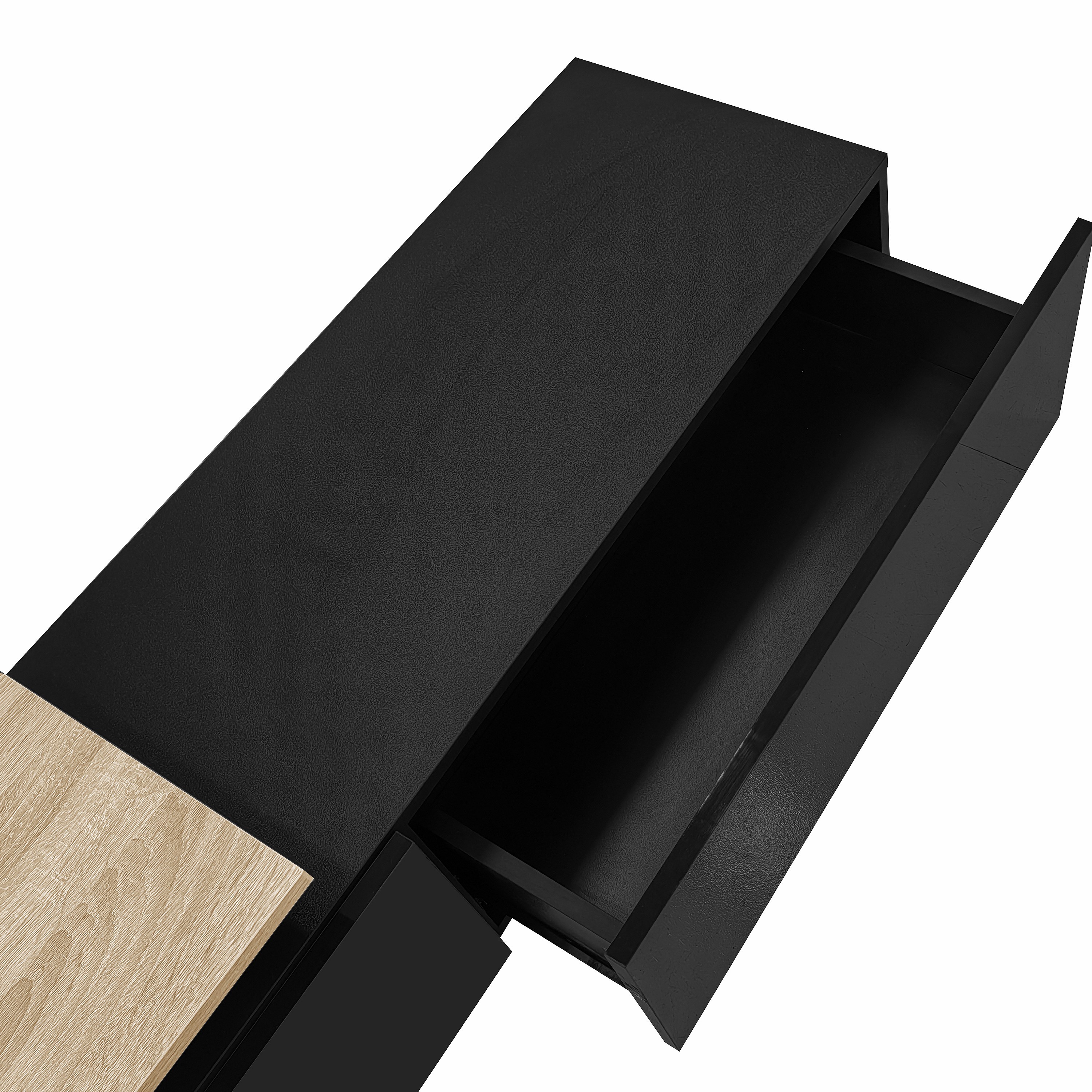 Mueble de TV moderno, práctico espacio de almacenamiento, mesa de TV con efecto madera, estantes de vidrio, LED, negro