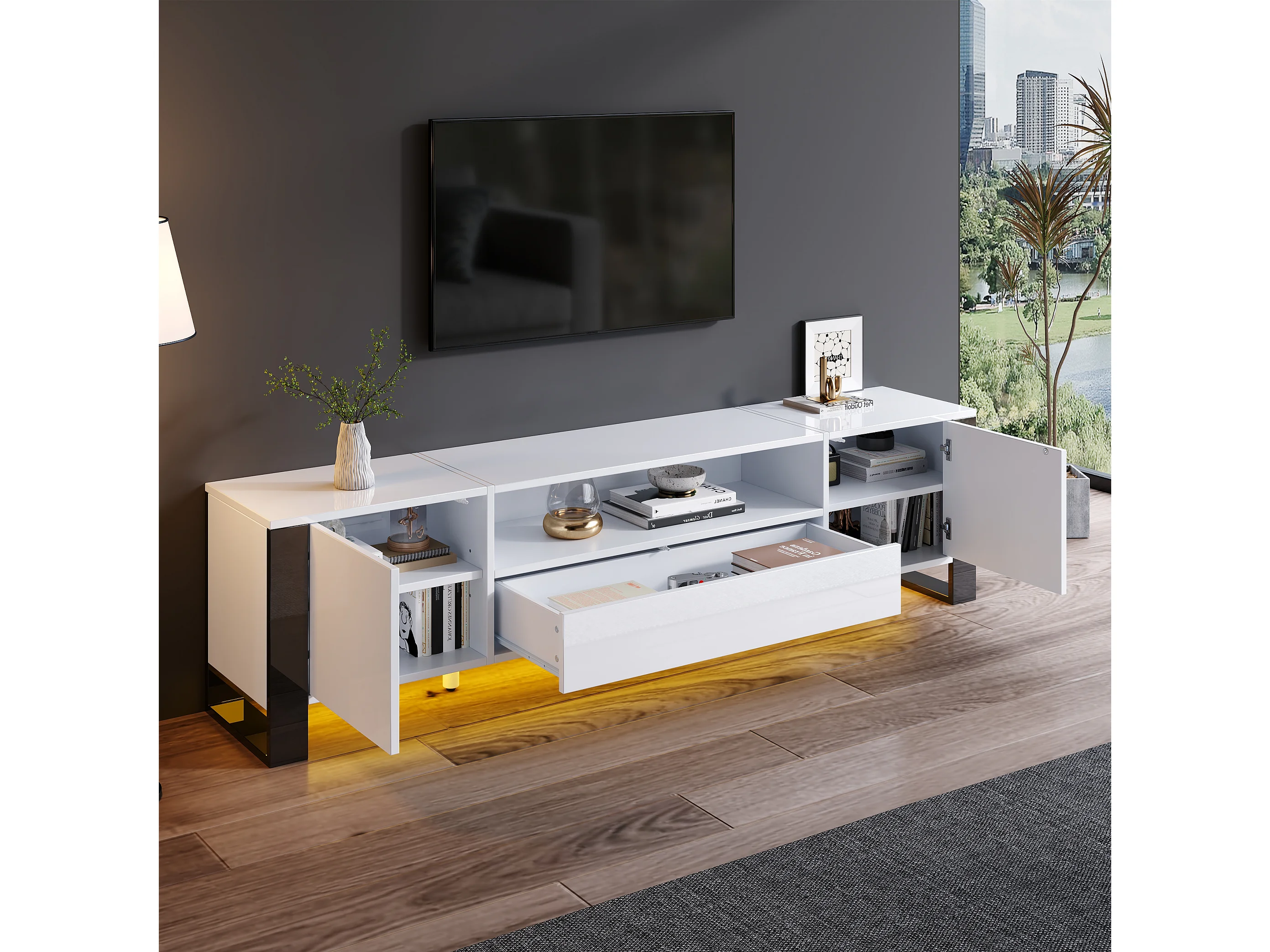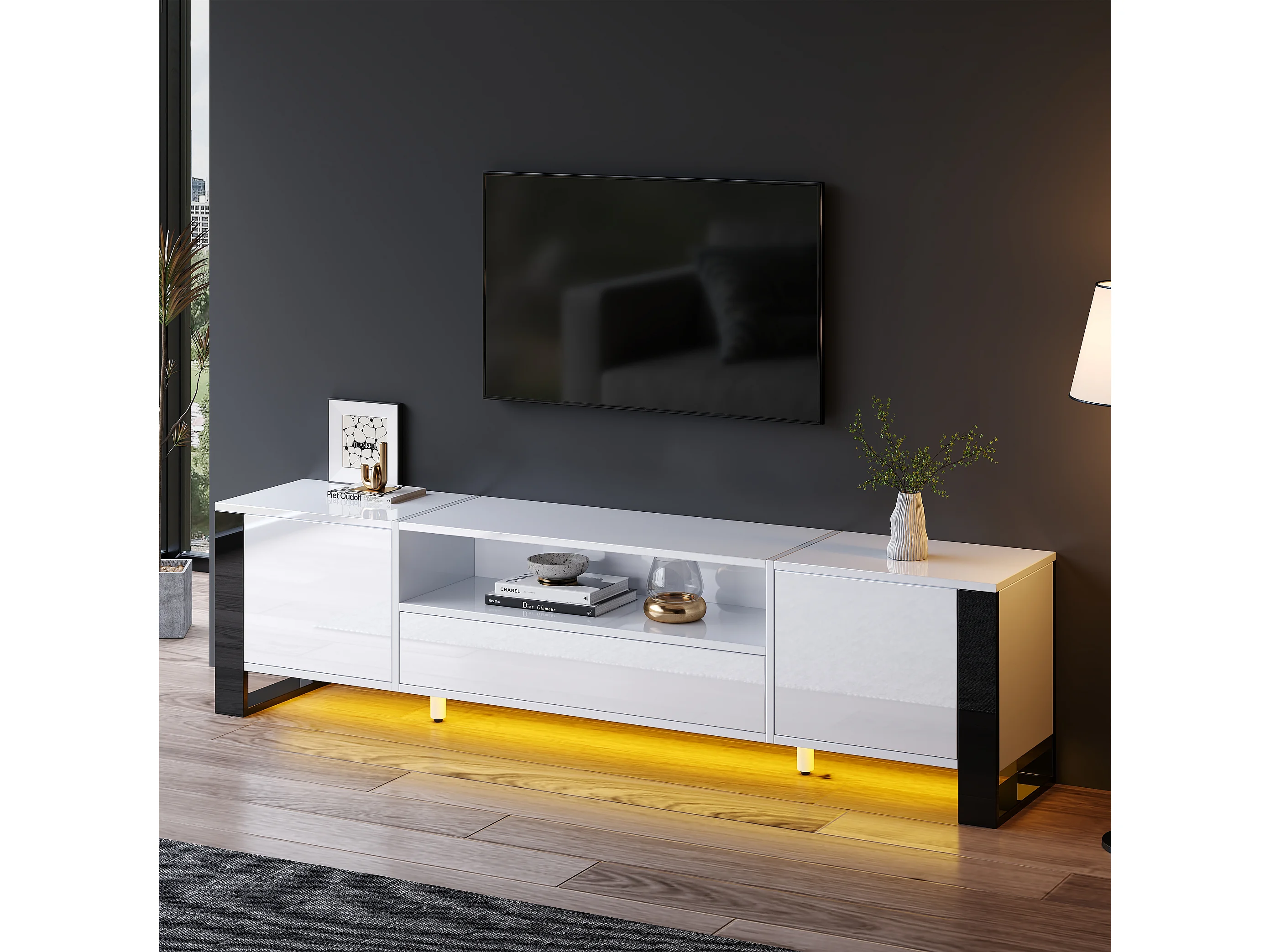 Mueble de TV moderno y brillante de 178 cm con iluminación LED, mueble de TV con espacio de almacenamiento, blanco