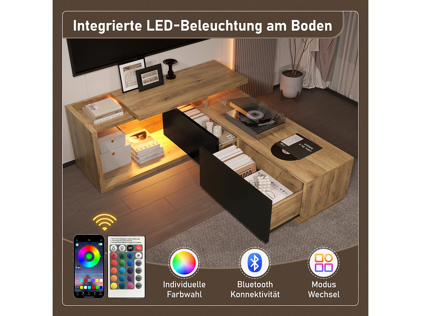 Mueble TV de madera natural y negra, con 3 puertas, 2 compartimentos abiertos y 1 cajón, con LED