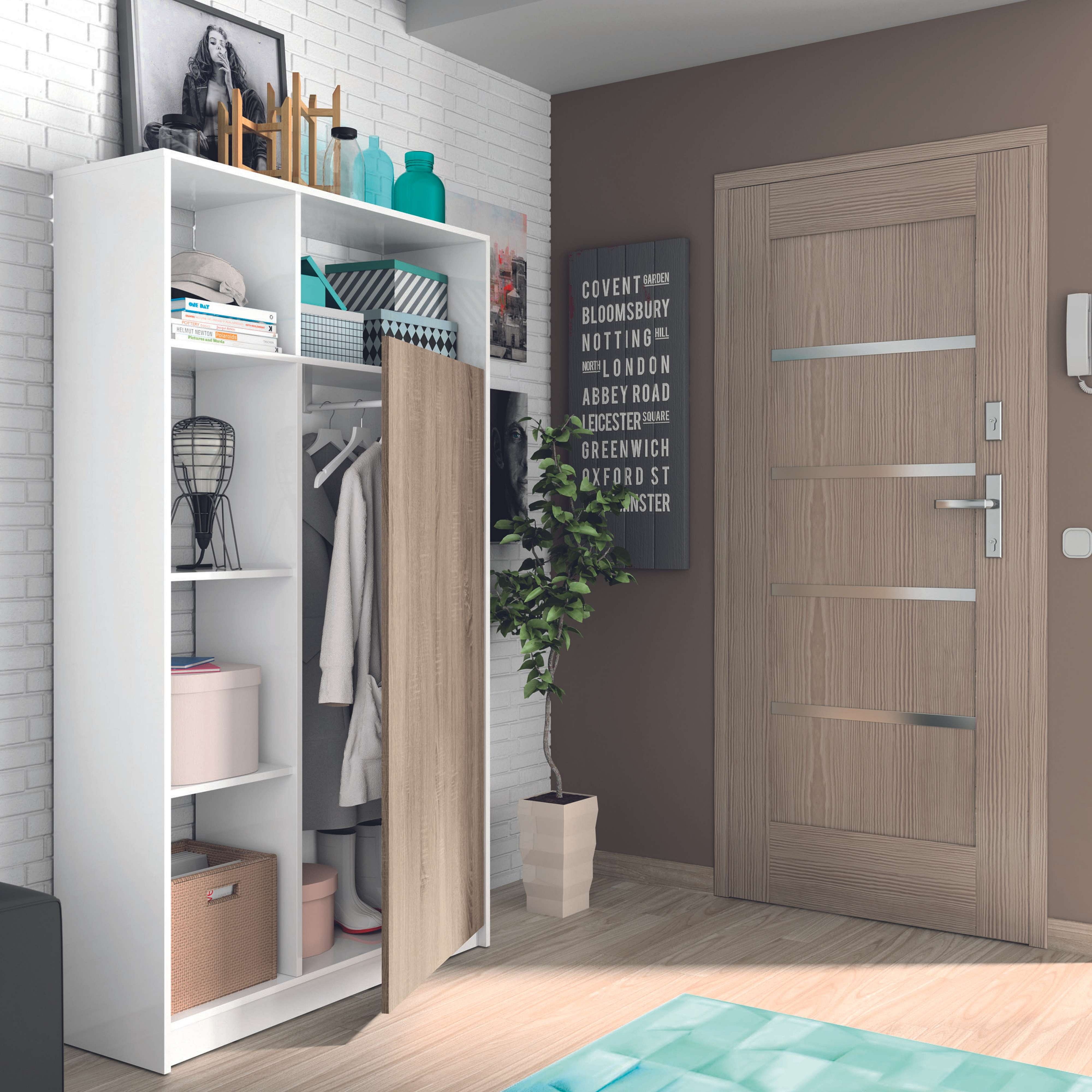 Este mueble recibidor fusiona comodidad y prestaciones con un fantástico estilo, Sus estantes están acabados en color blanco brillo e incorpora una puerta en color cambrian, Dentro de la puerta incluye una barra para colgar, muy práctico para tener siempre a mano tus abrigos y prendas al entrar y salir de casa, Sus 5 estantes te ayudarán a almacenar o también decorar tu entrada con fotografías o recuerdos personales, Es un producto de fabricación nacional con melamina de alta calidad, Medidas: 187 cm de altura 100 cm de ancho 35 cm de profundidad Se trata de un mueble de kit para montaje e incluye su correspondiente manual de instrucciones y su conjunto de tornillería, ( , y )No se garantizan envíos a Menorca, Ibiza y Formentera. Las entregas se realizan a pie de calle