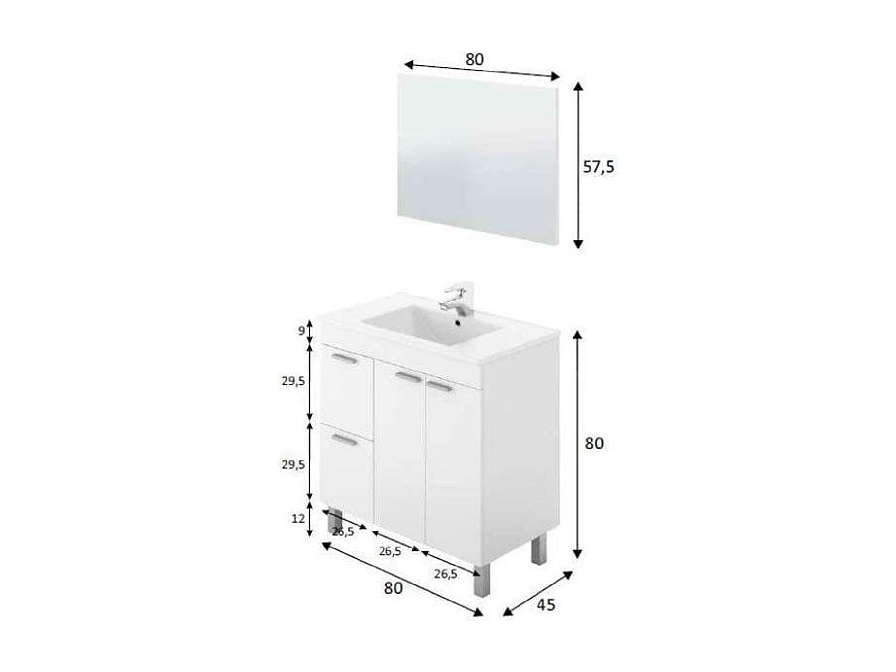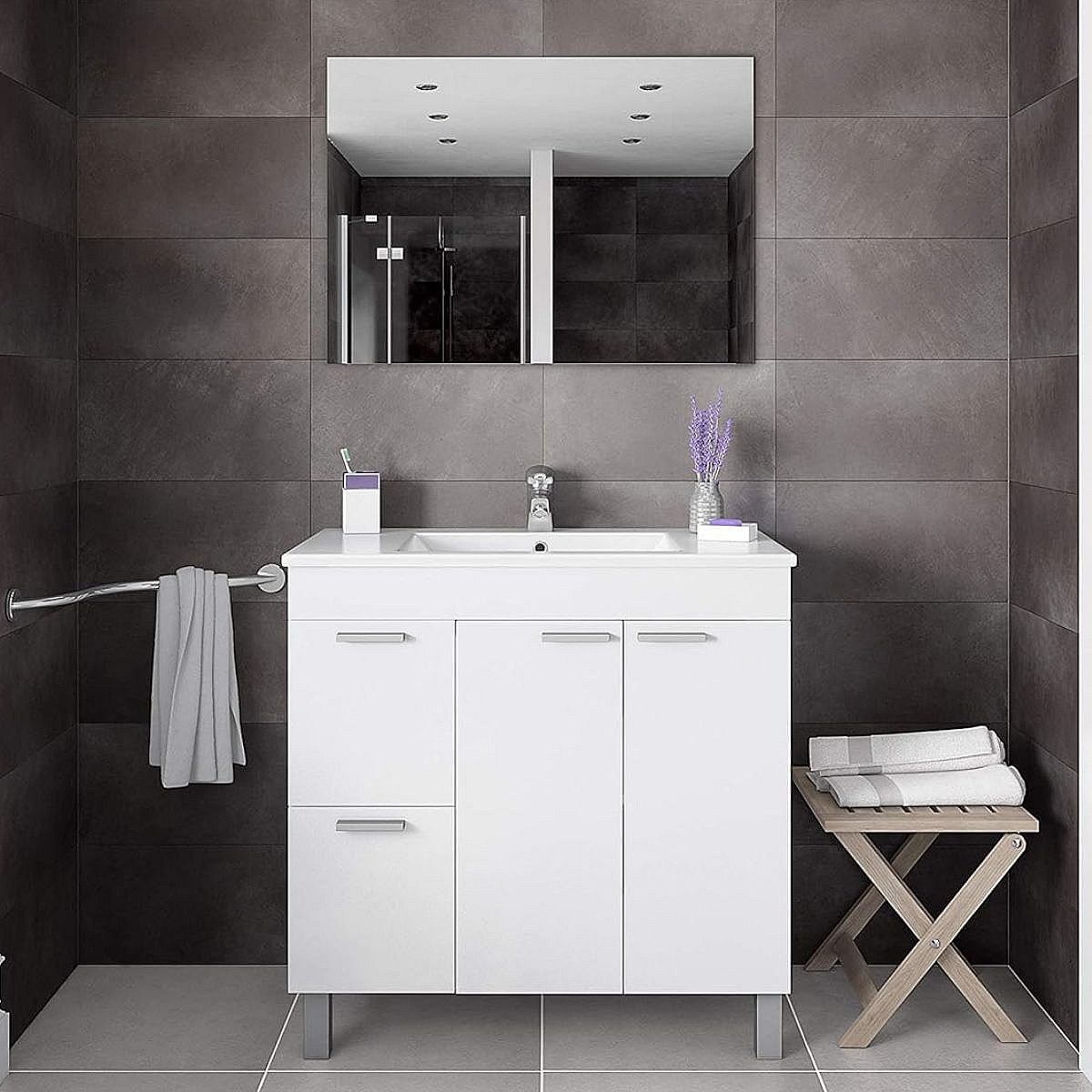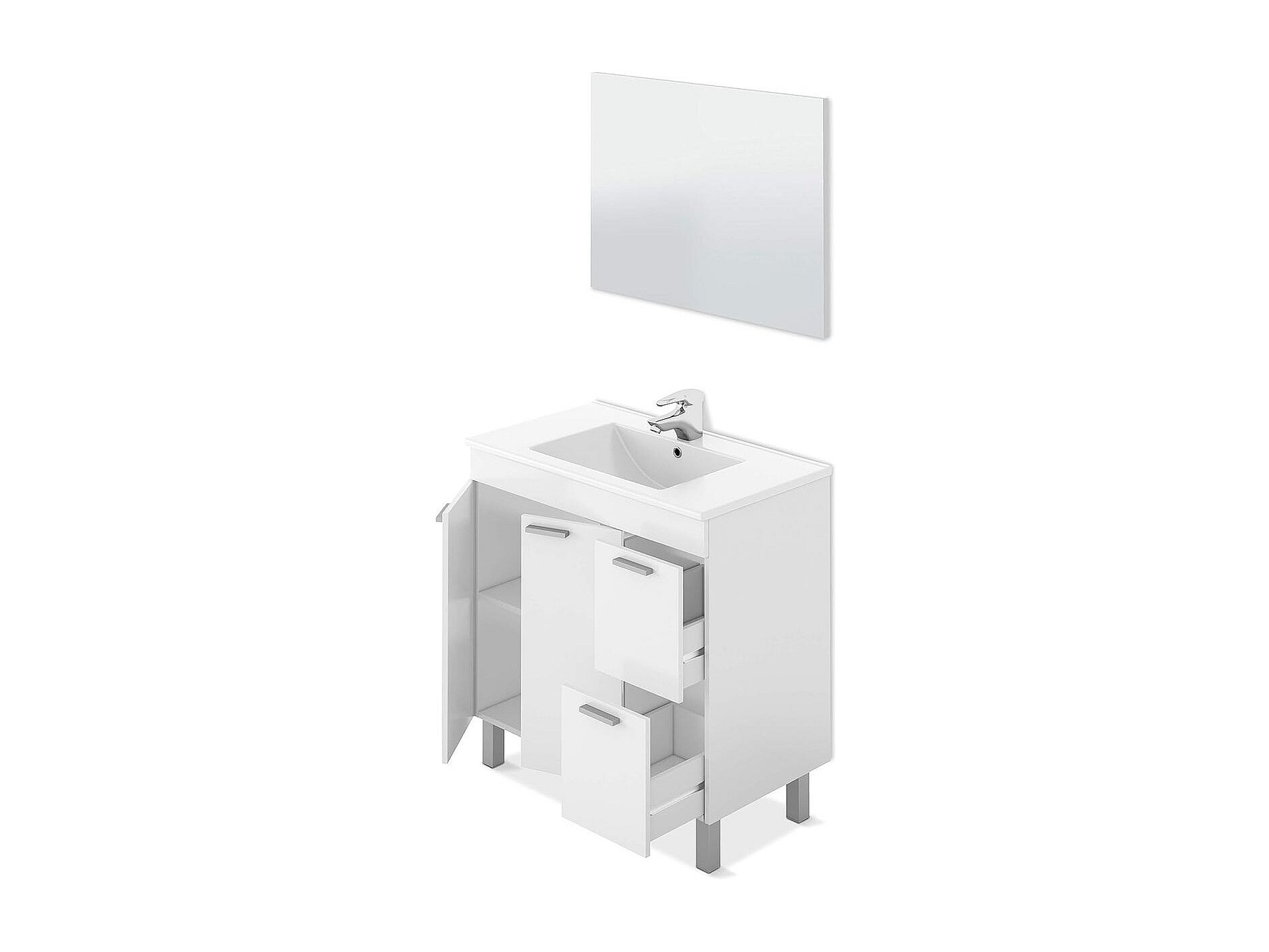 Este mueble de baño modelo Aktiva nunca pasará de moda gracias a su diseño elegante y combinable. Está compuesto por dos puertas con 2 estantes y un espacioso interior para poder guardar gran variedad de cosas como por ejemplo toallas o productos de baño. Cuenta también con dos cajones de gran capacidad, el lavabo de diseño moderno y el amplio espejo, proporcionan un set ideal para baños con estilo. Este lavabo está fabricado en PMMA (Polimelmetacrilato) de alta calidad. Cuenta con tiradores metálicos alargados en forma rectangular. Las patas están fabricadas en acero inoxidable y las guías del cajón son de metal de alta calidad. ¡El mueble perfecto para tu baño a un precio impresionante!
