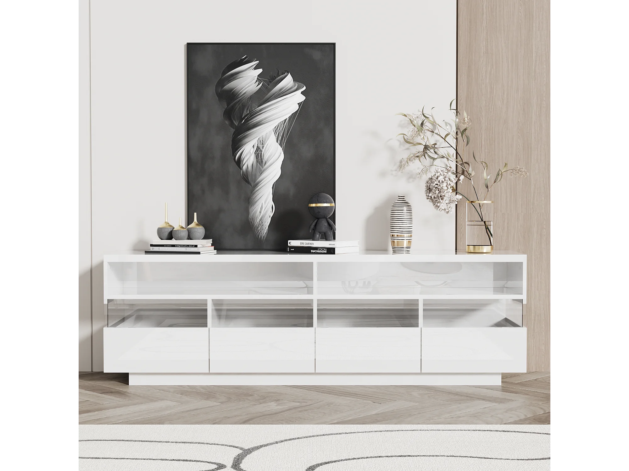 Mueble para TV suspendido con 4 cajones y 2 compartimentos, LED, alto brillo, tablero de partículas, blanco