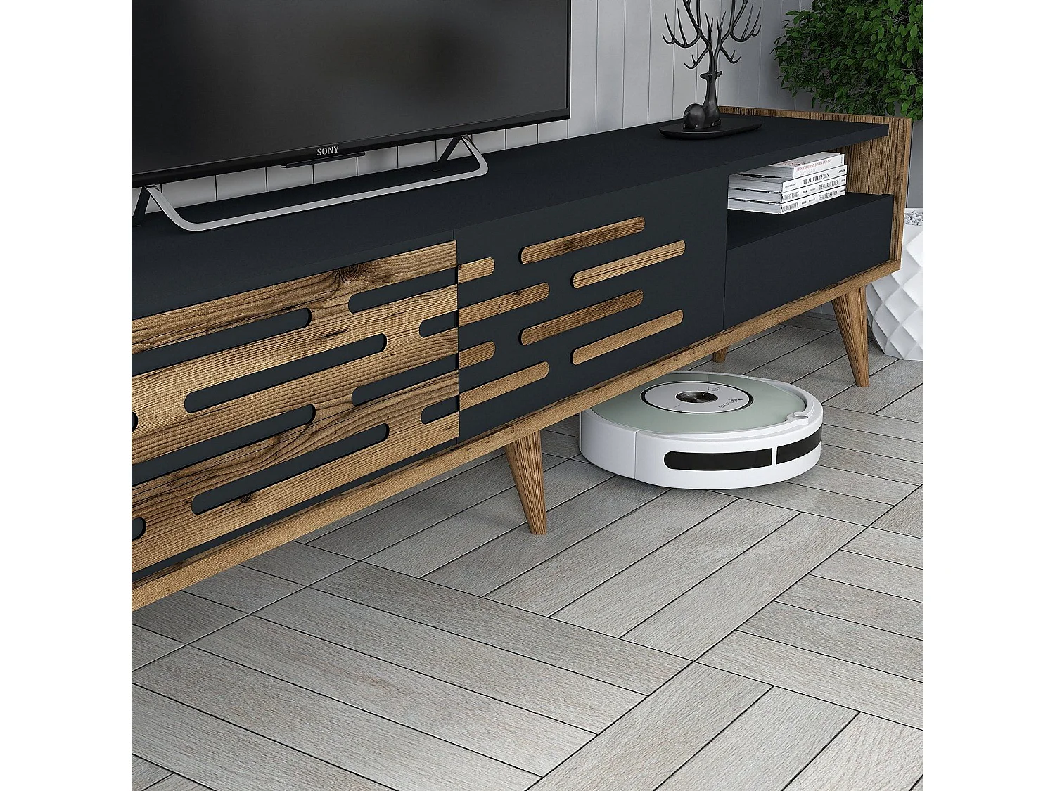 Mueble TV – 180 cm – Nogal y Antracita – MDF recubierto de melamina