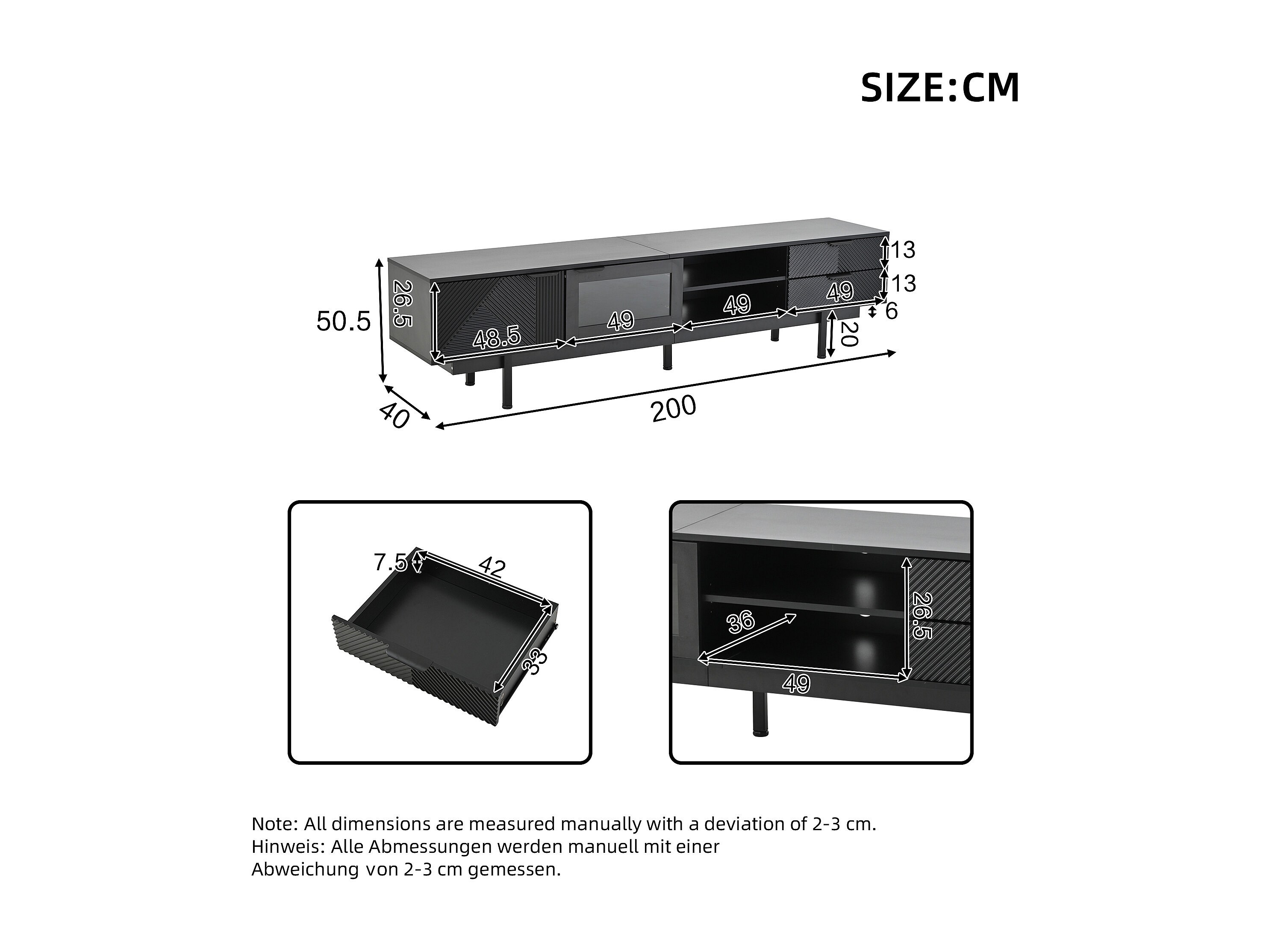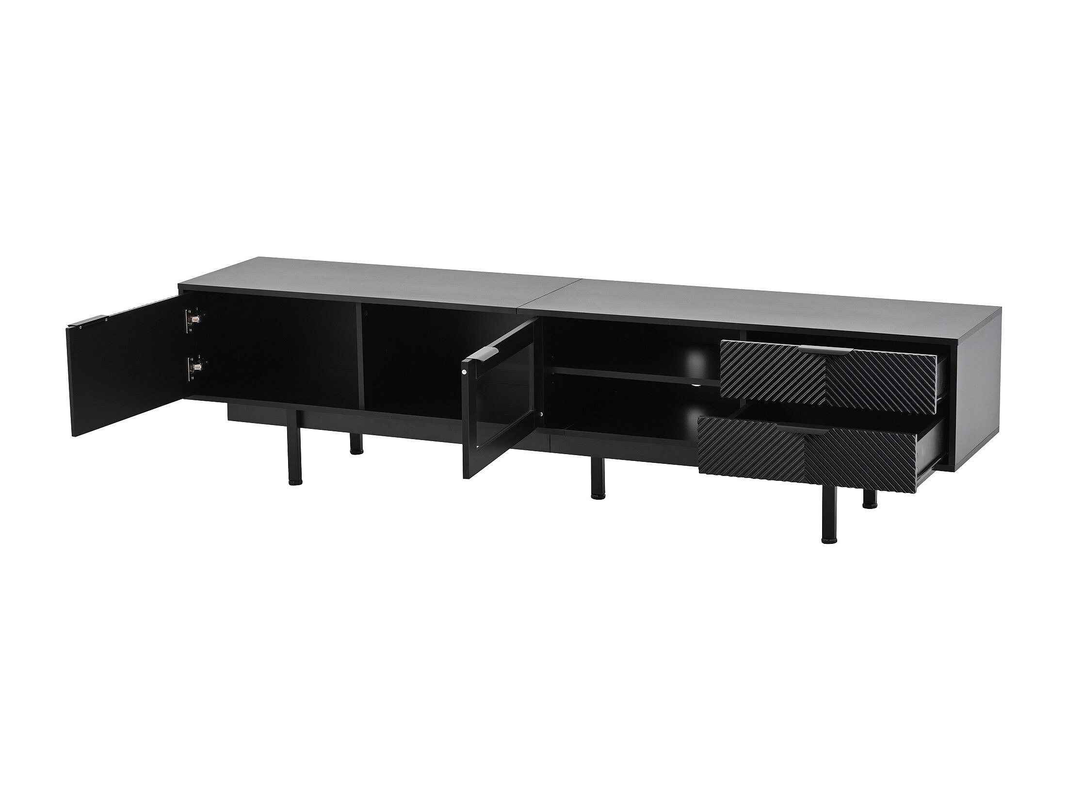 Mueble TV bajo, 200 cm de largo, con 2 puertas, 2 cajones, para comedor, salón, Negro