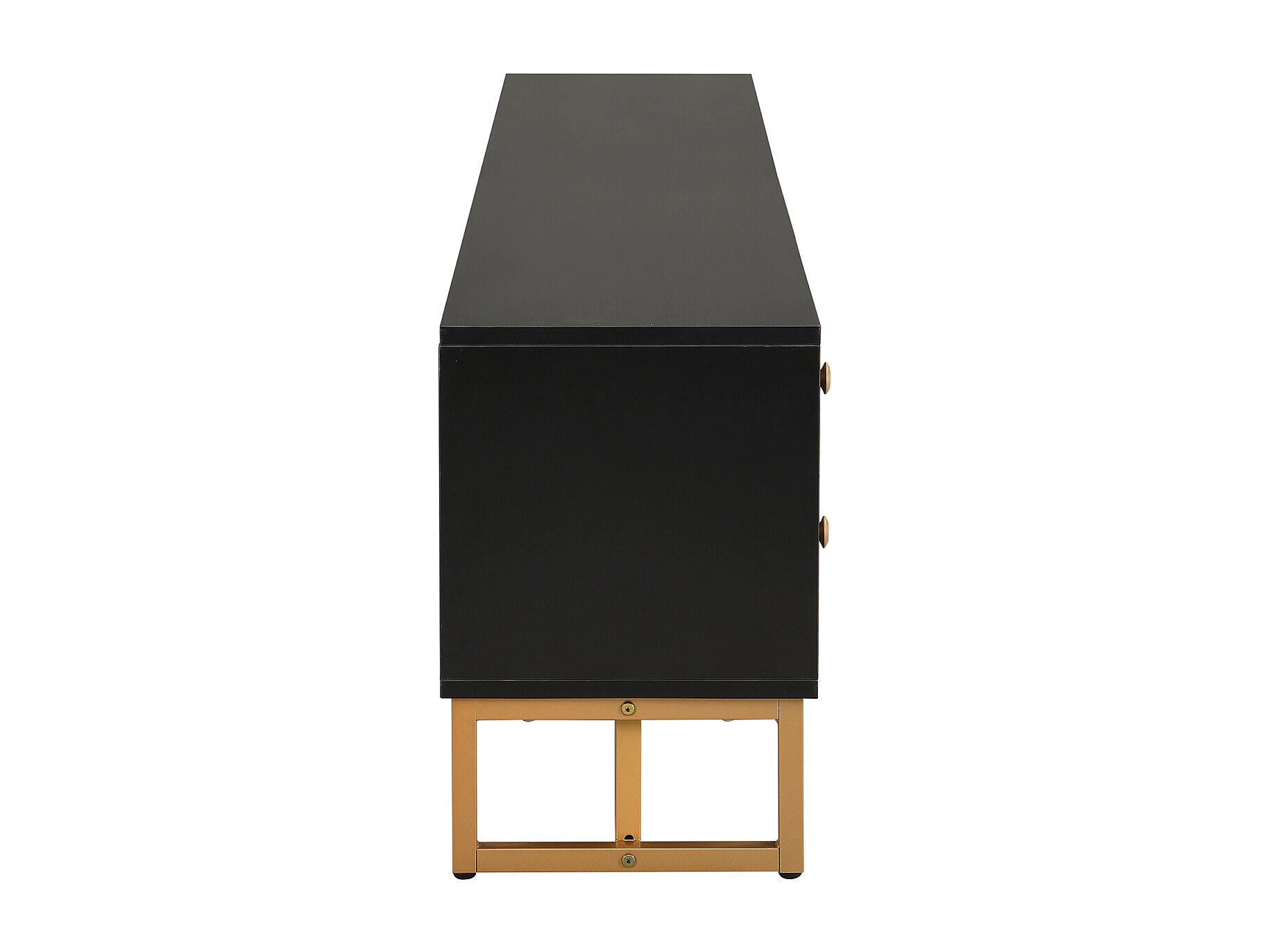 Mueble de TV bajo con 2 cajones y 2 puertas, espacio de almacenamiento con patas y borde dorados, mueble de TV negro