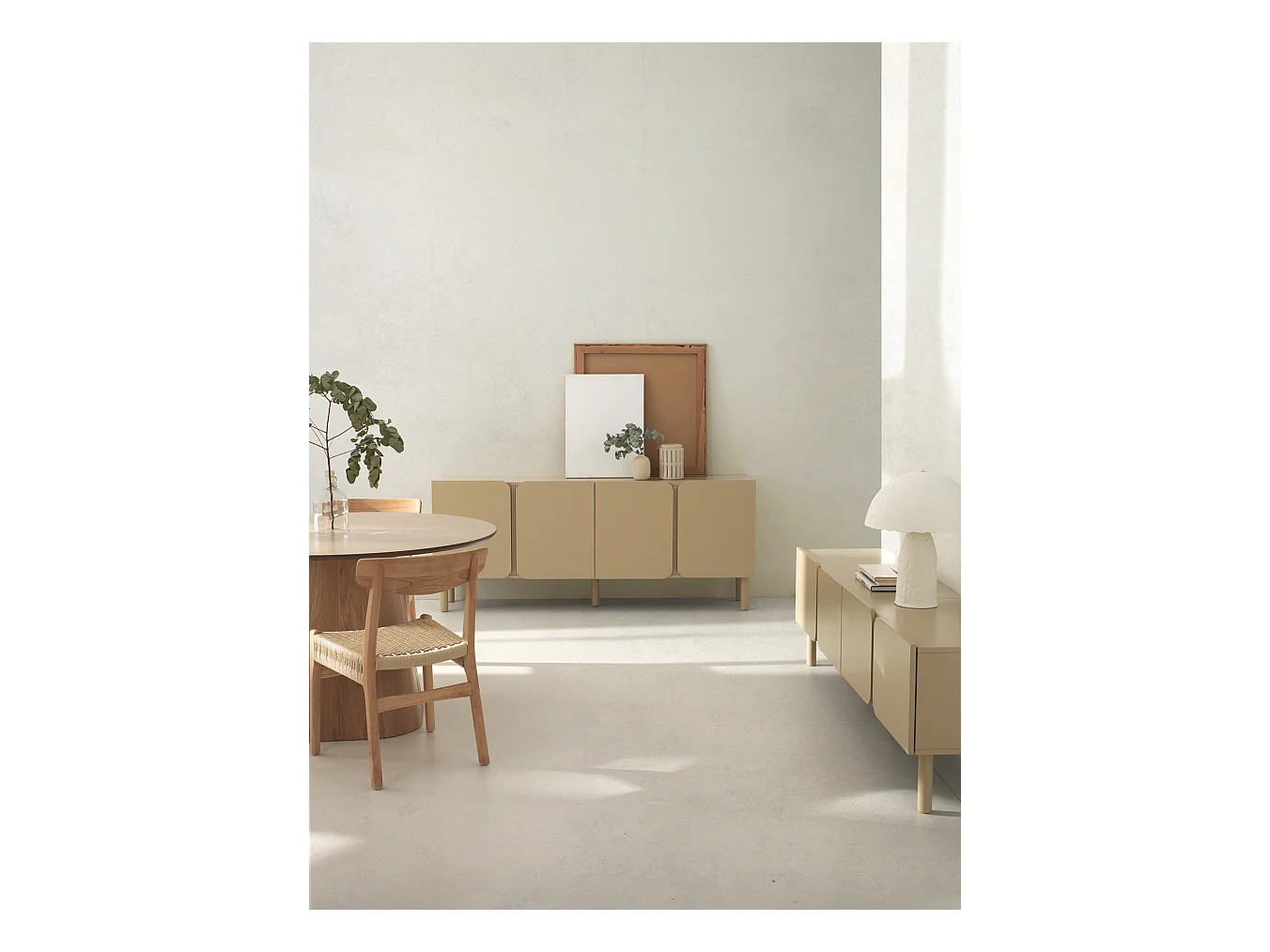 Mueble tv beige con cantos redondos en las esquinas de puertas