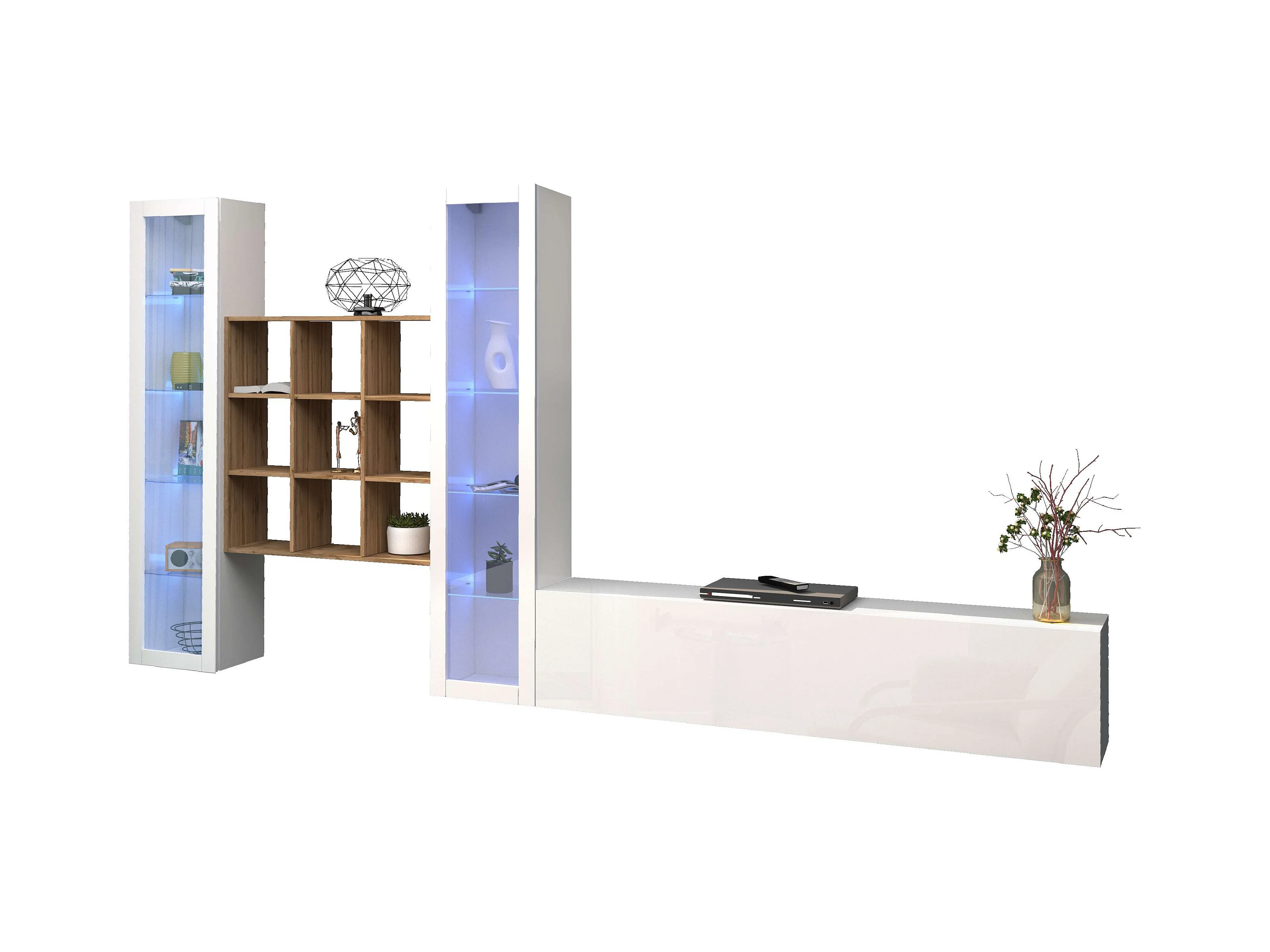 Sistema de pared suspendida blanco sala de estar TV gabinete 2 vitrinas Liv WH