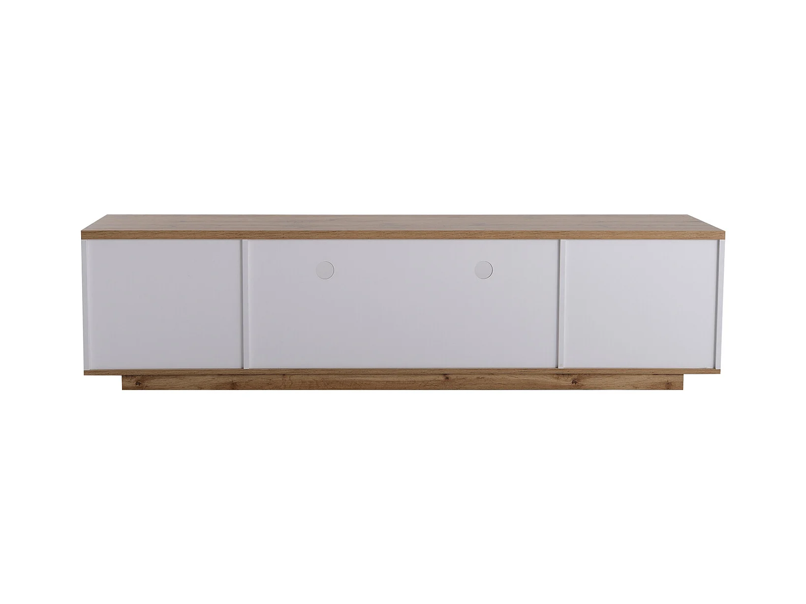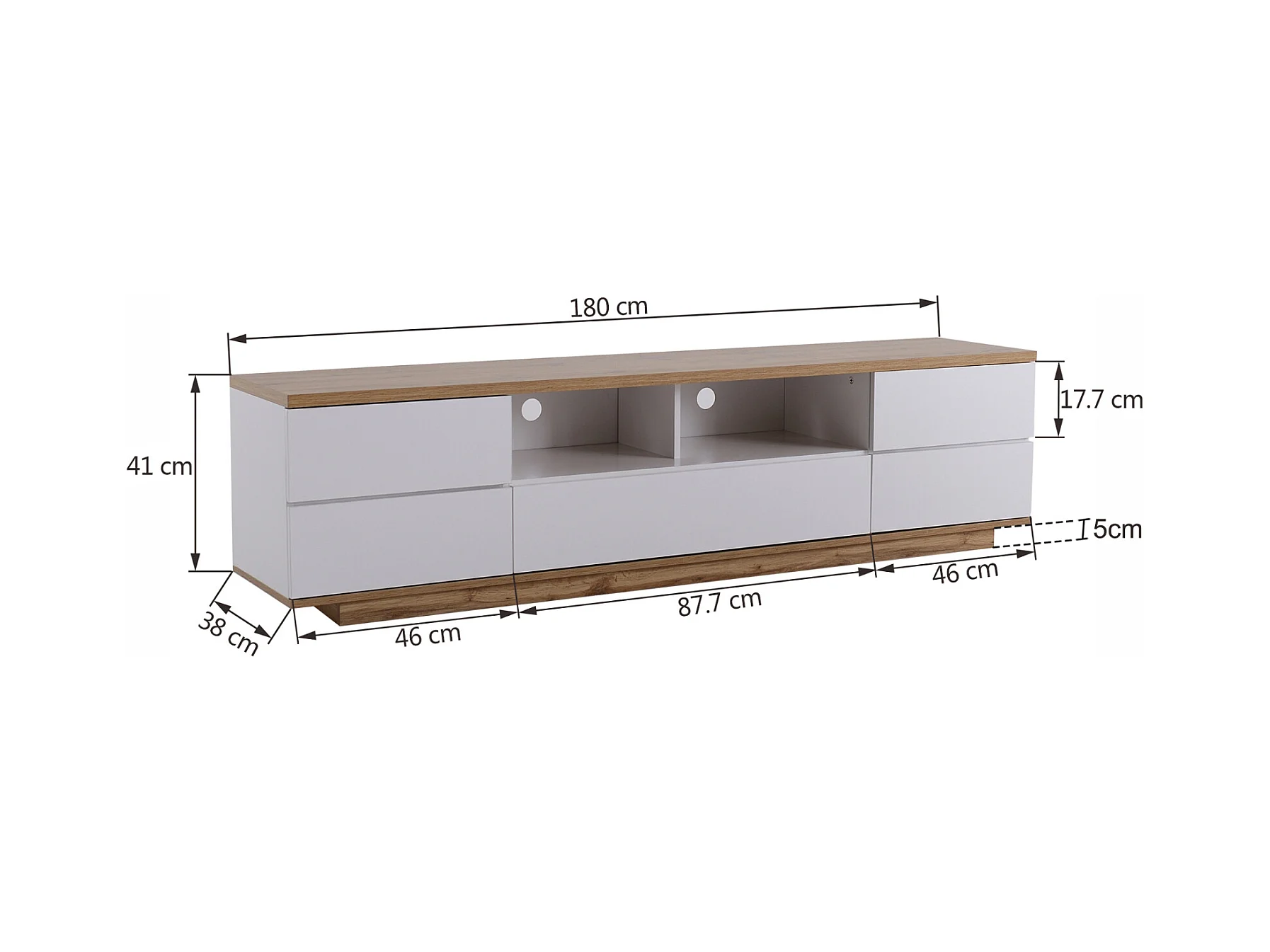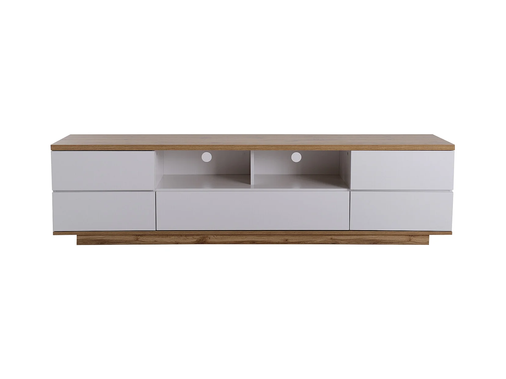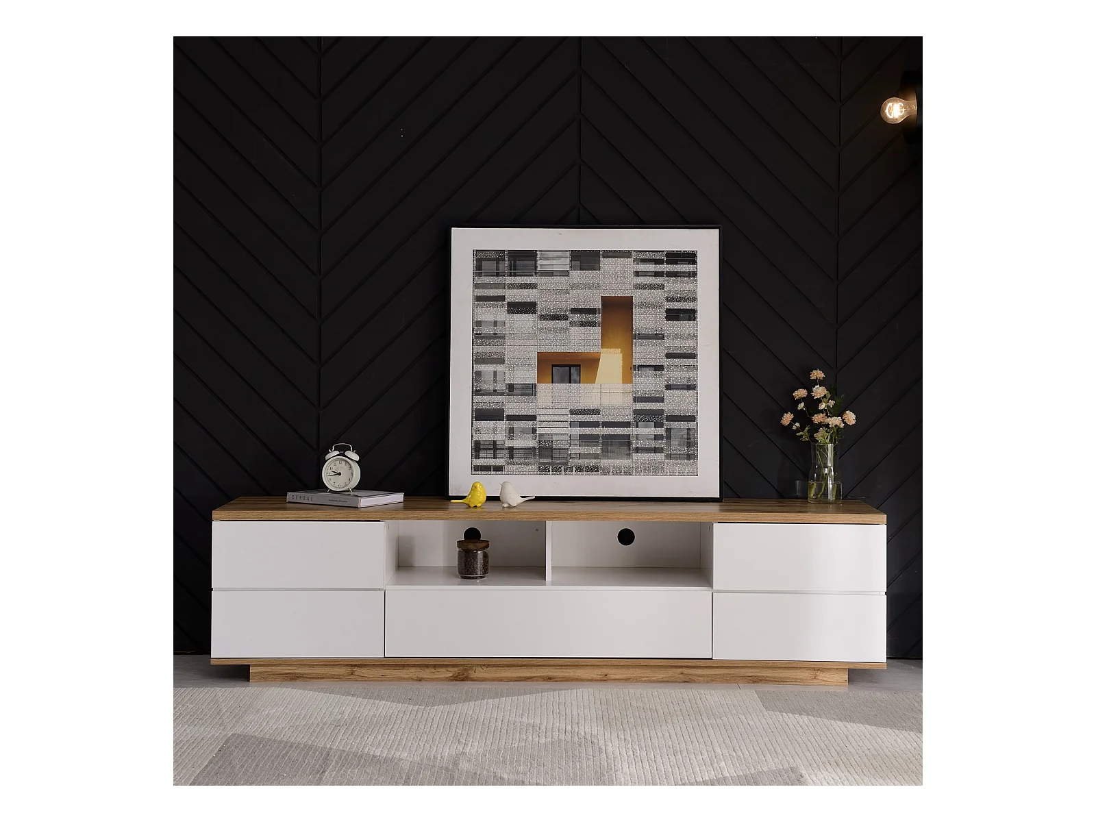 Mueble de TV moderno, aspecto madera y blanco, patas de metal negro, 2 cajones y puertas, 180 x 38 x 50 cm