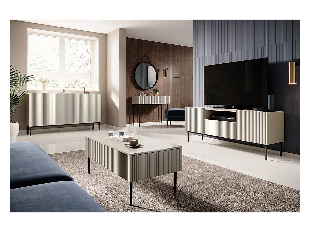 Mueble TV con 2 puertas abatibles y 1 cajón de cashmere con pie negro 200x45 cm