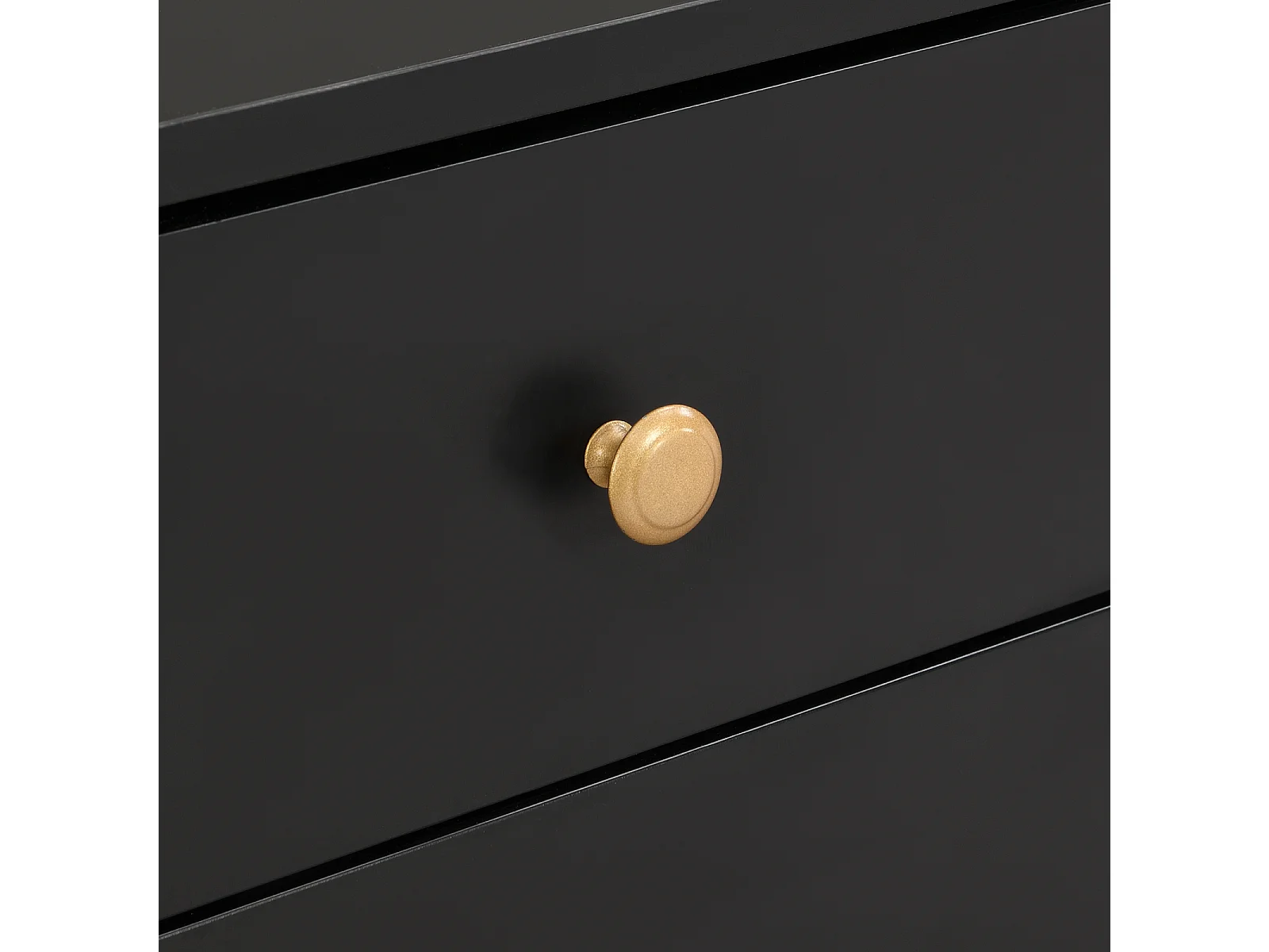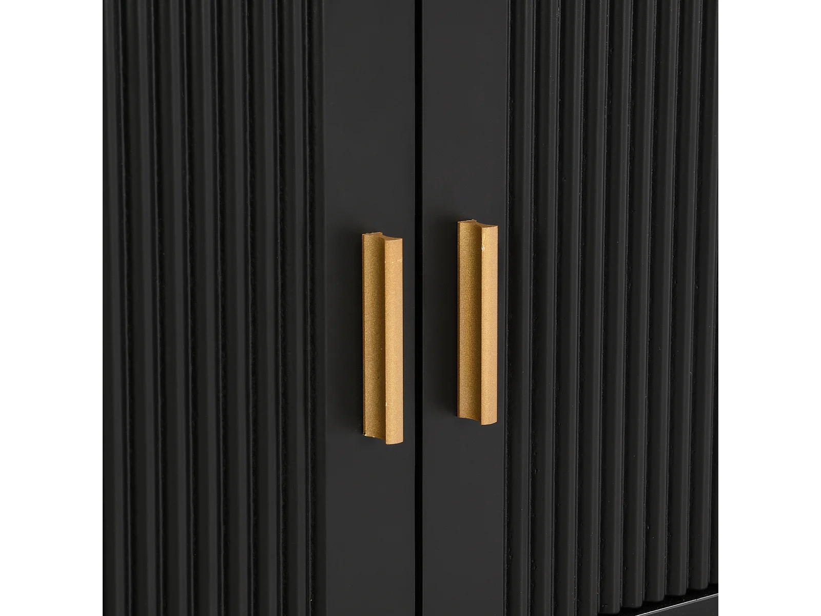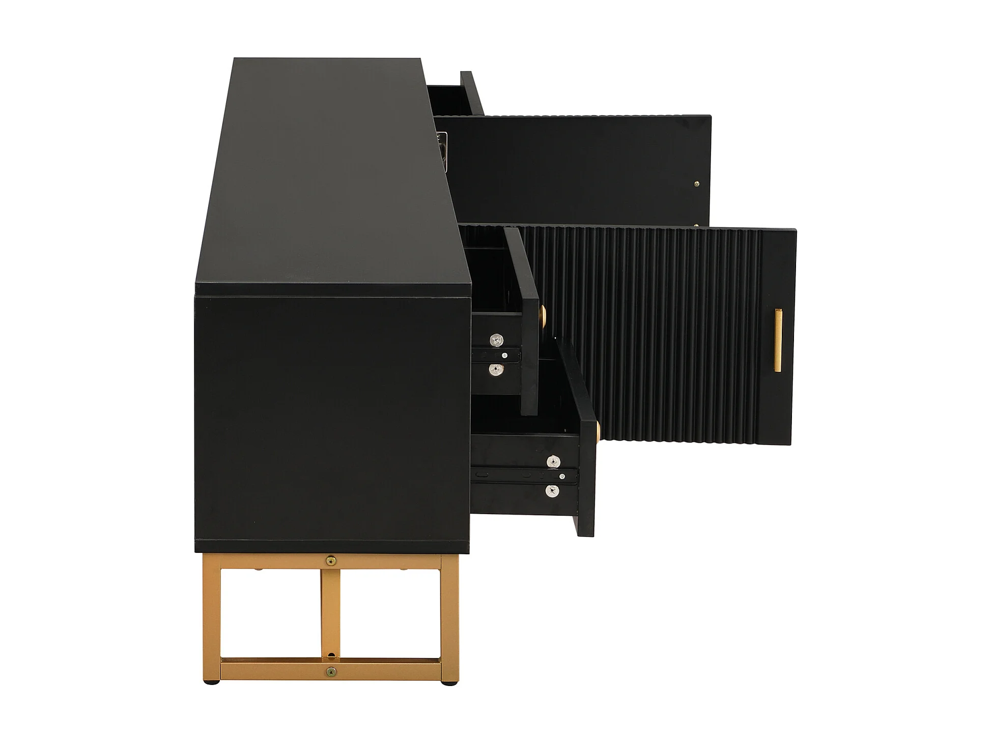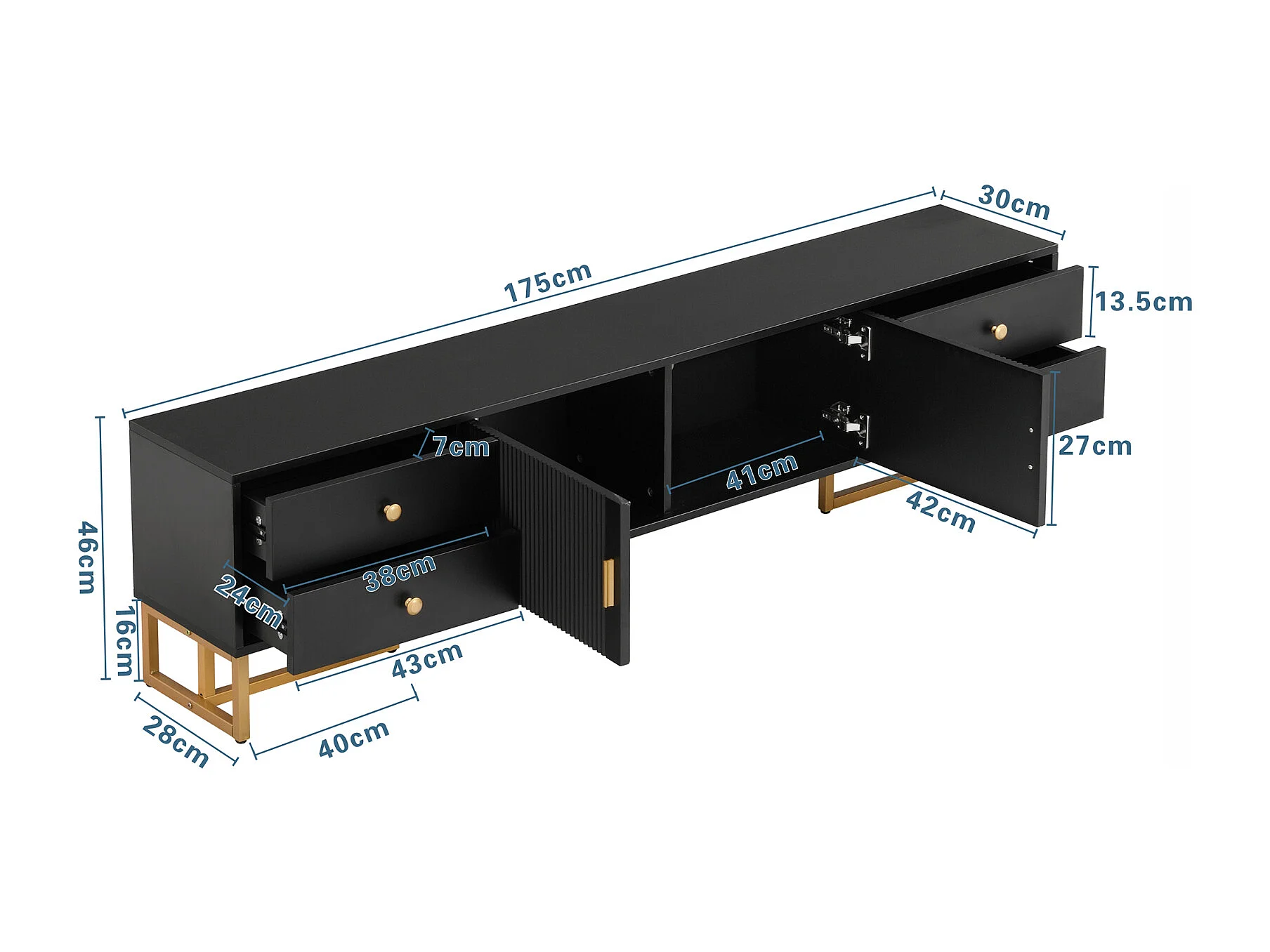 Mueble TV con almacenaje, 2 puertas y 4 cajones, mueble TV bajo, patas y tiradores dorados, color negro