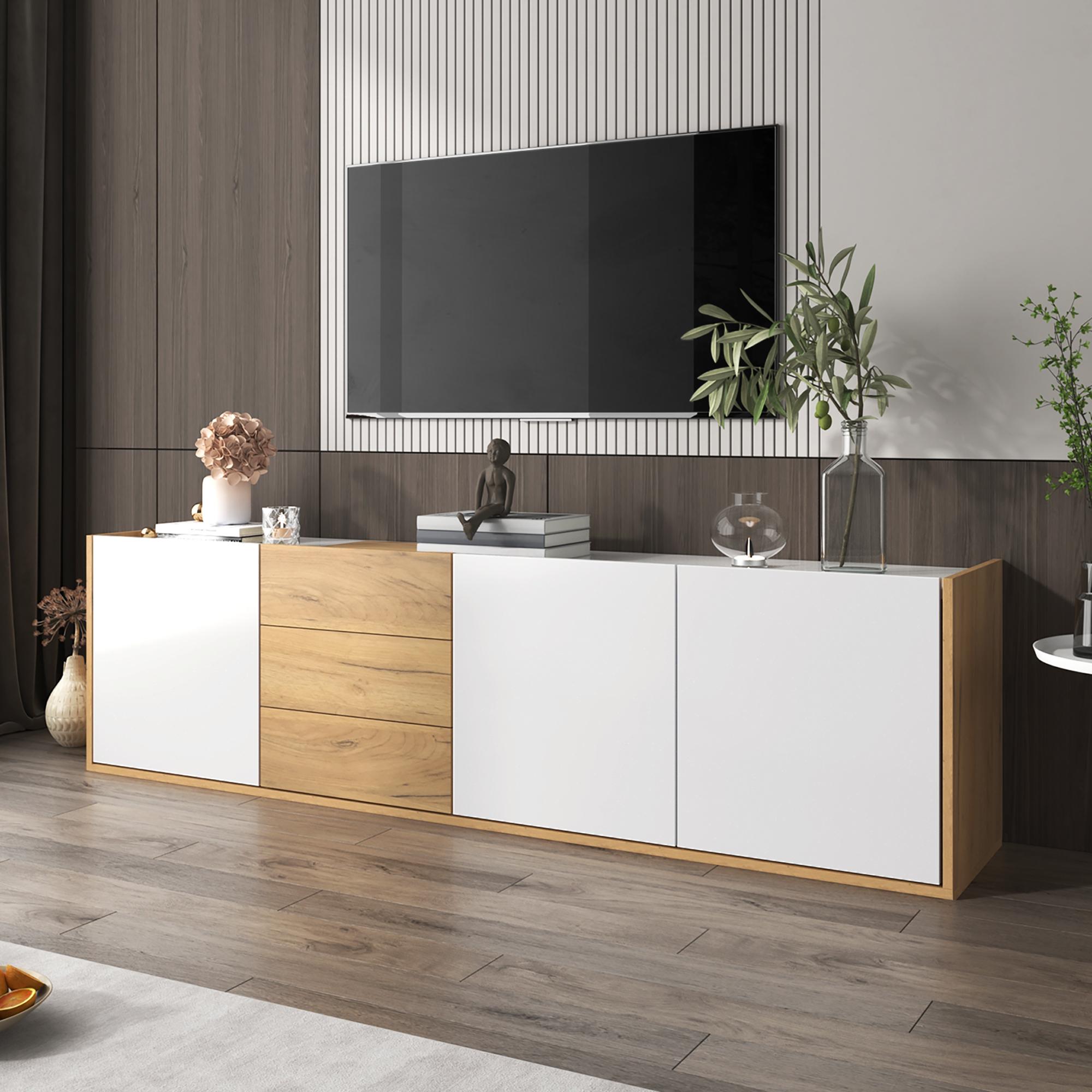 Mueble TV de 172 cm en MDF blanco y madera con cajones y estantes regulables