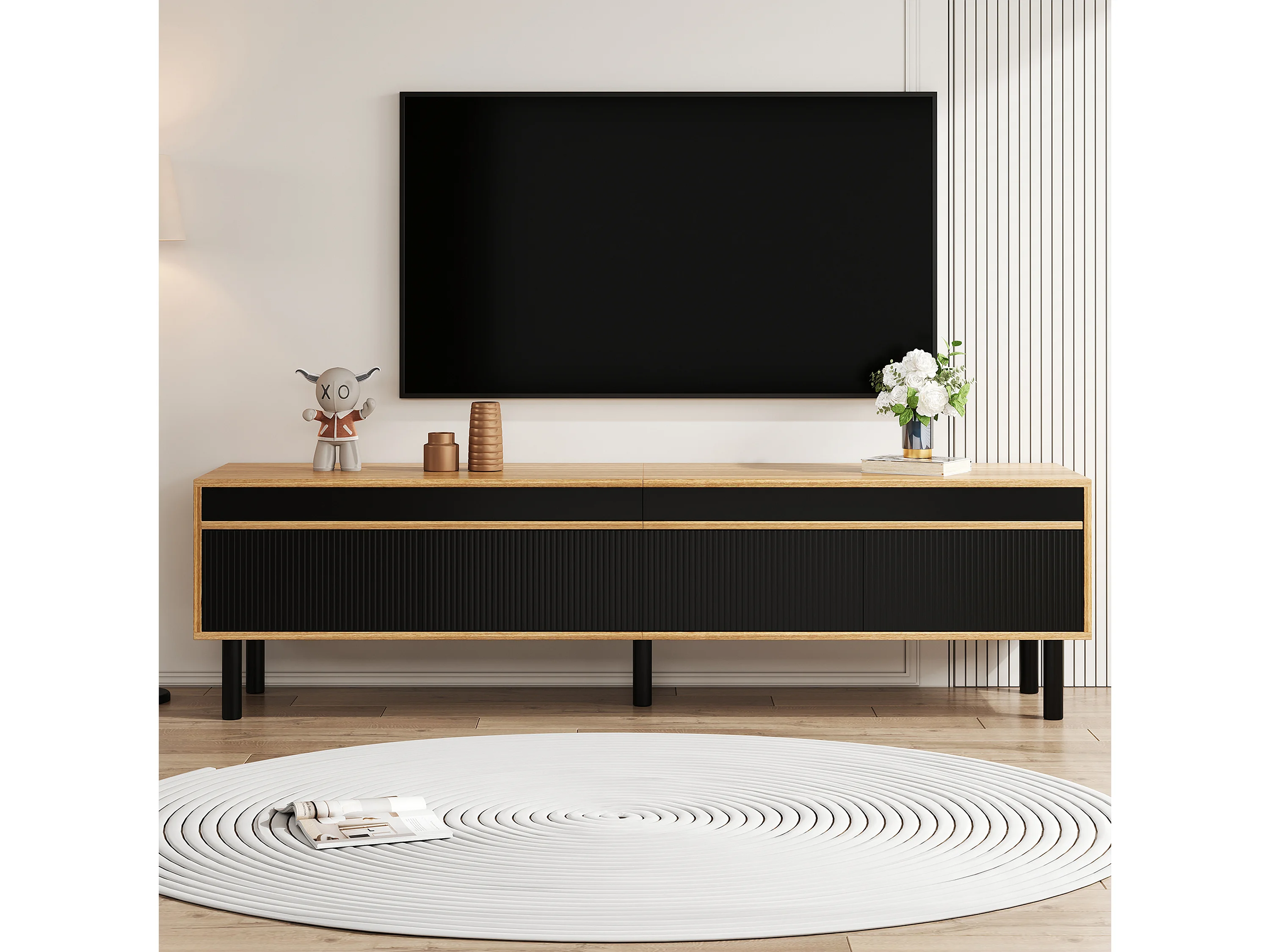 Mueble TV de 3 puertas a rayas, diseño elegante, tablero de partículas, color negro y madera natural (170x38x47cm)