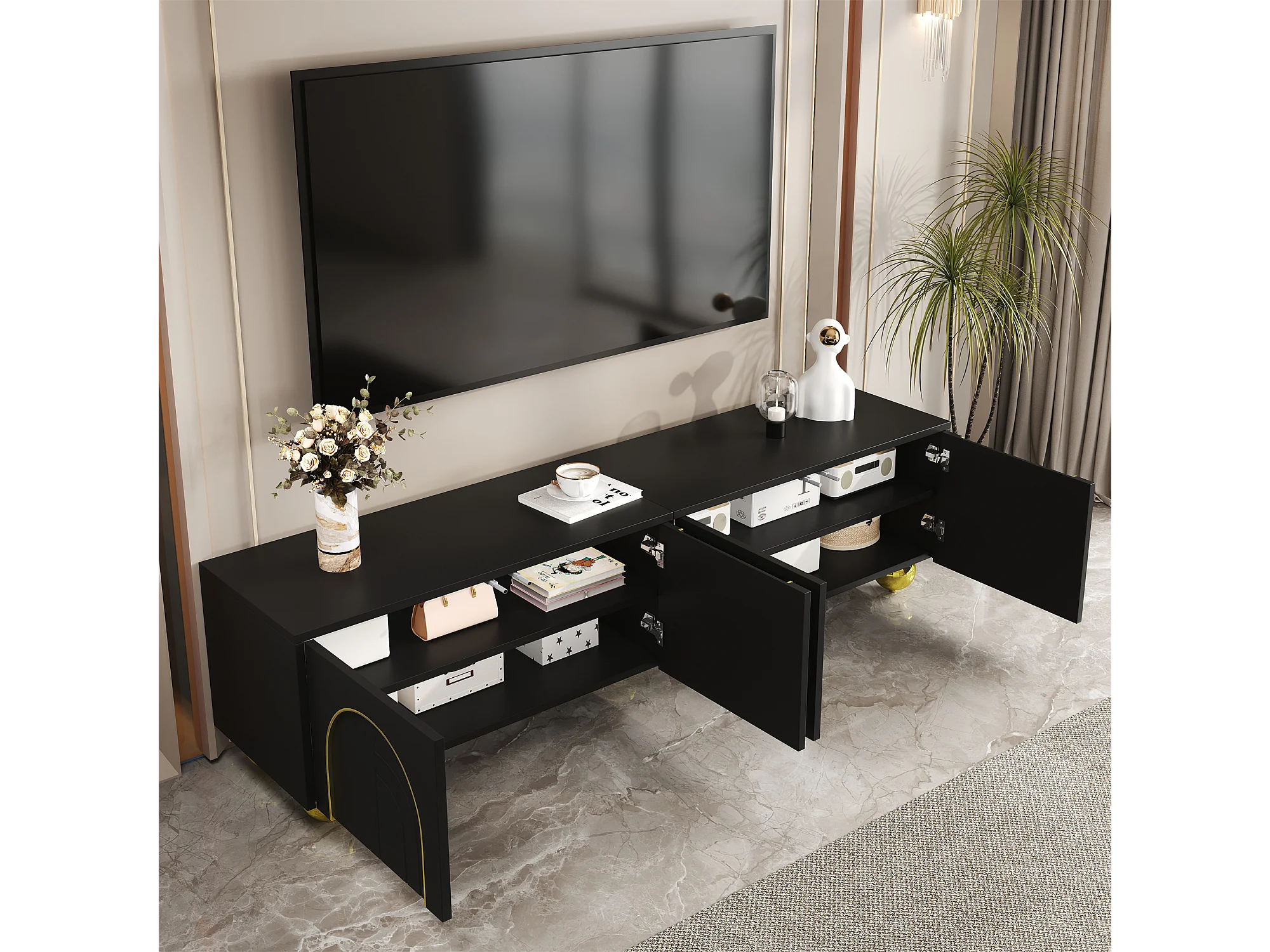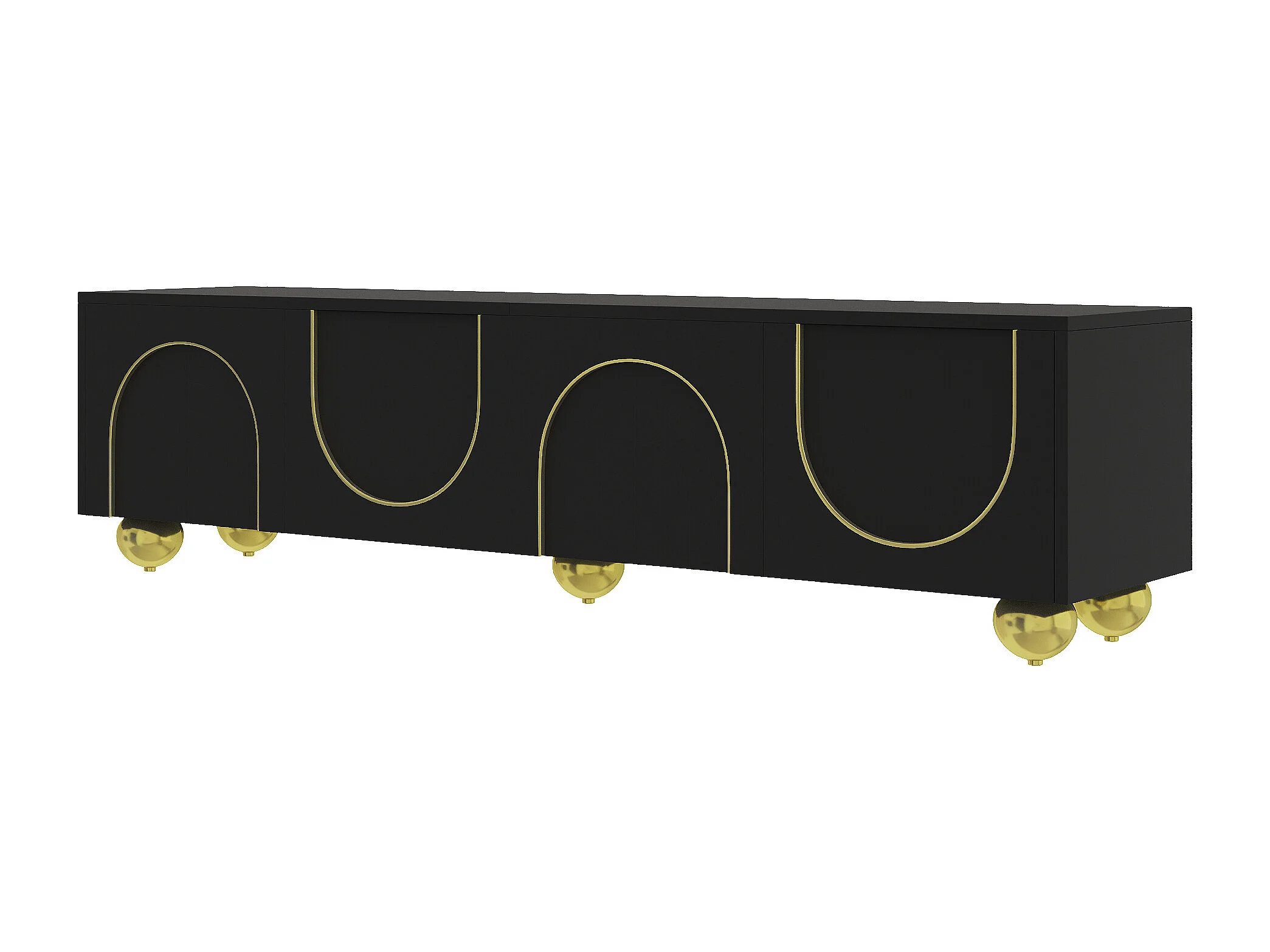 Mueble TV de MDF negro y dorado de 170 cm, 4 puertas con estantes y patas redondas para salón