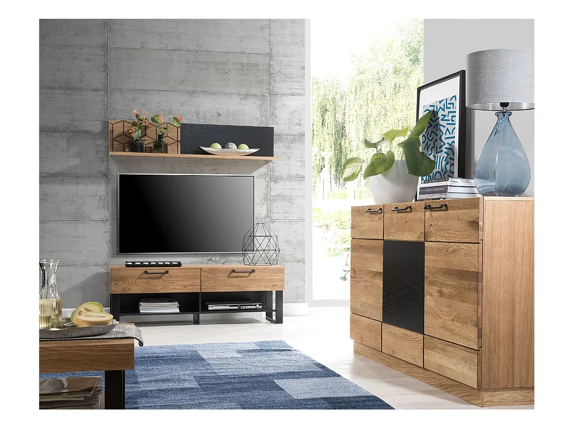 Mueble TV en madera de roble miel y acero negro 2 cajones Mazora 135 cm