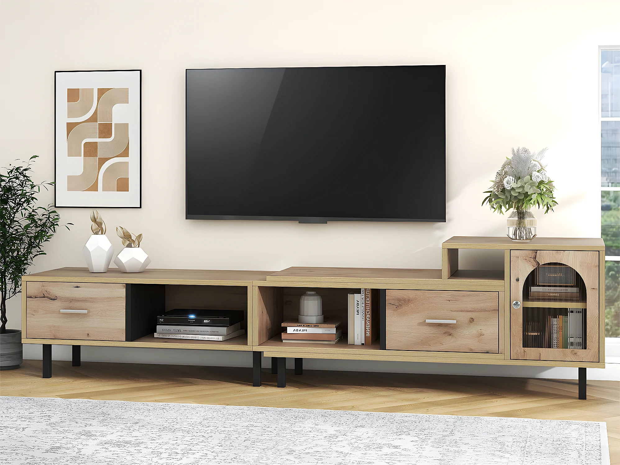 Mueble TV extensible de madera con 4 compartimentos 2 cajones 1 puerta de cristal - longitud 200 a 278 cm - Natural