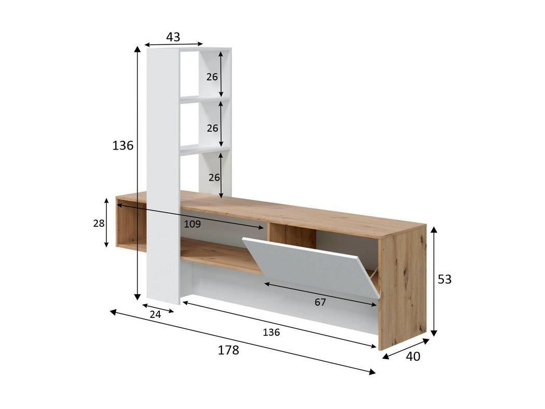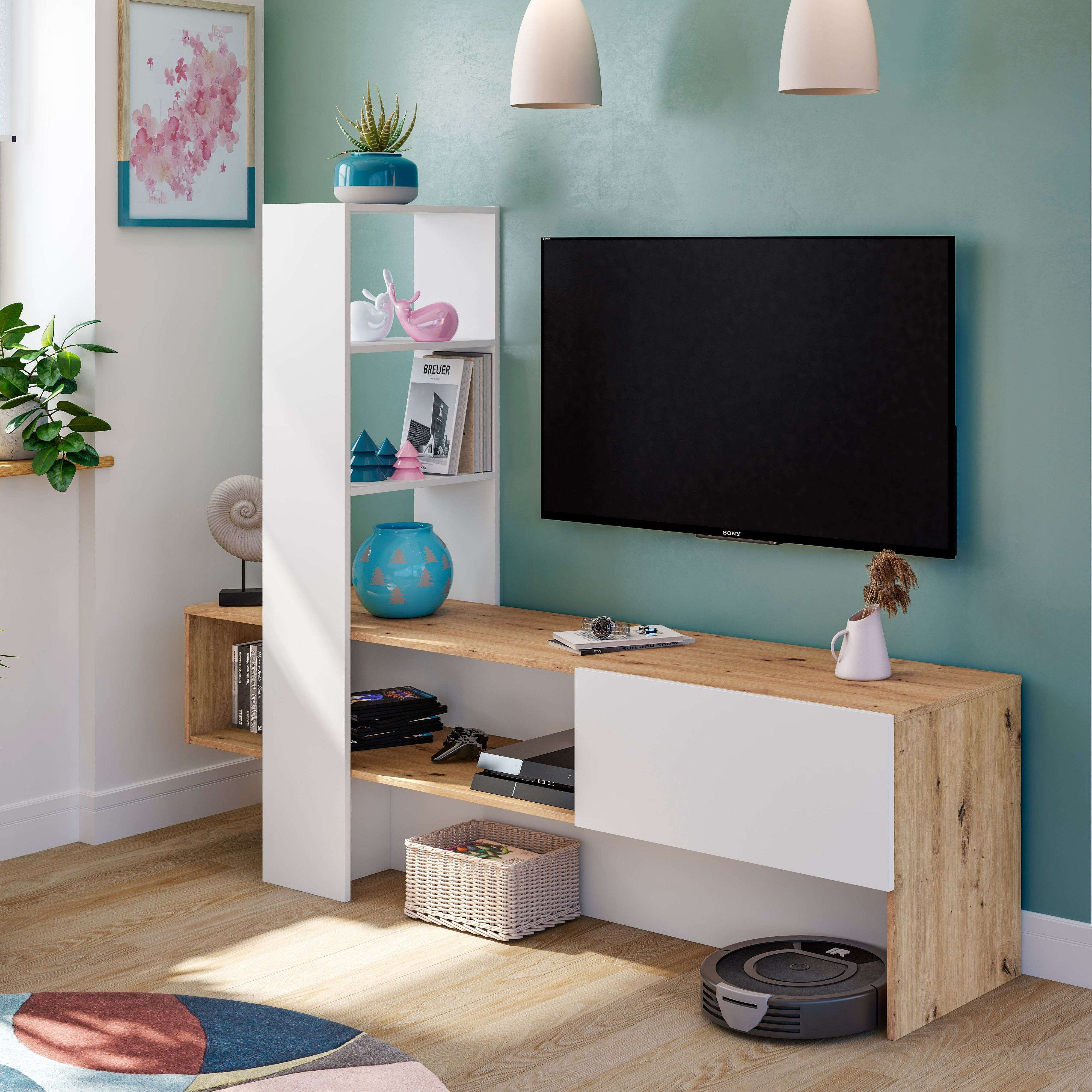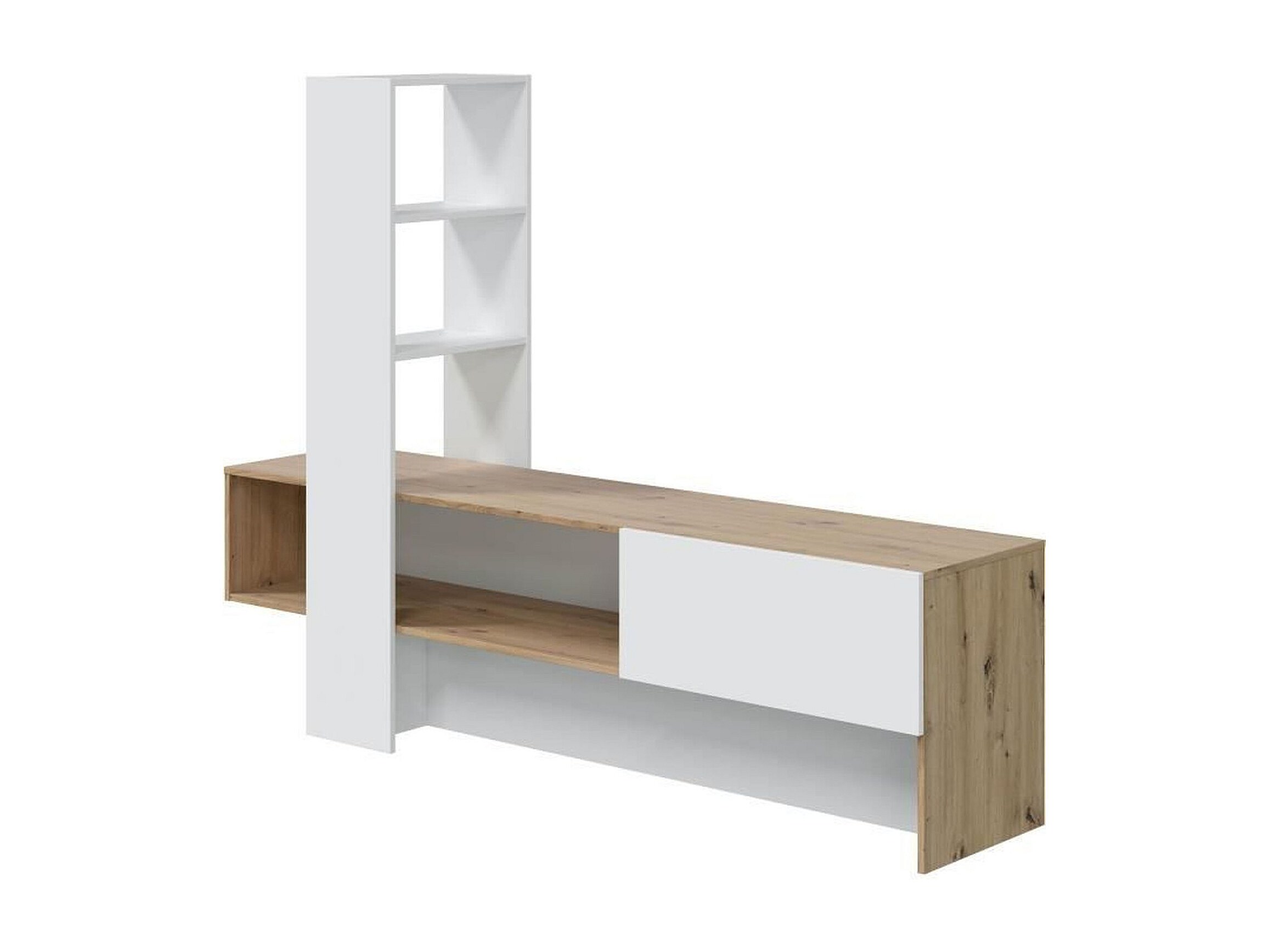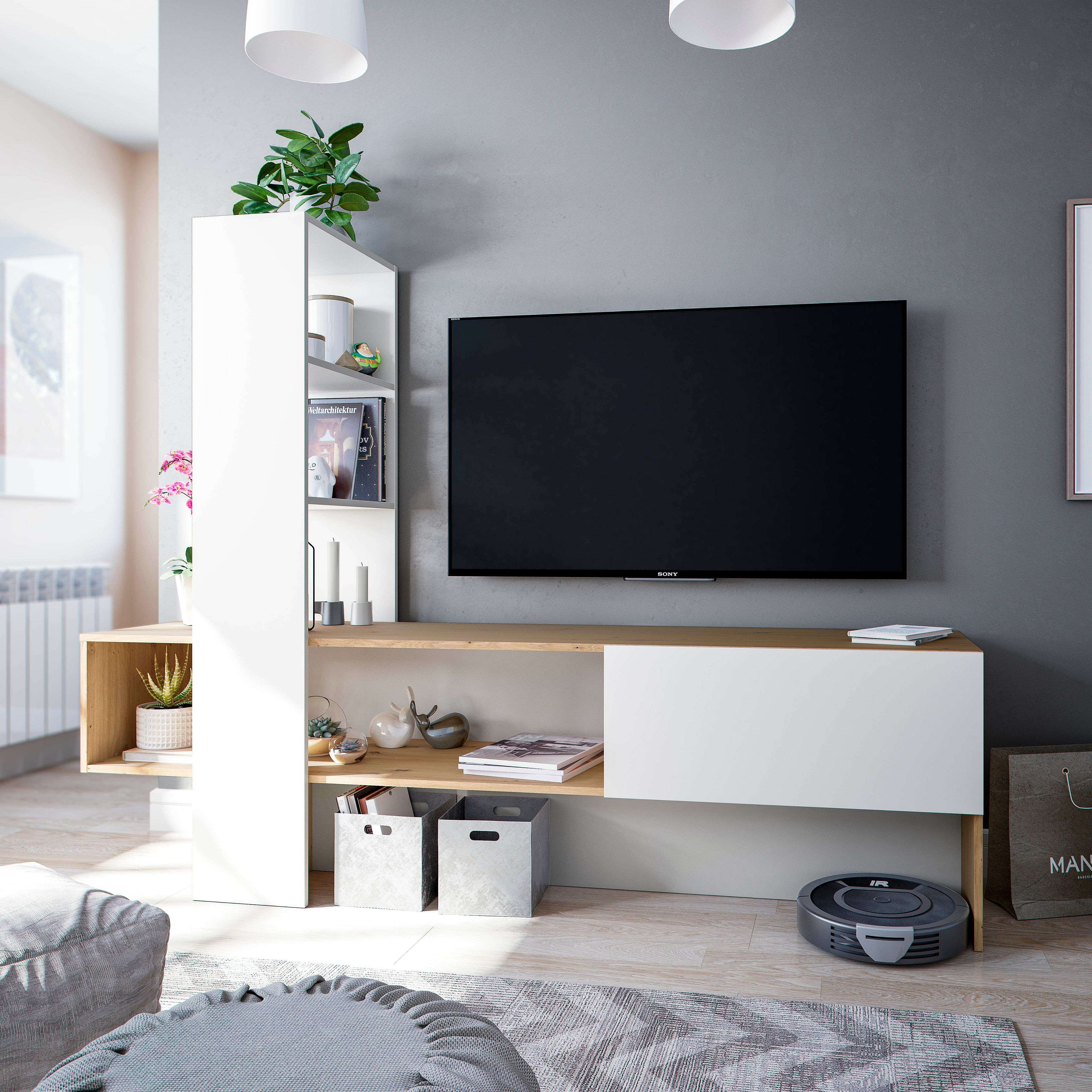 Mueble TV LISS - Melamina blanco y roble - 1 puerta abatible + 1 estante - 178 x 43 x 136 cm