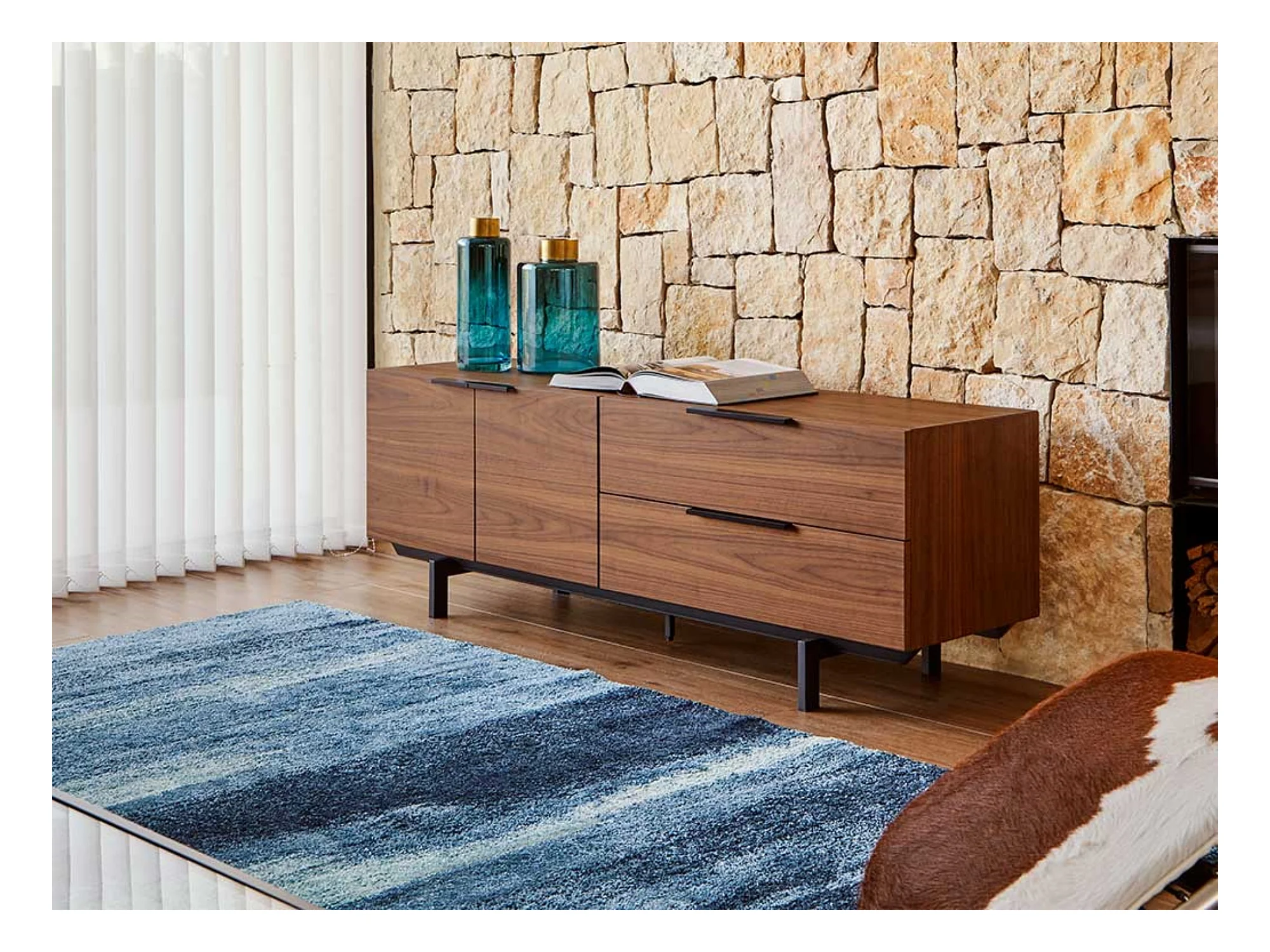 Mueble TV moderno 4 puertas nogal con patas de acero negro kalia 165 cm