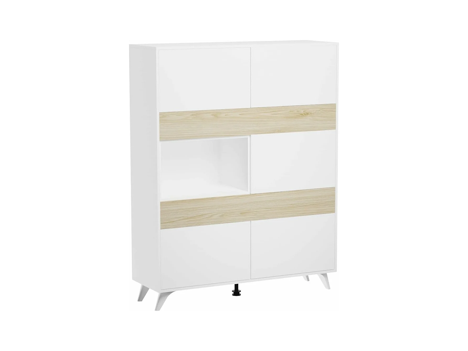 Aparador alto con colección KILES de dos puertas. Color blanco y roble. Puerta de vidrio a la izquierda.