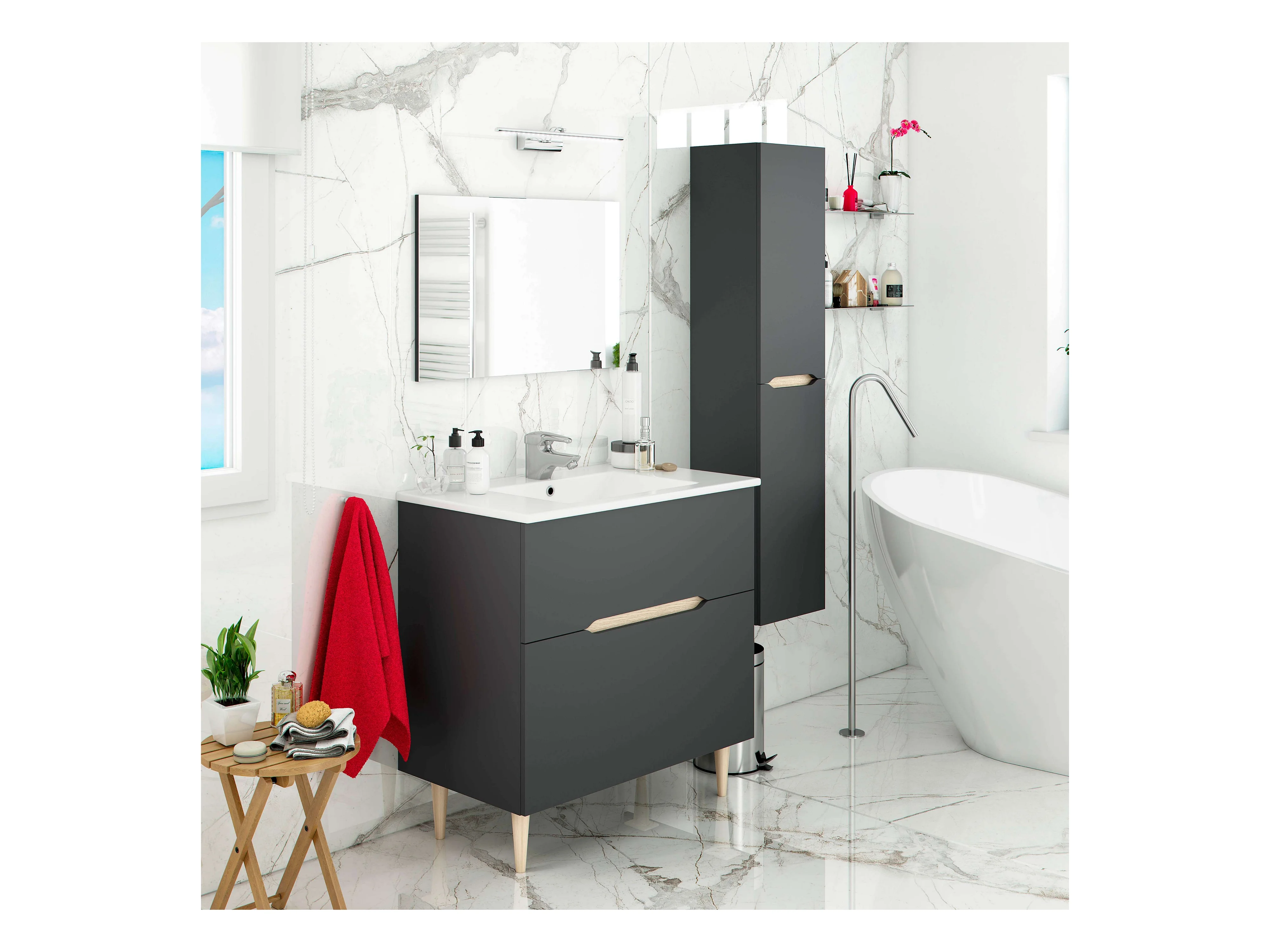 Mueble de baño de pie "Figi" de 80 cm de resina gris con lavabo gris y espejo rectangular con retroiluminación LED.