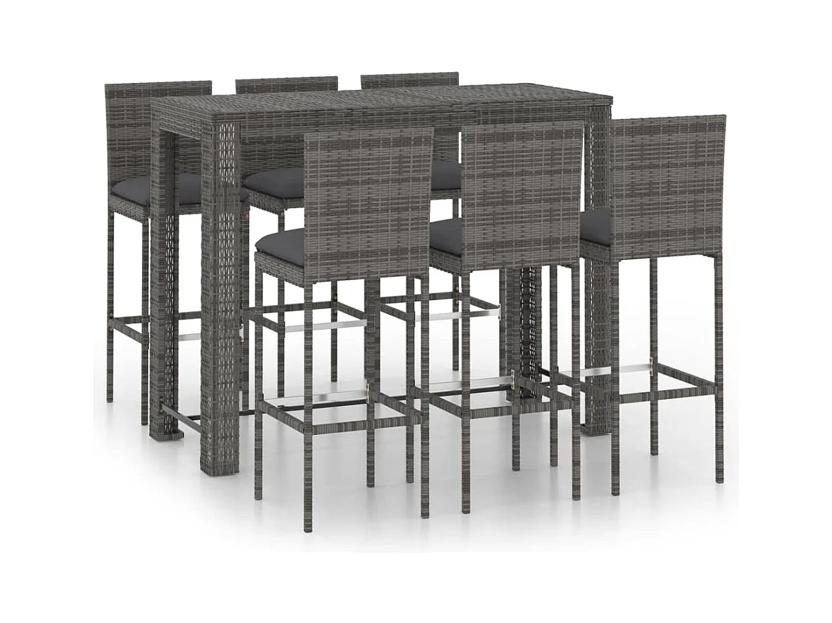 Set de muebles de bar de jardín 5 piezas y cojines ratán PE gris