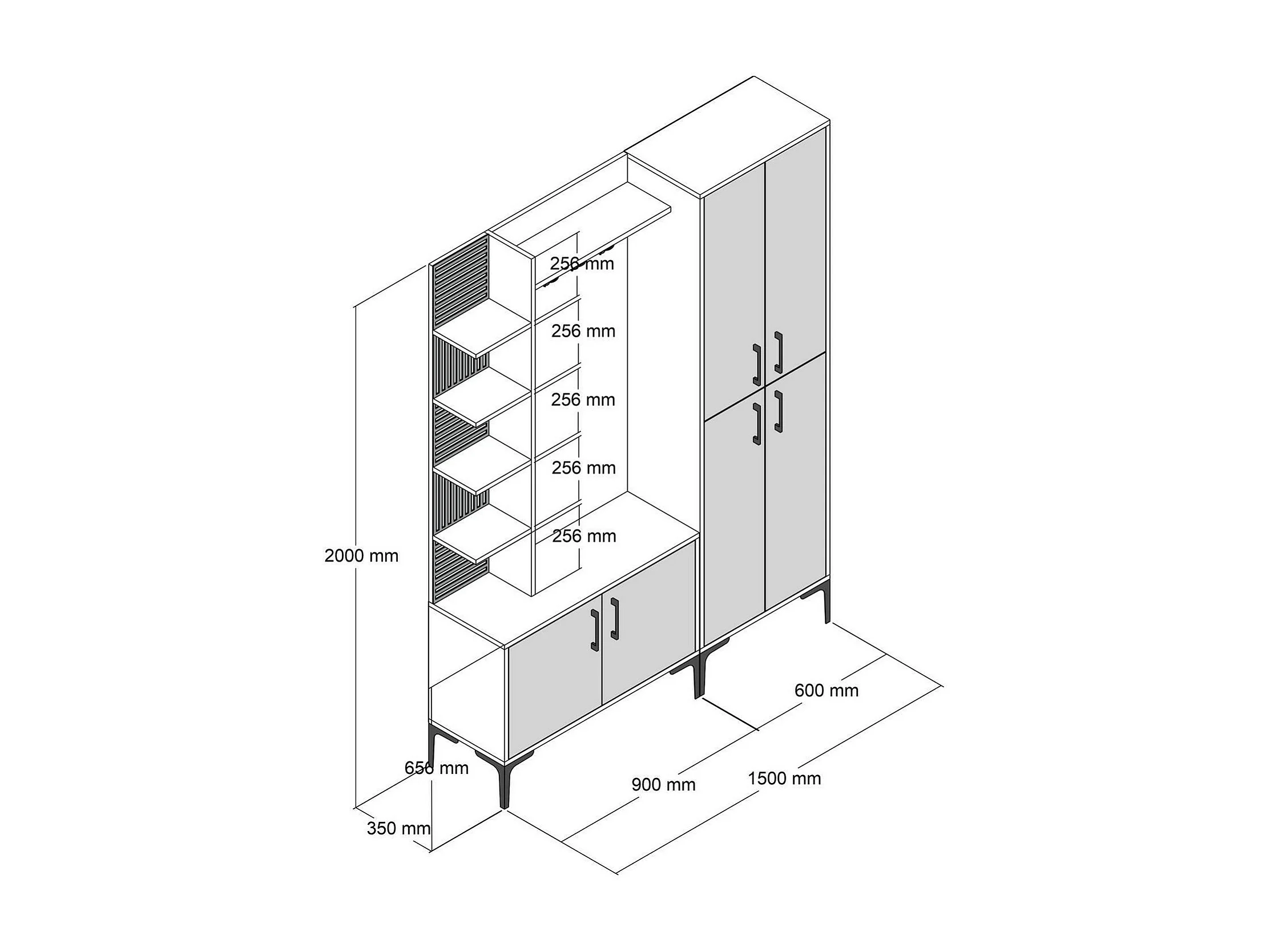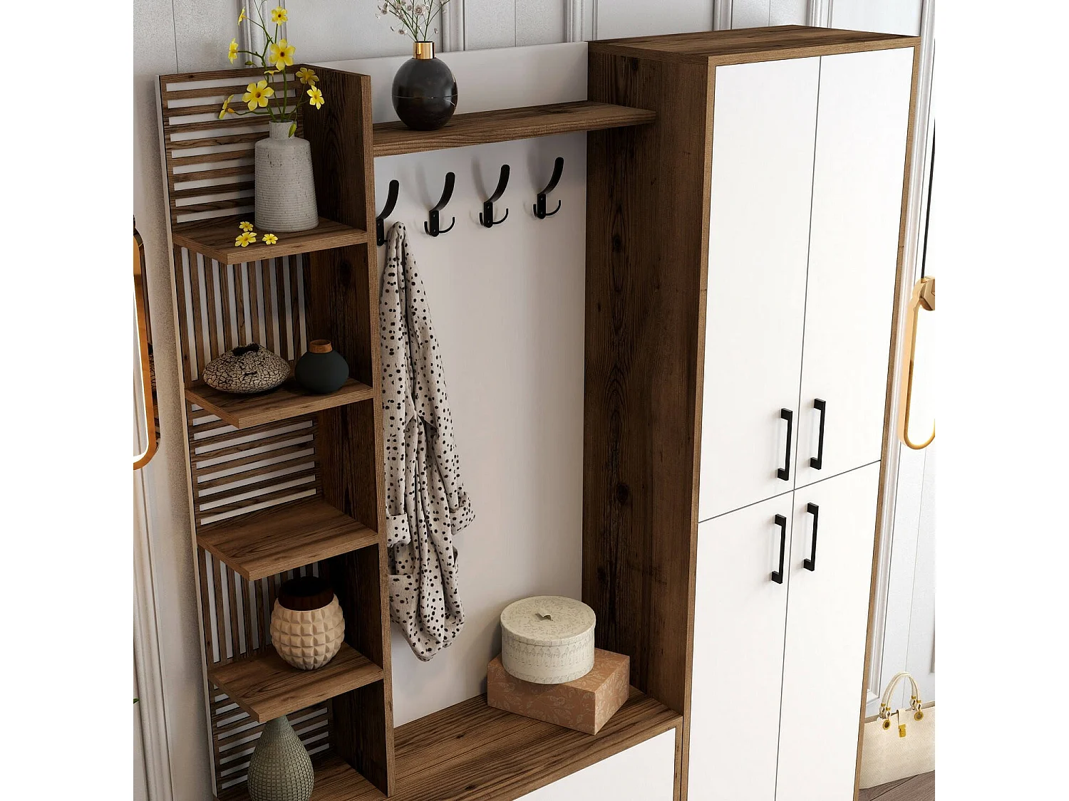 Muebles de entrada Dradunovi, Entrada para perchas, Composición para atrio, Consola de almacenamiento multifunción, 150x200 h35 cm, Nogal y Blanco