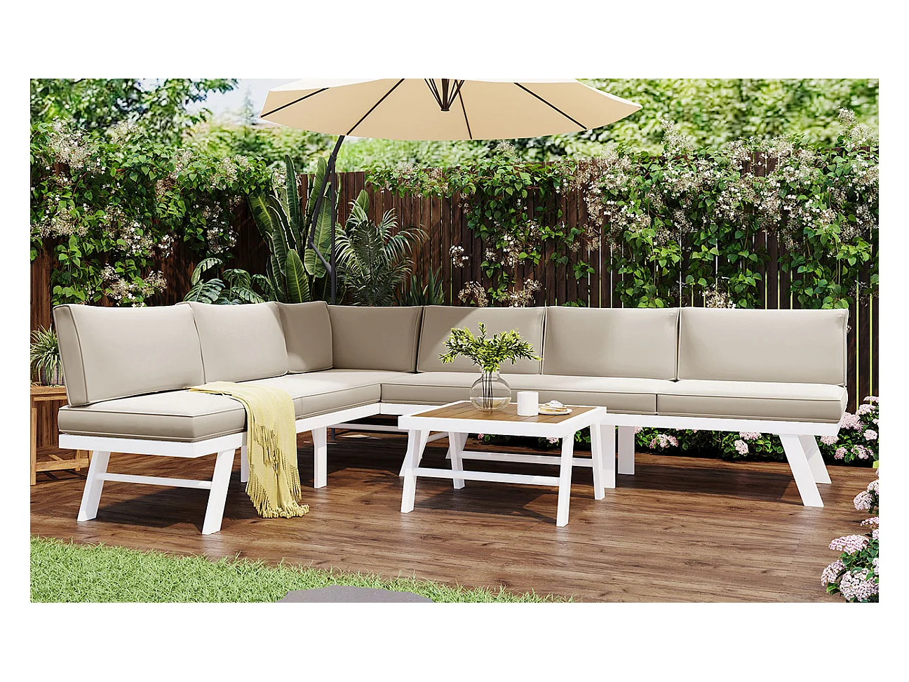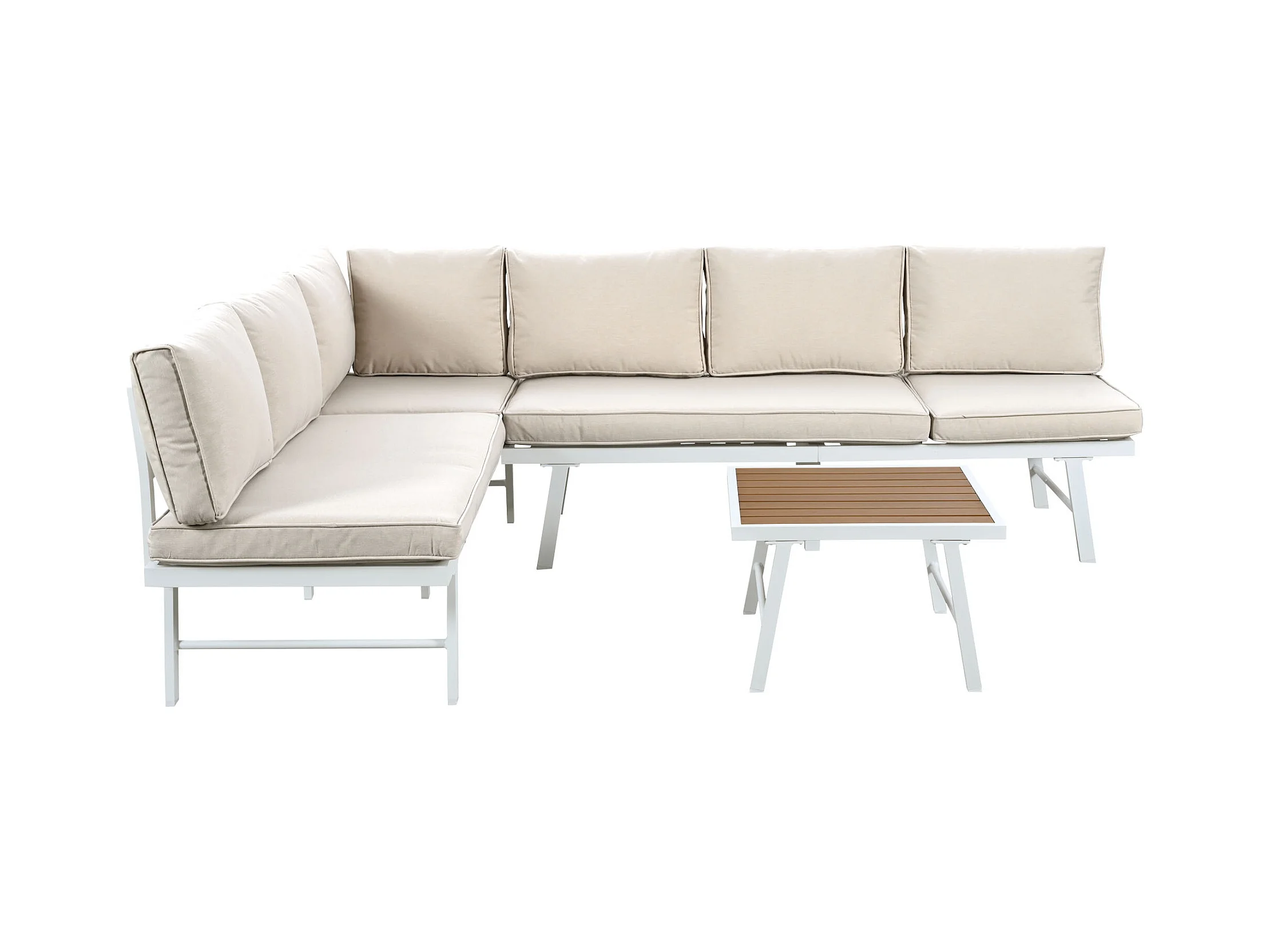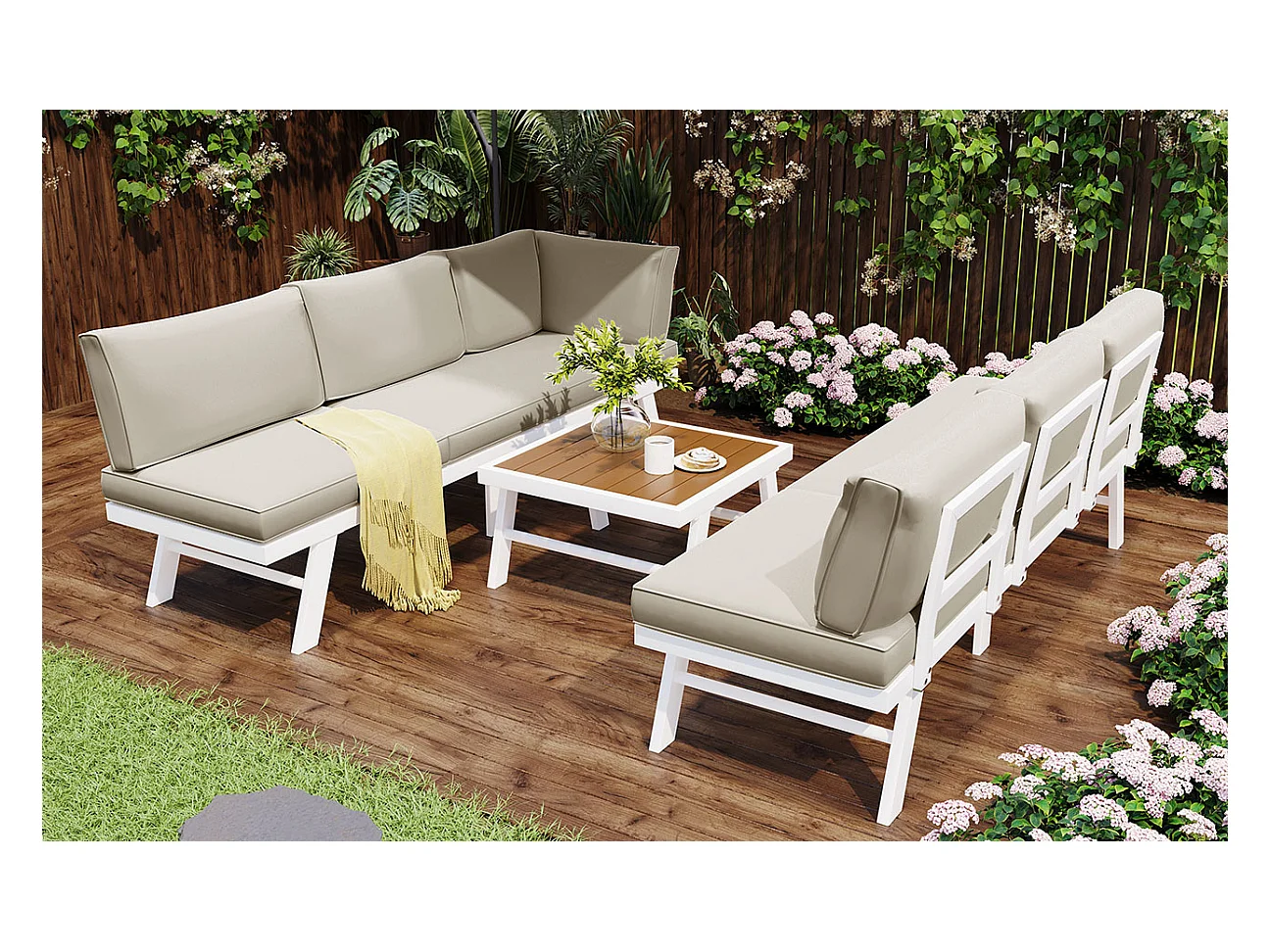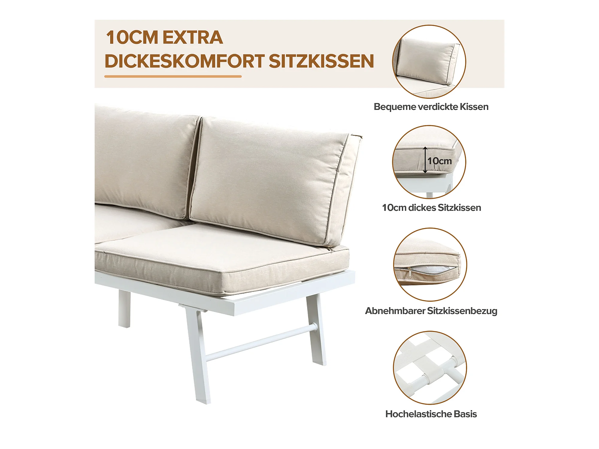 Muebles de jardín modulares de aluminio para 5-6 personas. - 2 sofás esquineros, 1 mesa de centro, incluidos 7 cojines beige y 4 cojines de asiento beige - Blanco