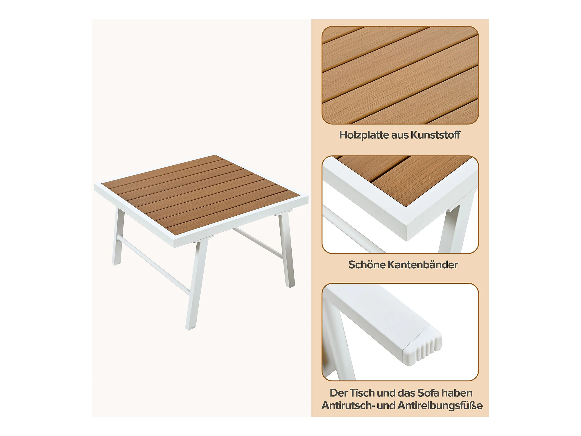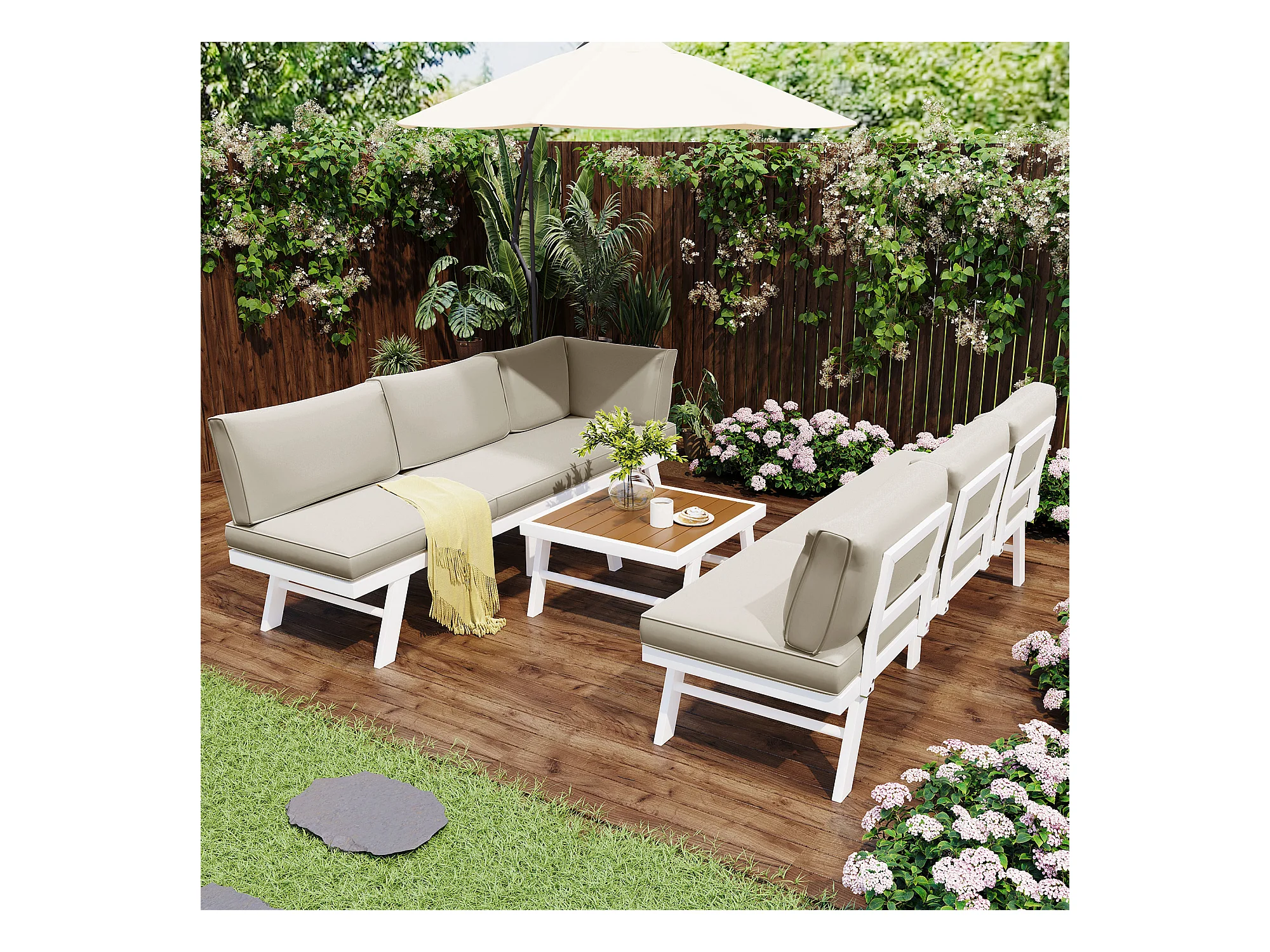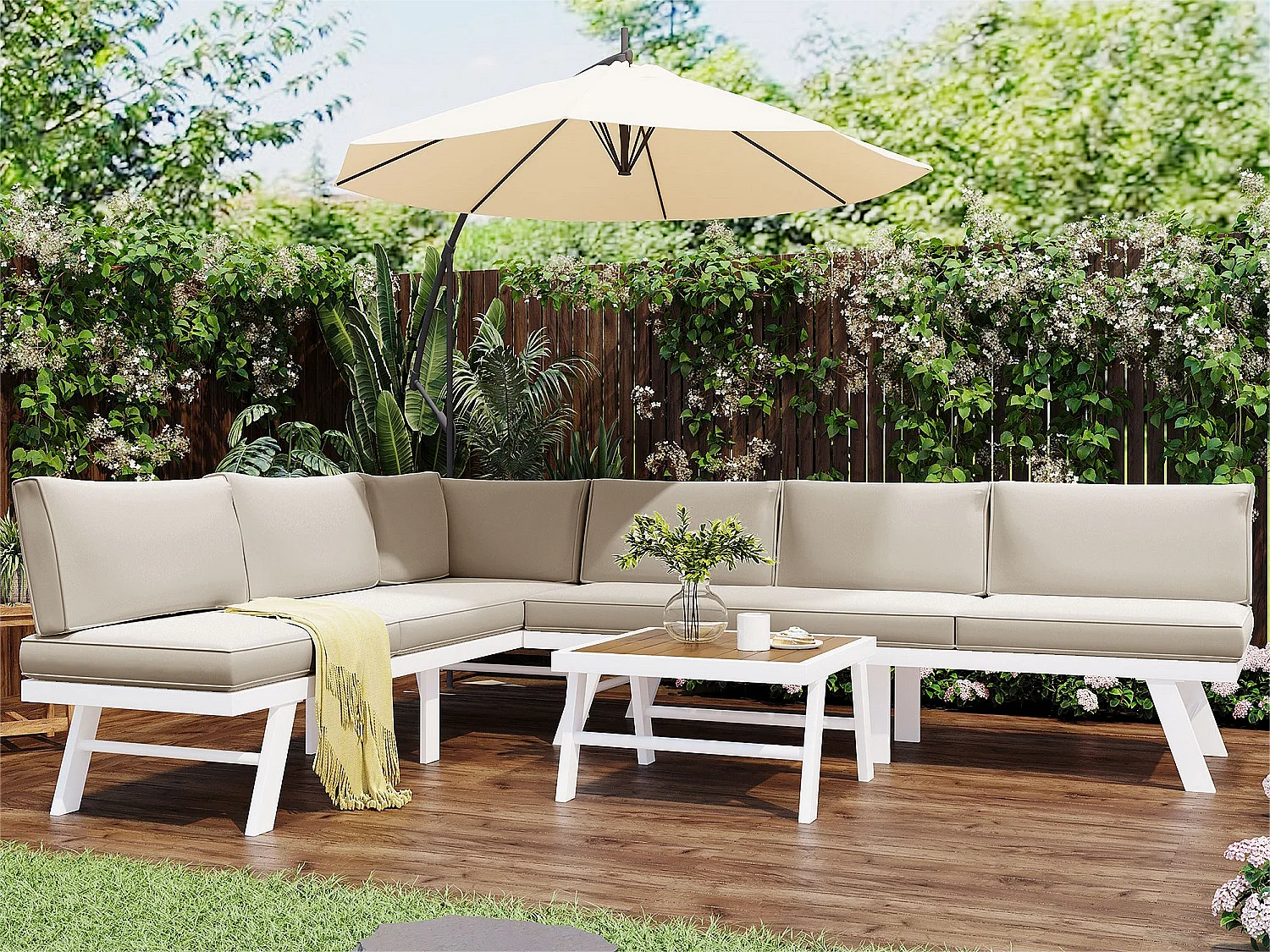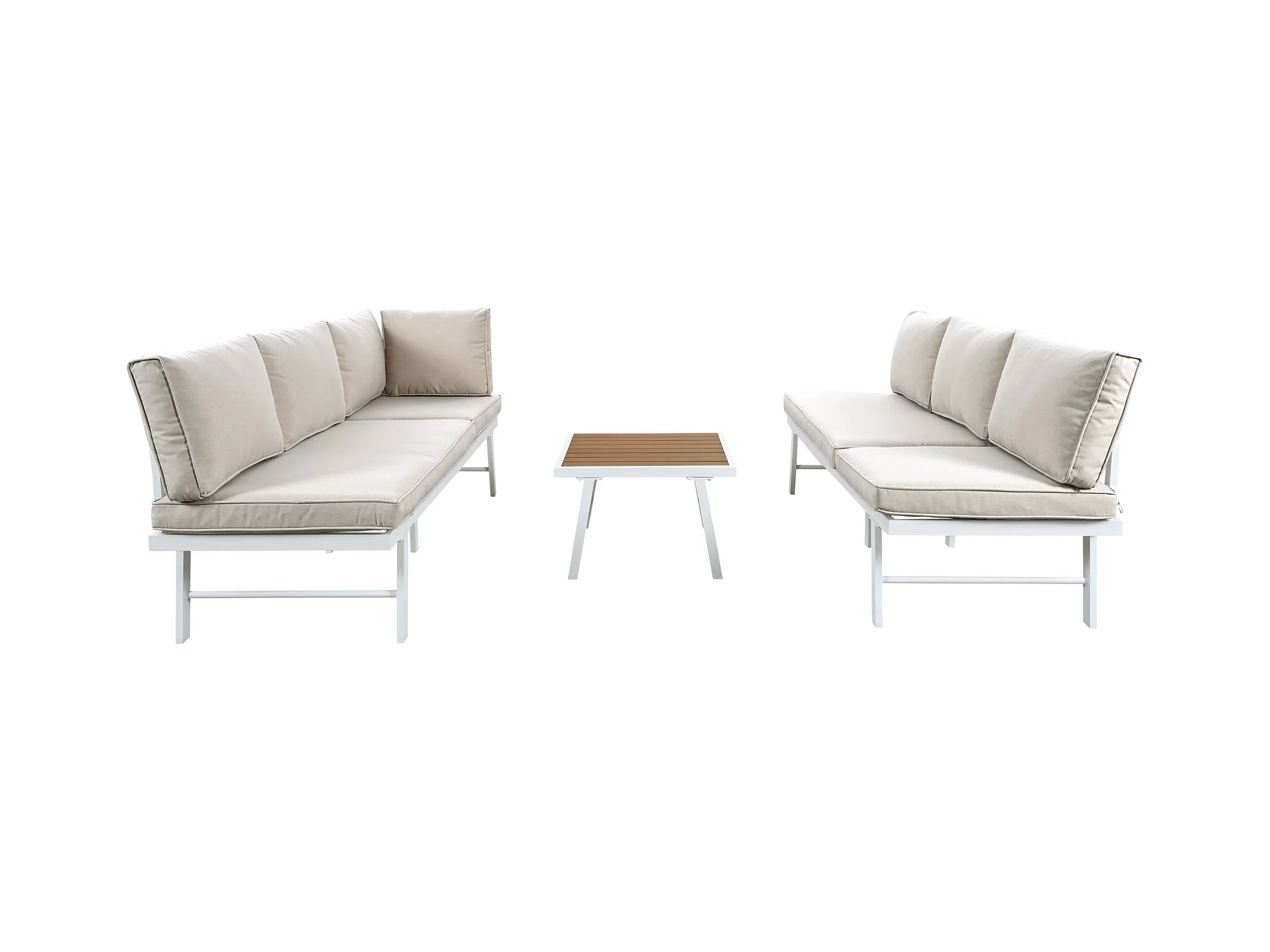 Muebles de jardín modulares de aluminio para 5-6 personas. - 2 sofás esquineros, 1 mesa de centro, incluidos 7 cojines beige y 4 cojines de asiento beige - Blanco