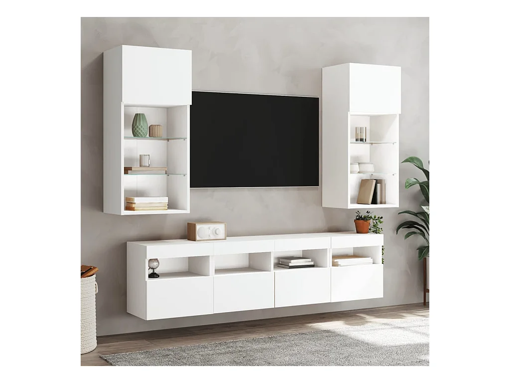 Muebles de pared para TV con LED, 5 piezas, madera de ingeniería blanca