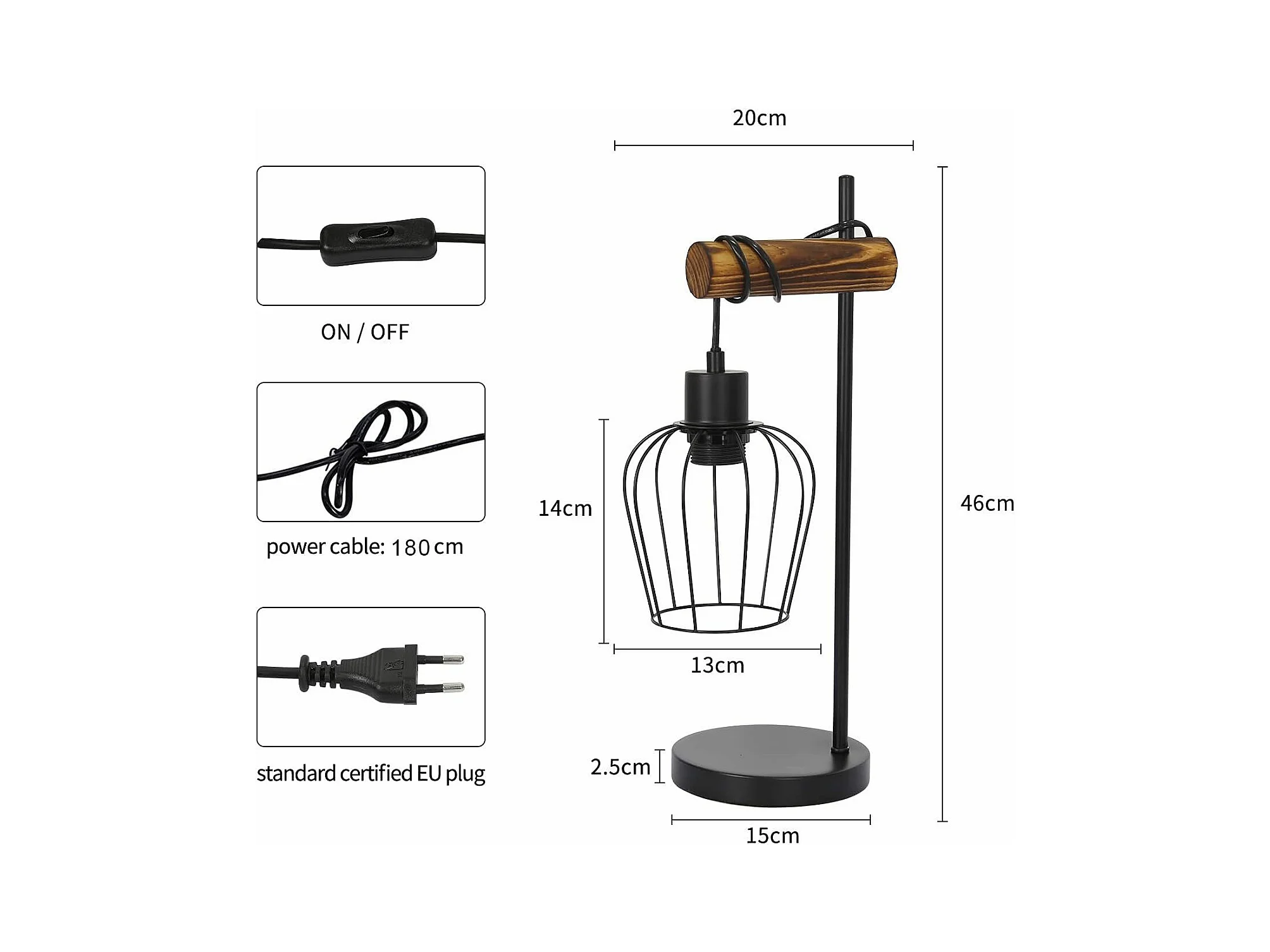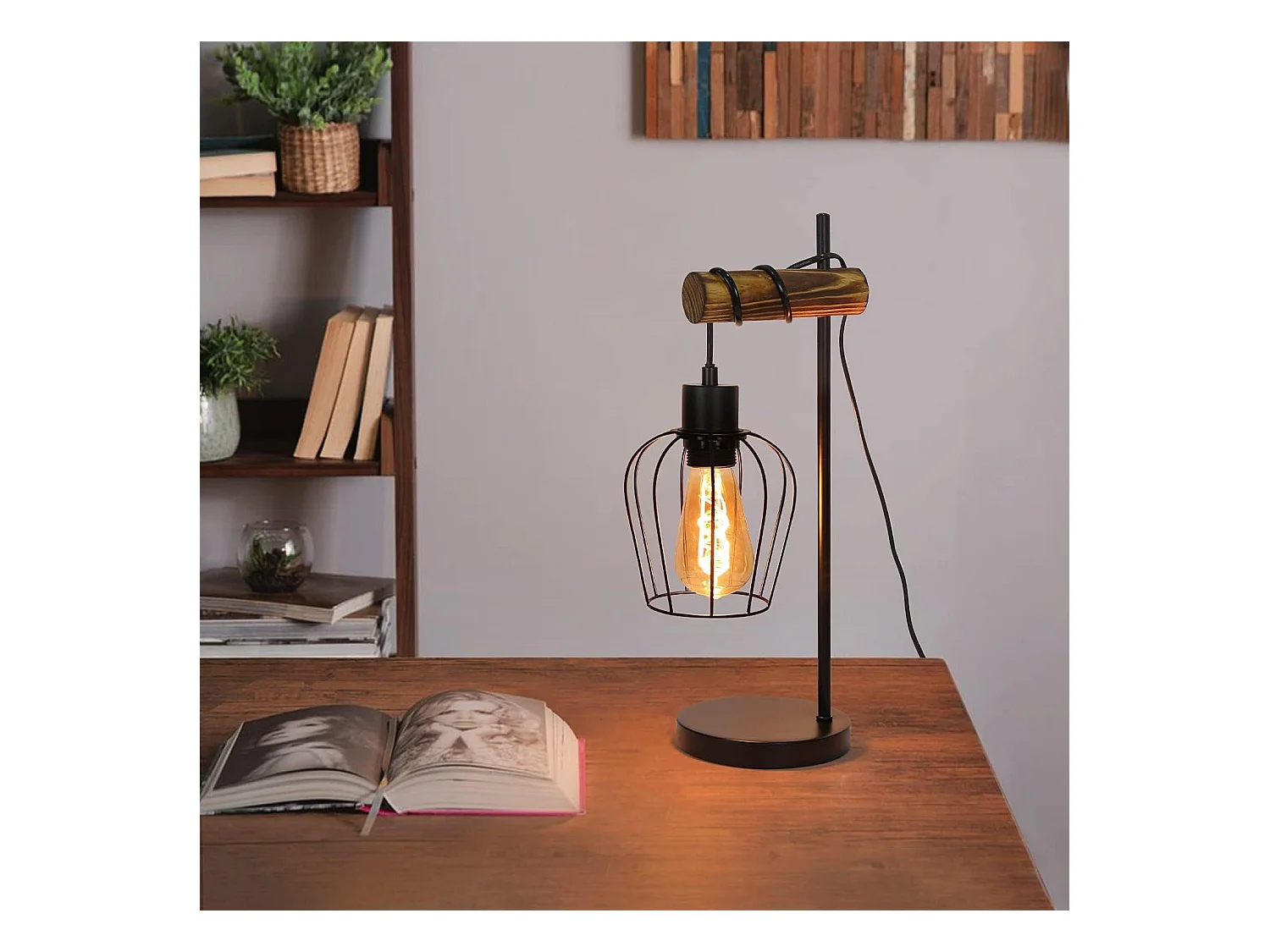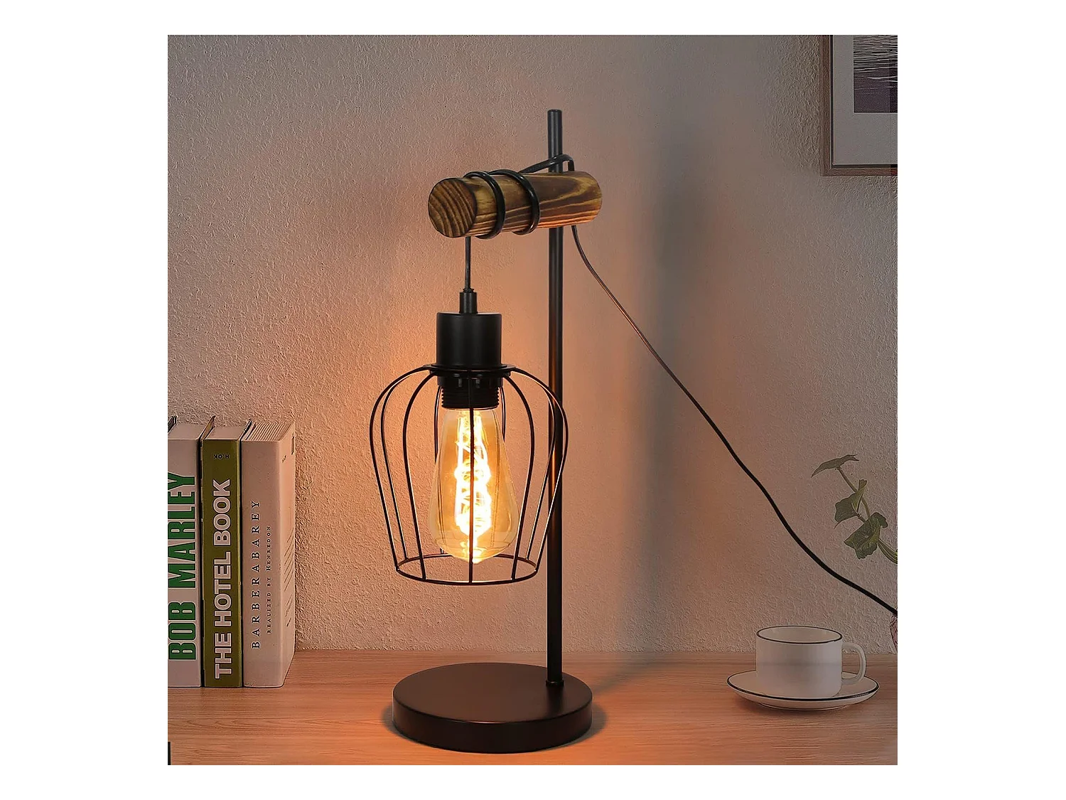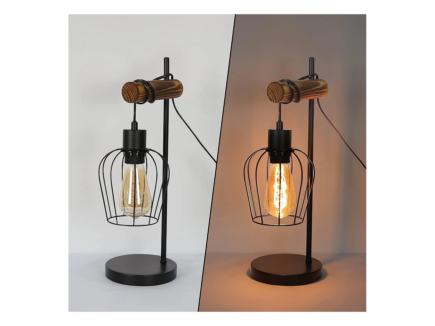 NETTLIFE Lámpara mesa retro, Noche vintage, 1 llama, Metal y madera, Negro, Casquillo E27, Interruptor incl., Bombillas no incl.