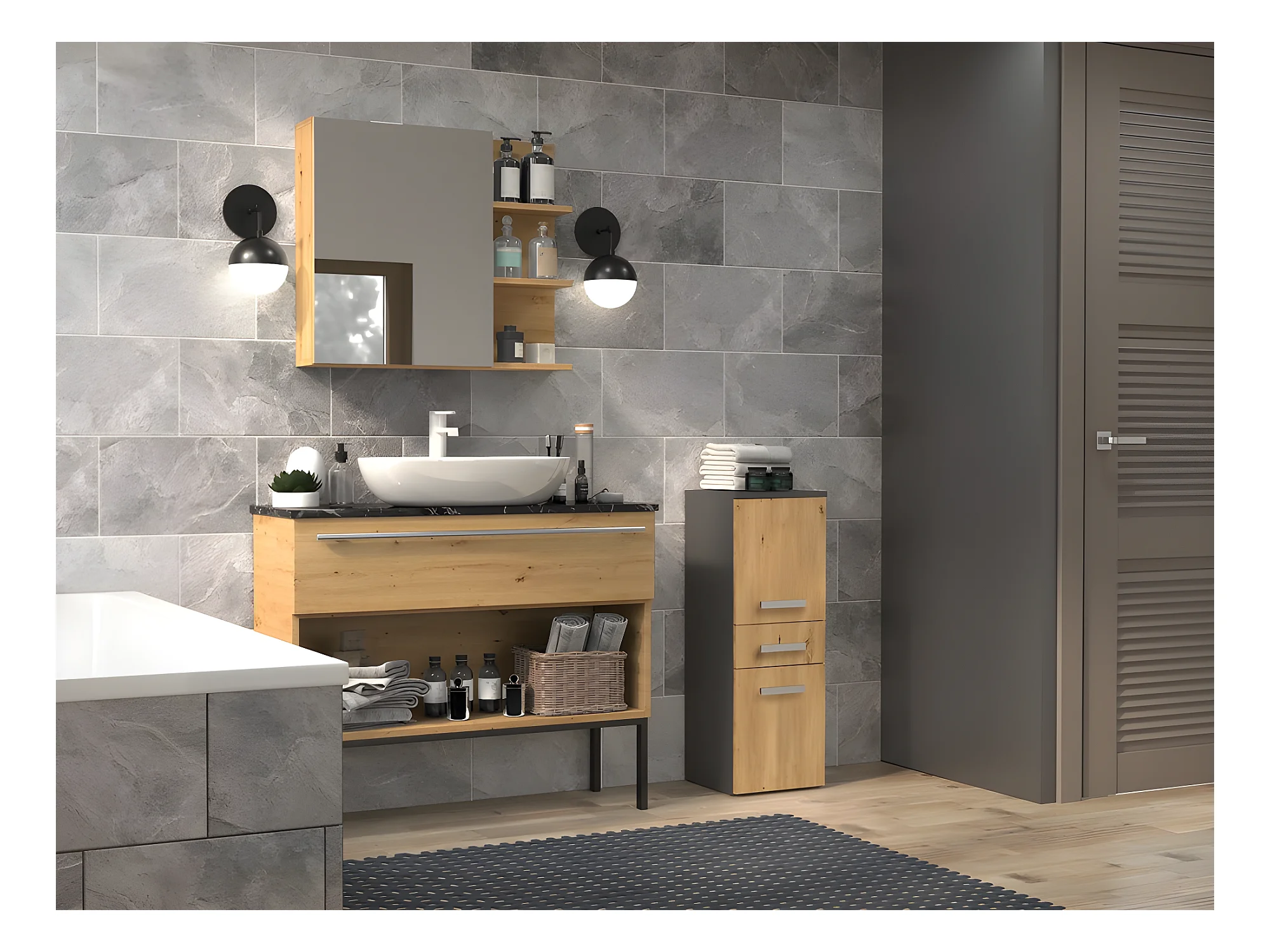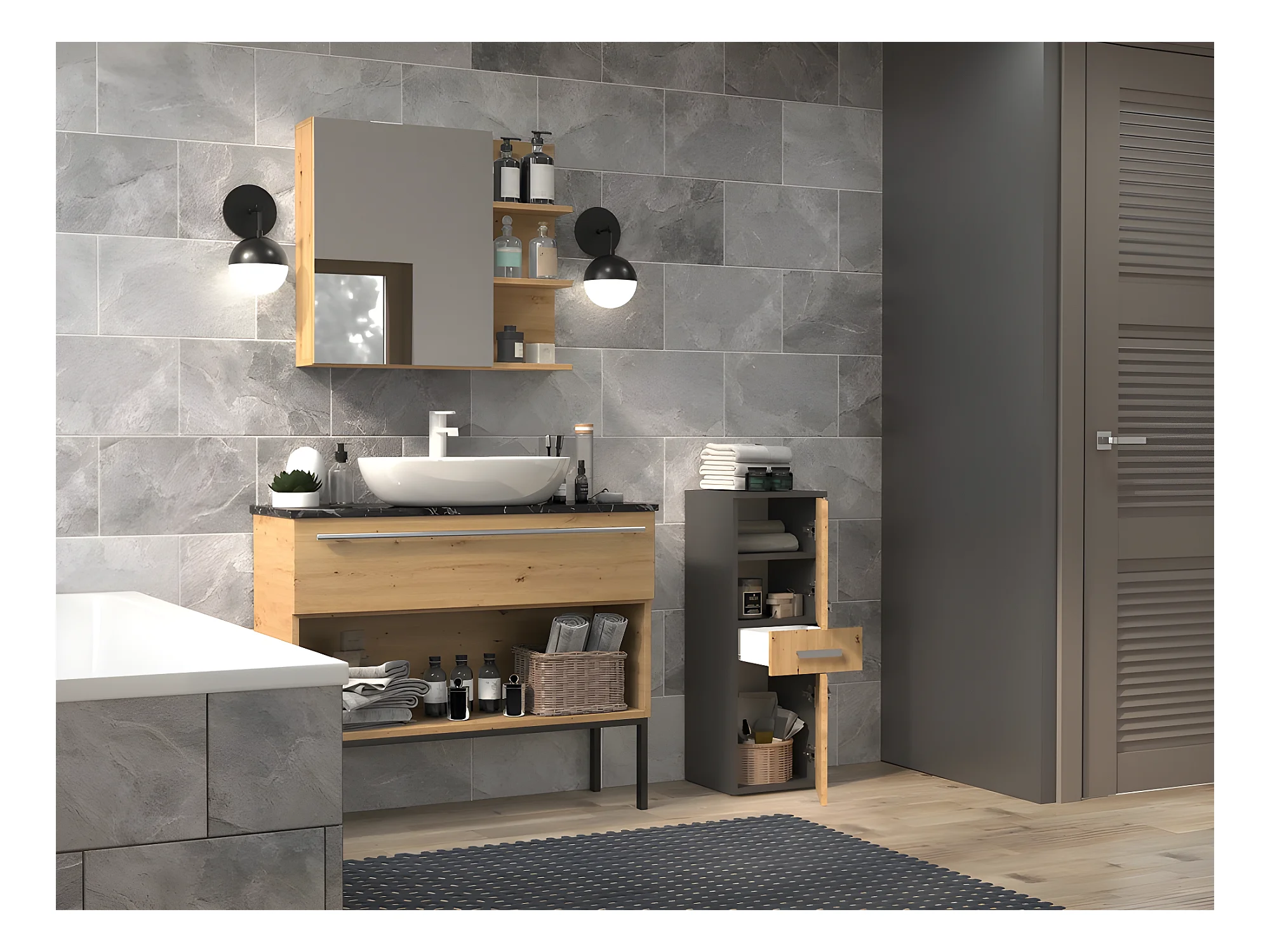 Armario de baño colgante horizontal de 80 cm con estantes en roble craft y negro.