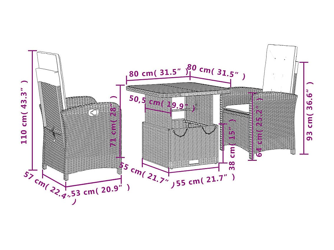 Toby Dean Set comedor de jardín 3 pzas con cojines ratán sintético negro