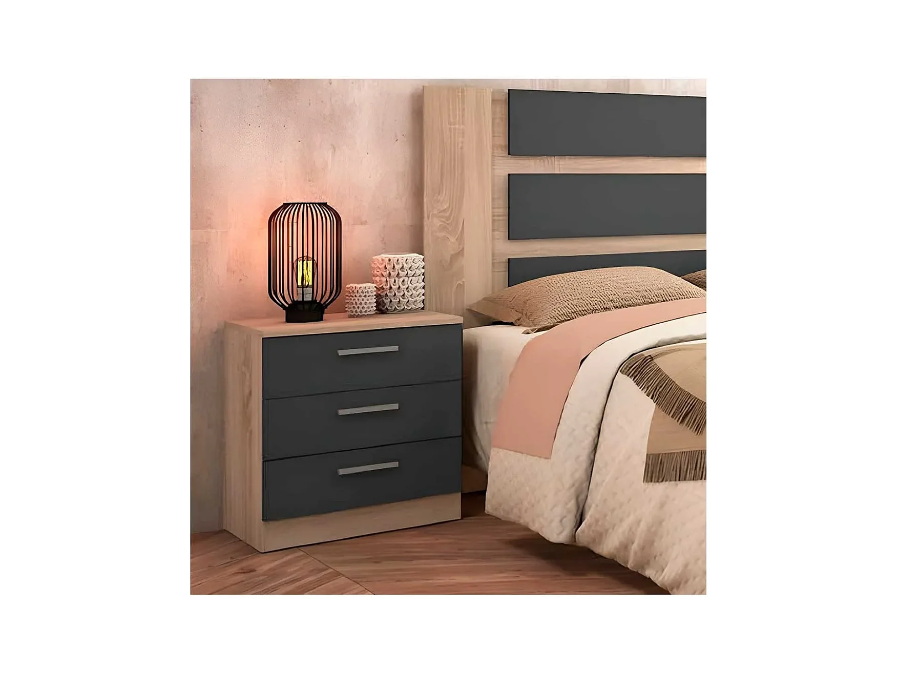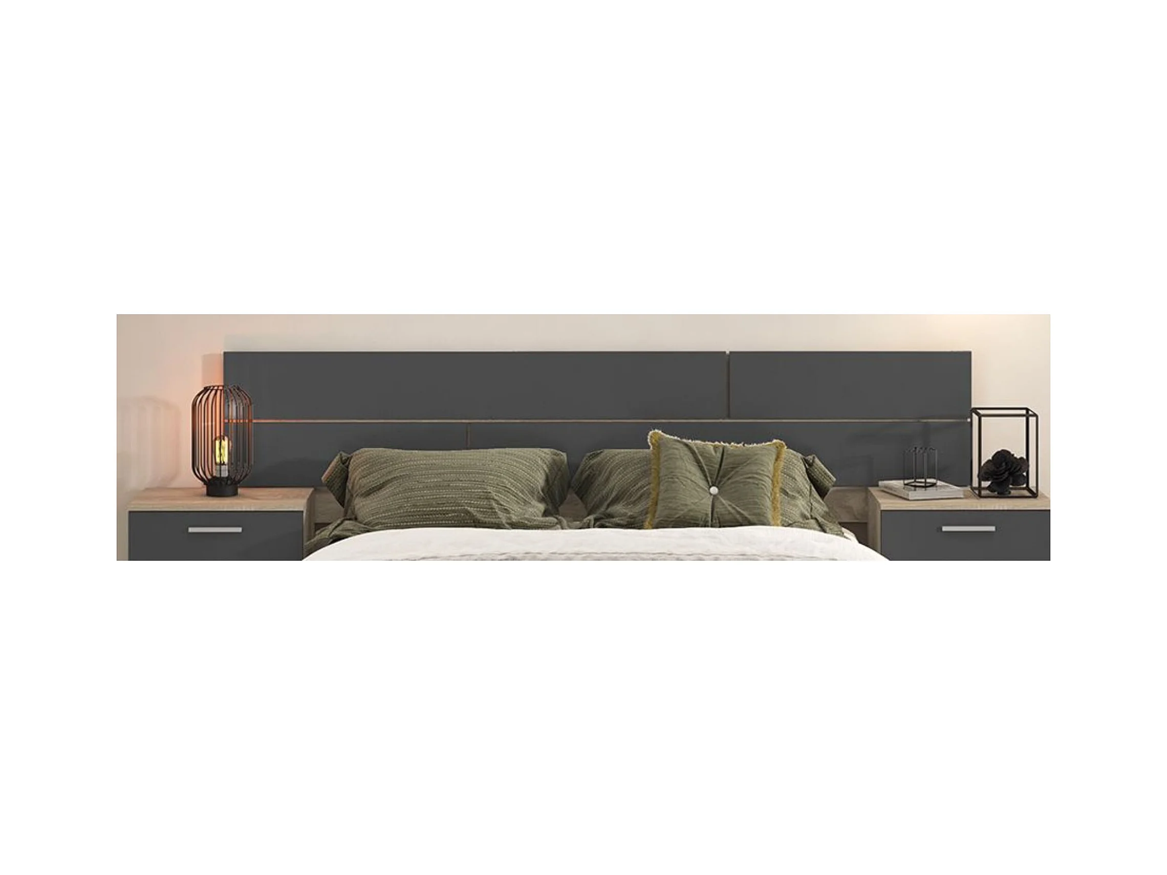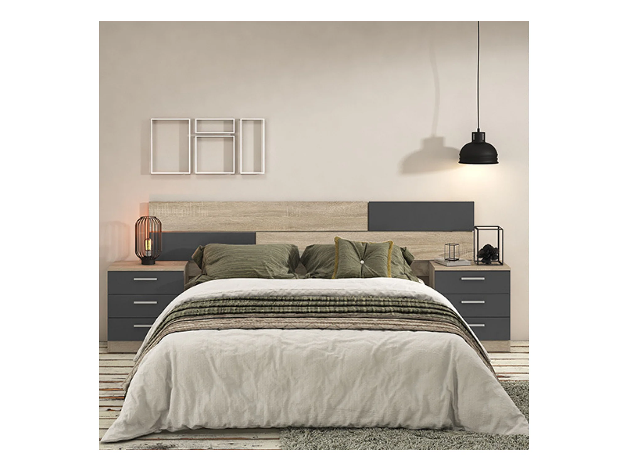 Pack Cabecero y 2 Mesitas de Noche, Dormitorio Doble, Dormitorio Completo, Acabado en Cambria y Grafito, Medidas: 220 cm (An) x 50 cm (Al) x 35 cm (Fo