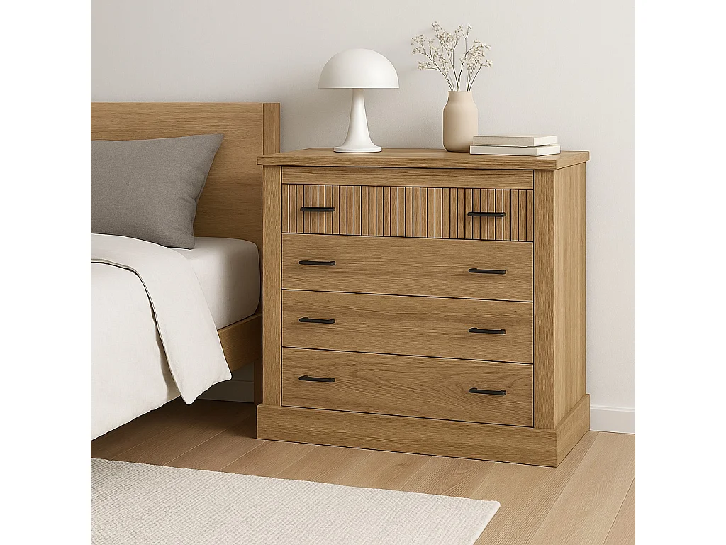 Pack de Muebles de Dormitorio Habitación con Cabecero, 2 Mesitas de Noche 3 Cajones y Cómoda en Color Blanco Mate Mauvella Rayas