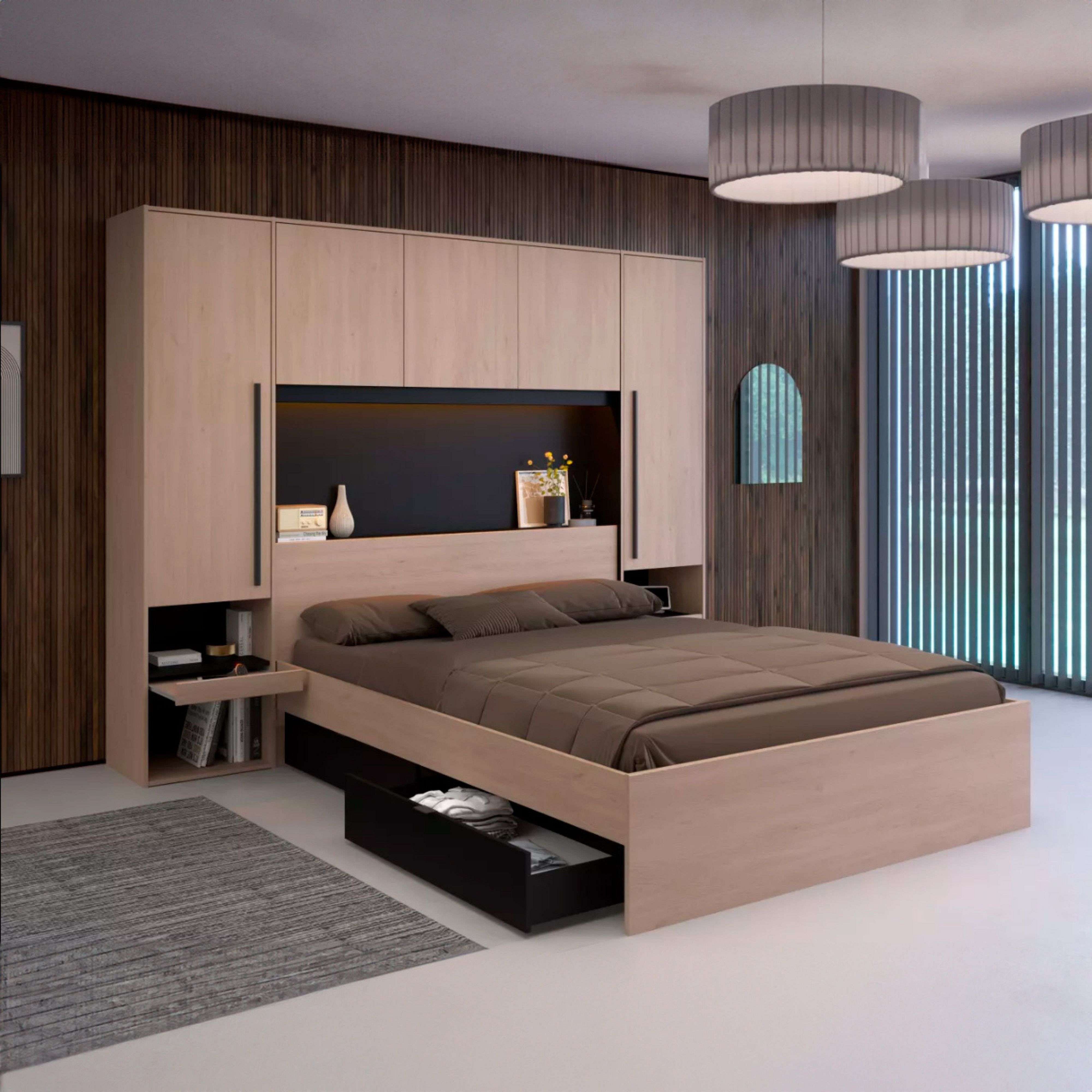 Habitación completa VERTIGO – Cama 160x200 con somier, 2 mesitas de noche, armario 4 puertas + contorno diseño