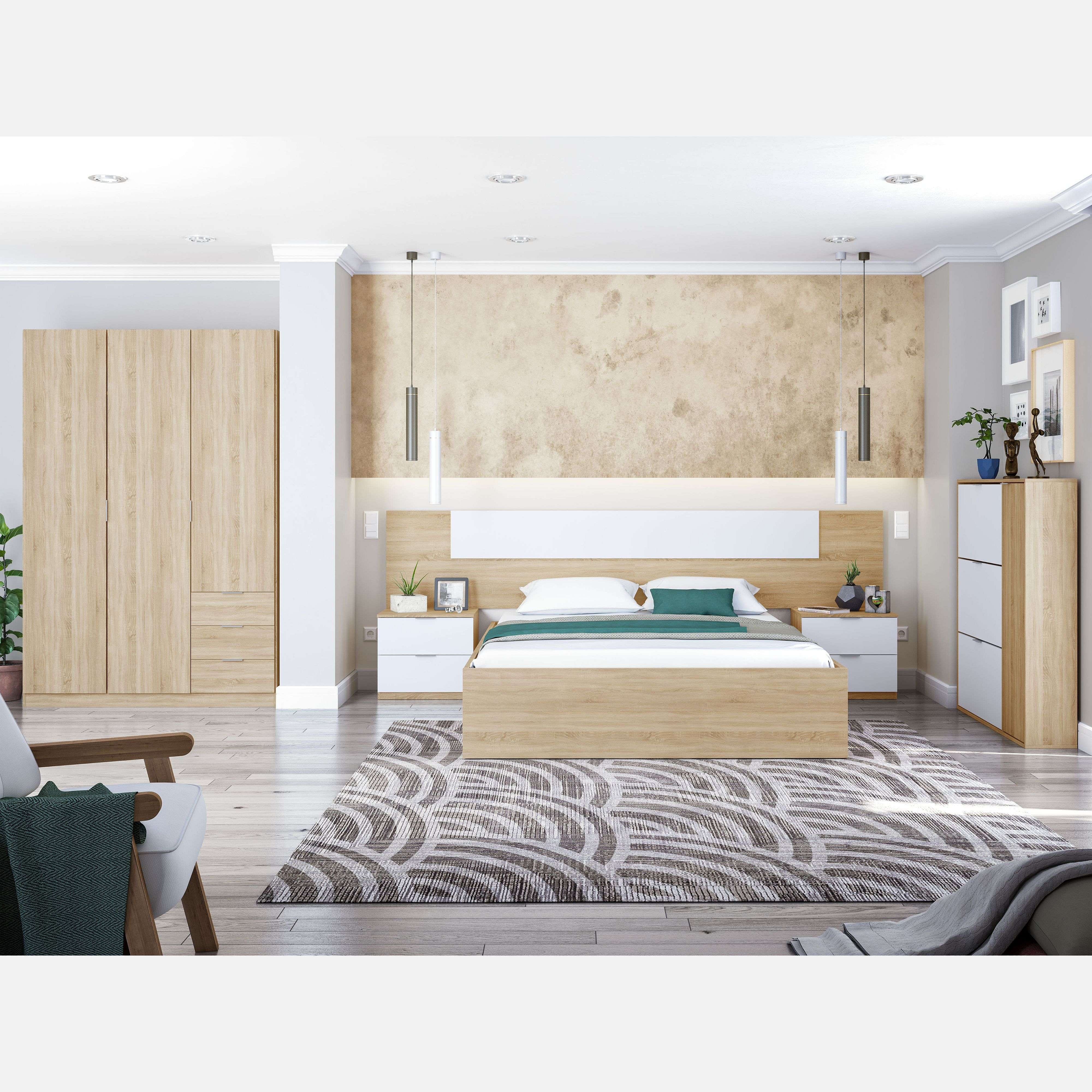 Pack Matrimonio Completo cama + cabecero + 2 mesitas + cómoda Roble y Blanco