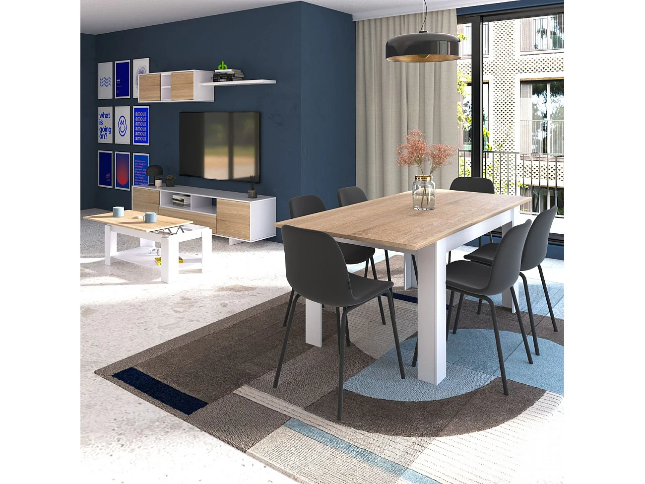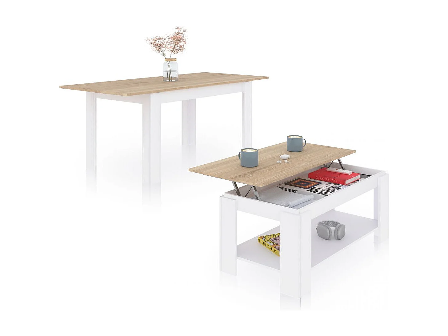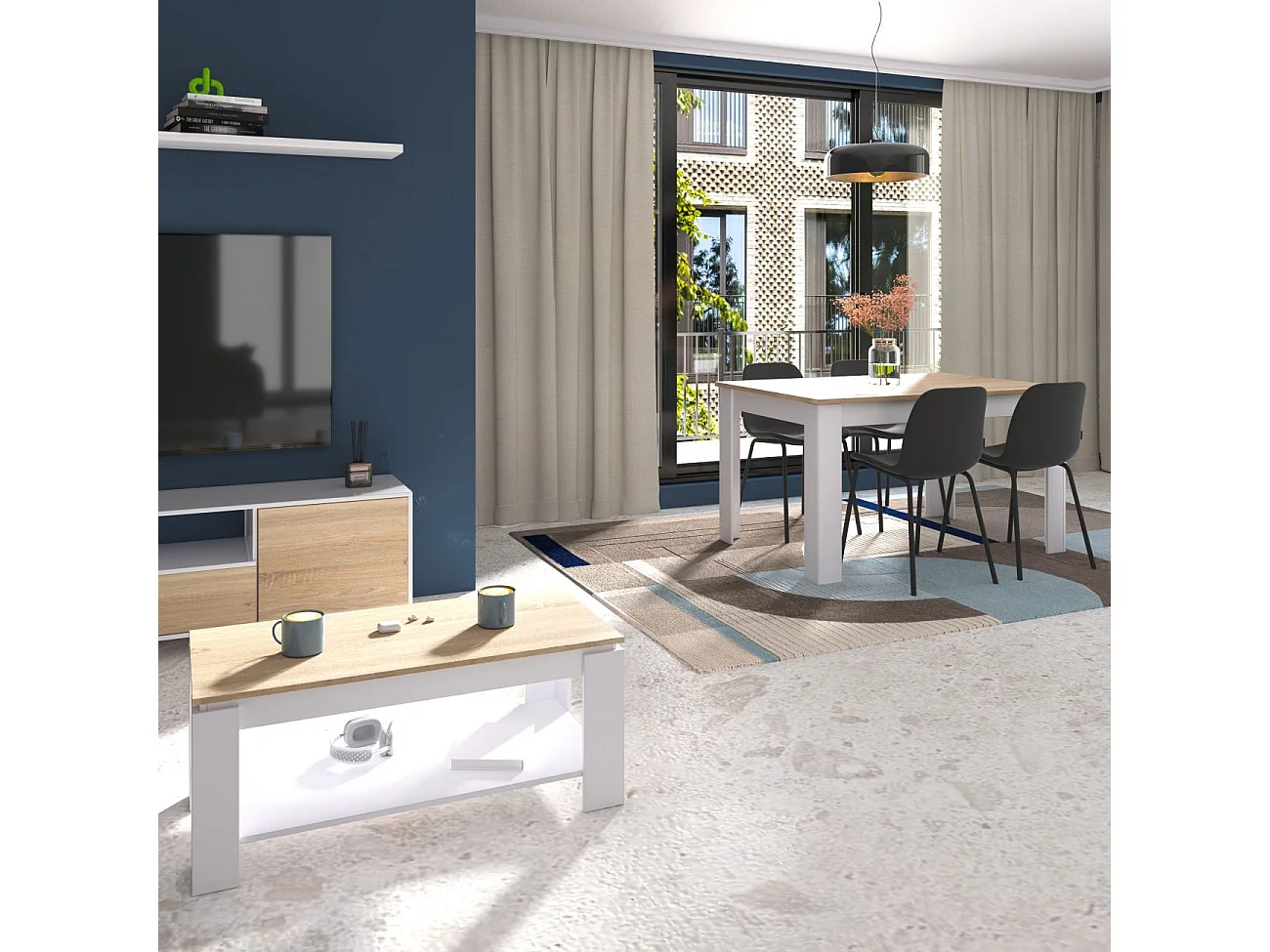Pack mesa de comedor 123 y mesa de centro Lya Blanco Artik (Blanco Mate) - Roble Canadian