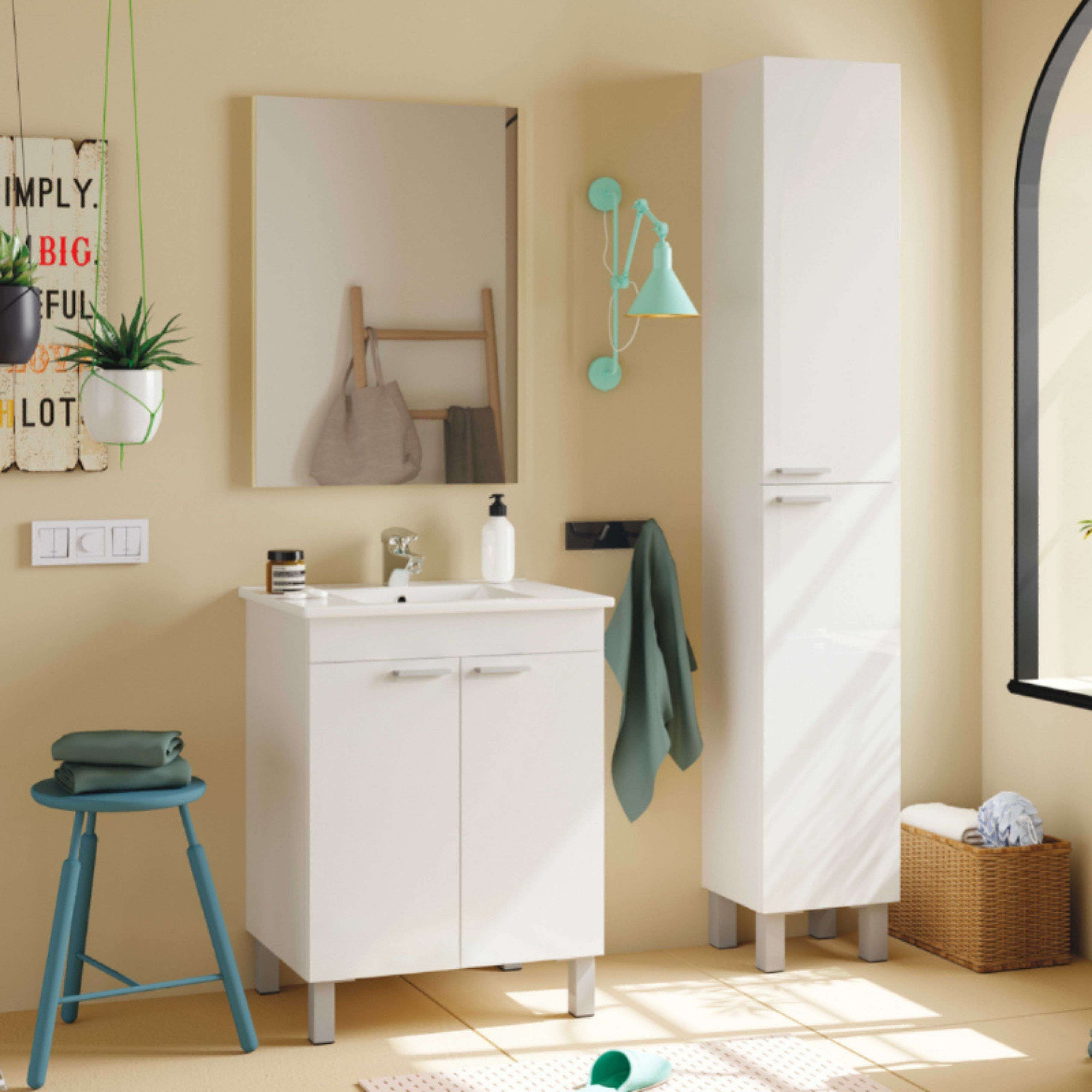 Pack baño Blanco brillo: mueble + espejo + lavabo cerámico + col. auxiliar