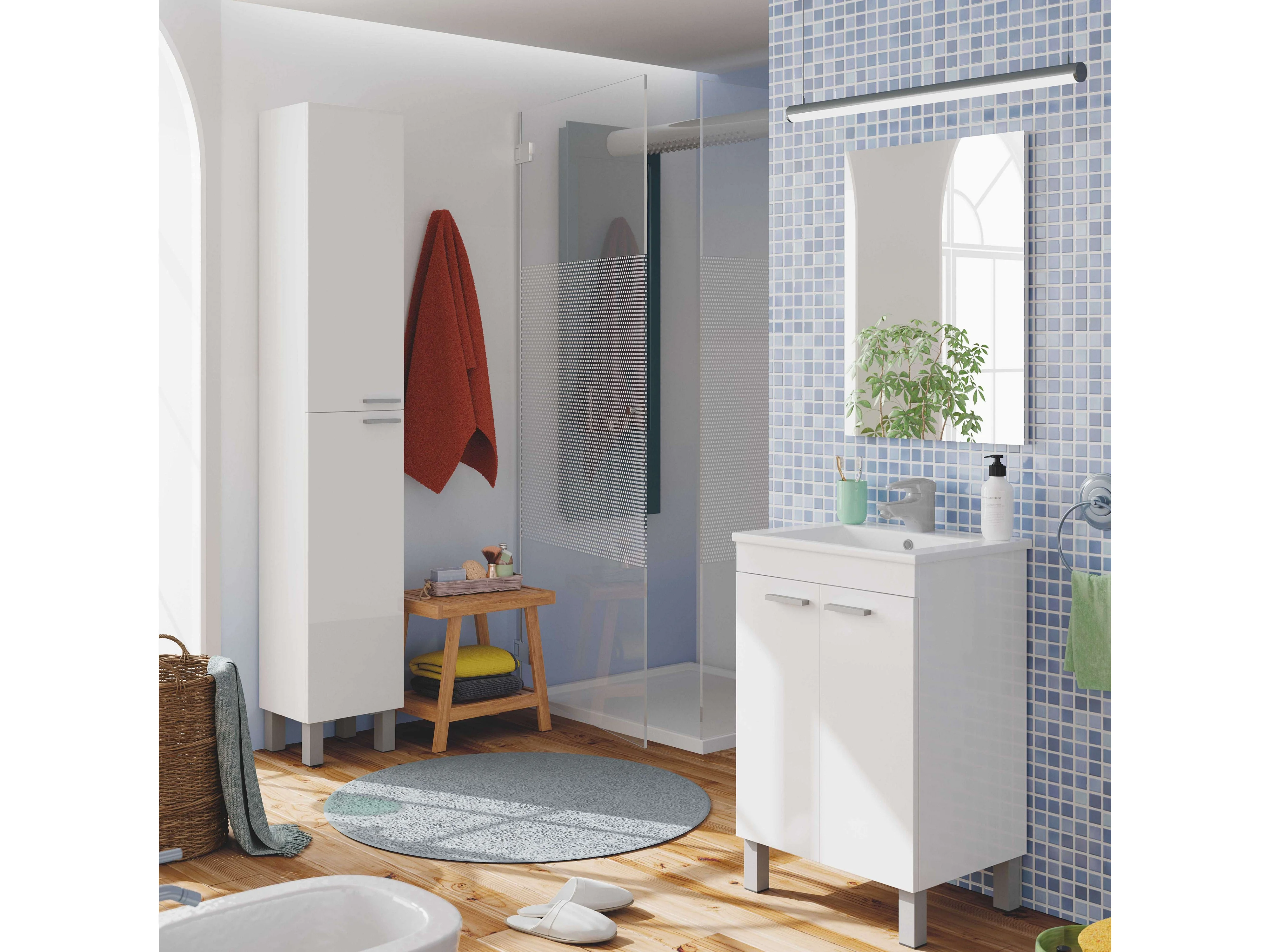 Pack mueble baño blanco brillo moderno: mueble + espejo + columna + lavabo