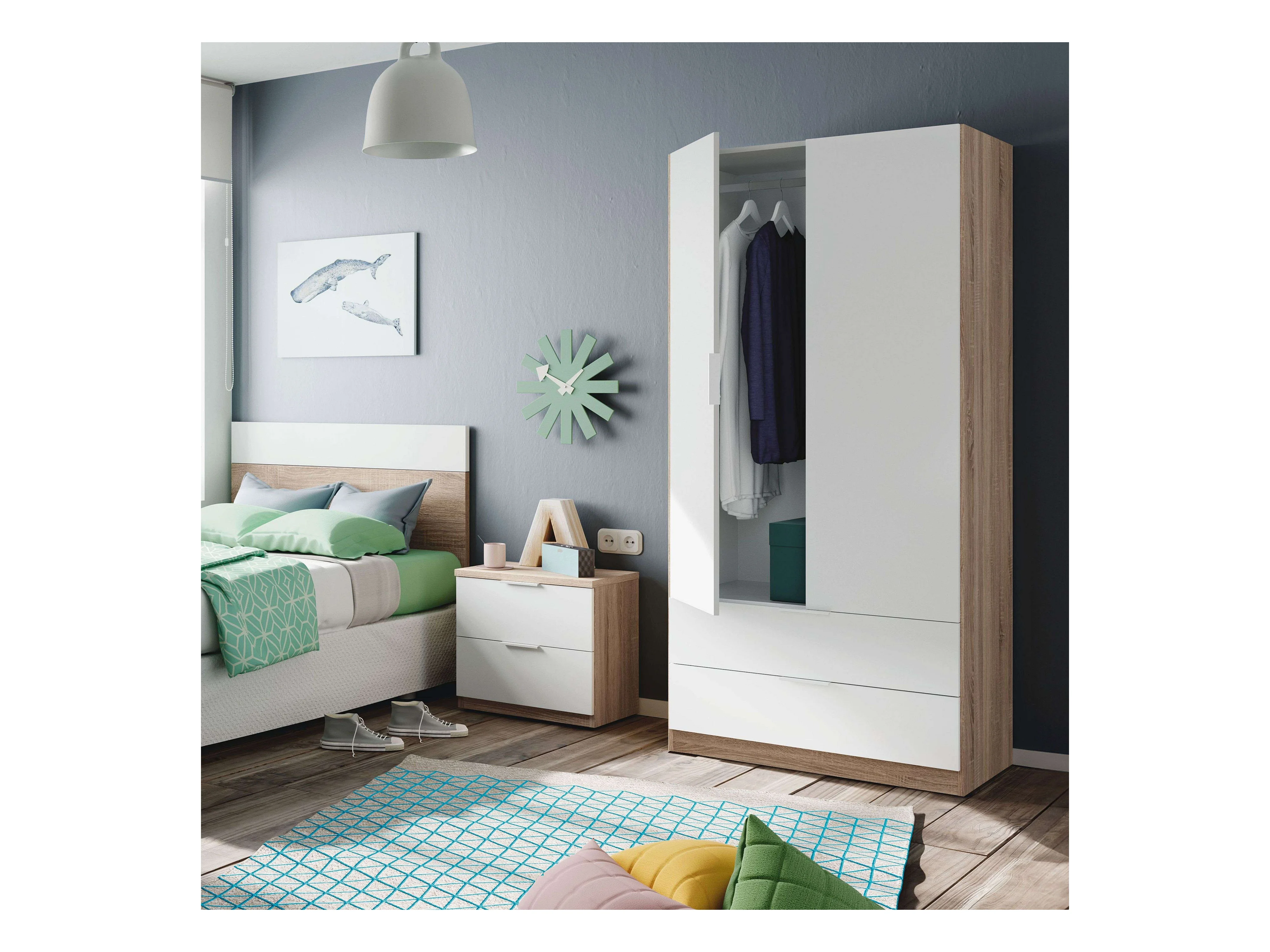 Pack Muebles Dormitorio Juvenil Luca Blanco y Roble: Armario, Cabecero, Mesita