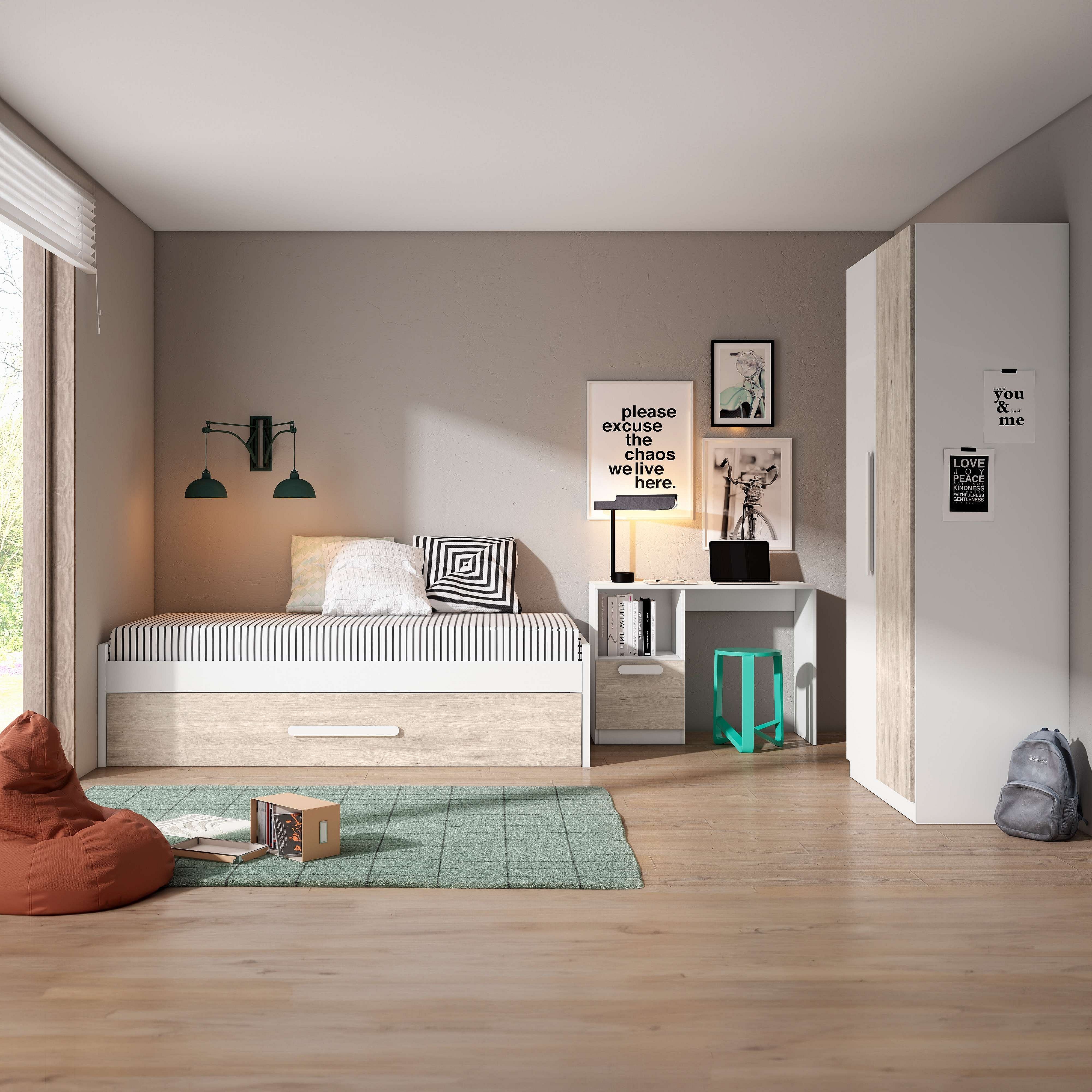 Pack muebles juvenil cama y armario blanco mate y roble nodi diseño moderno