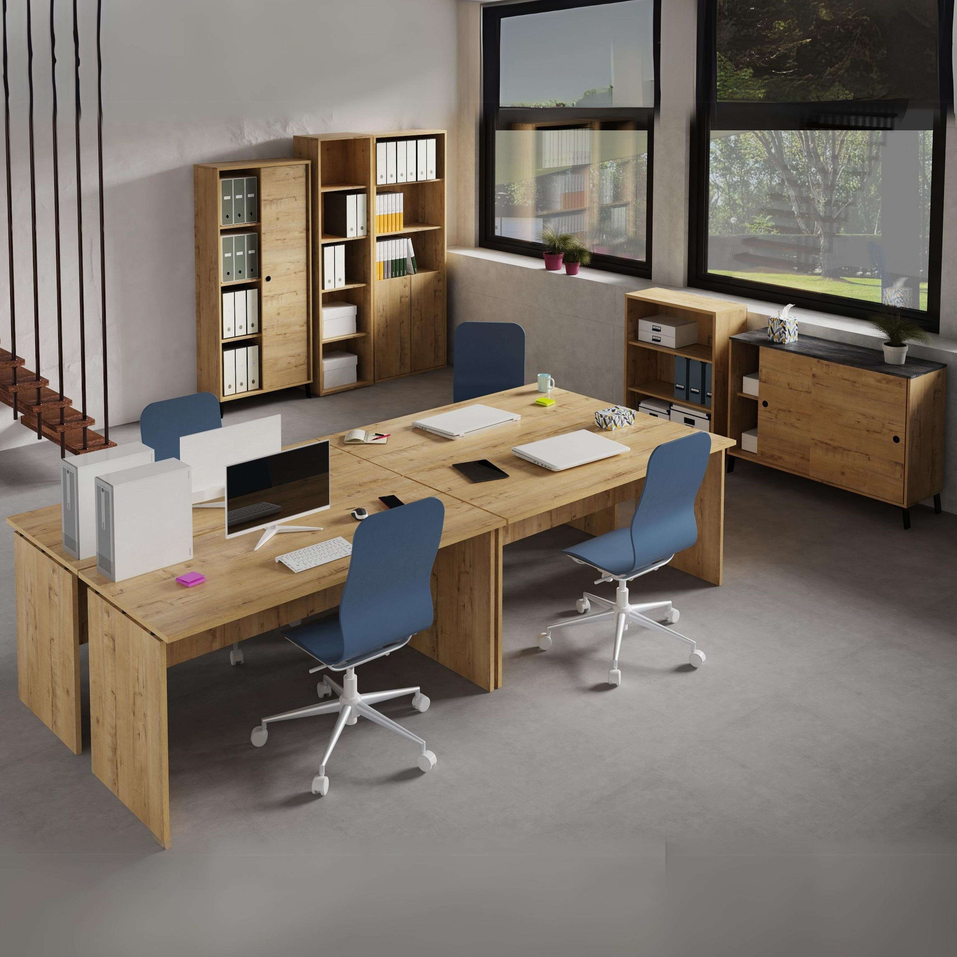Pack Oficina: 4 Escritorios 155cm + 3 Estanterías + Aparador + Librería Roble