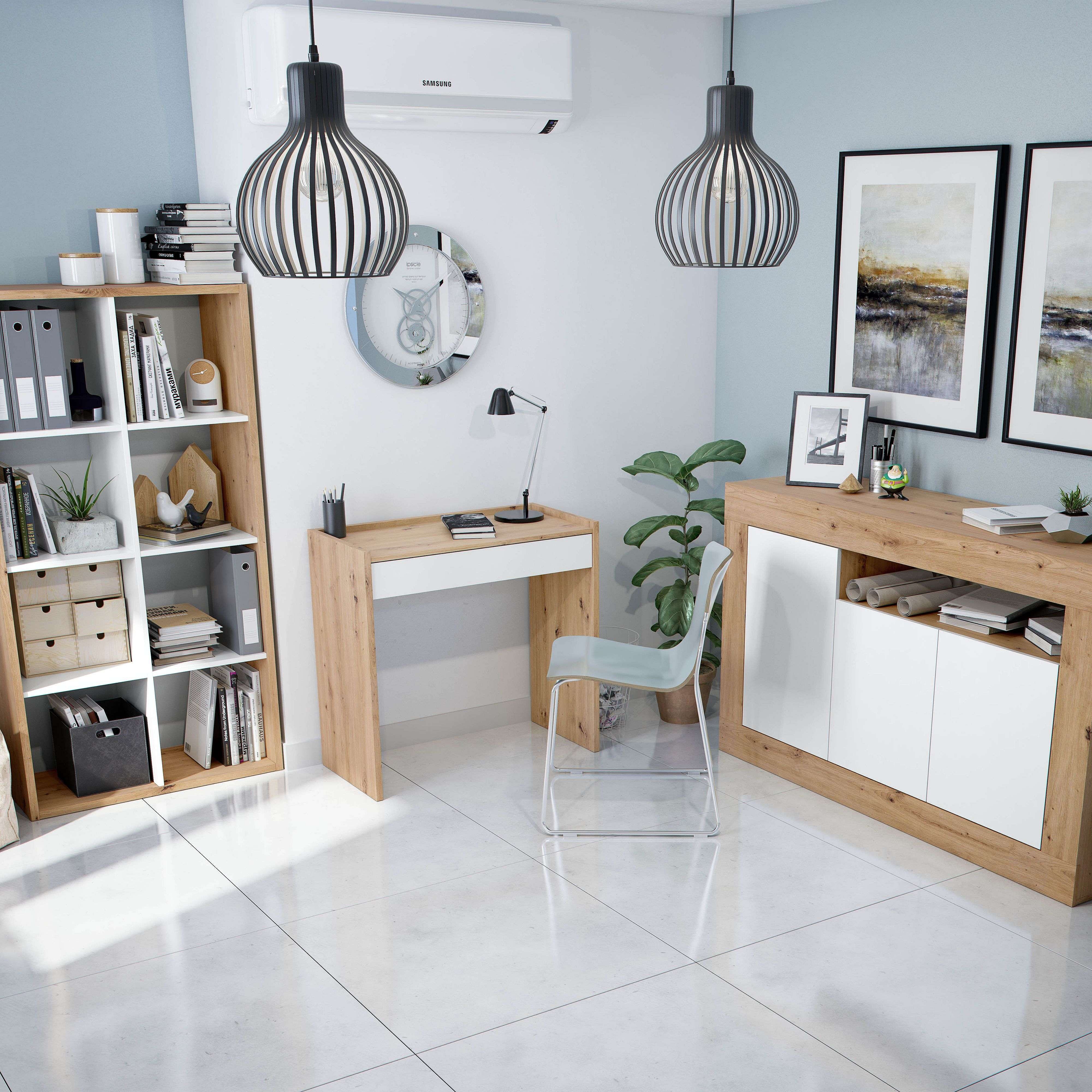 Pack oficina: escritorio + estantería + aparador roble nodi/ blanco mate