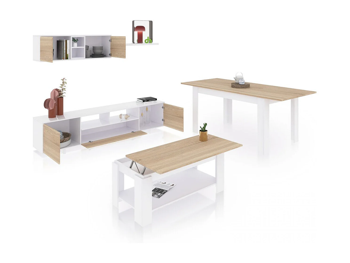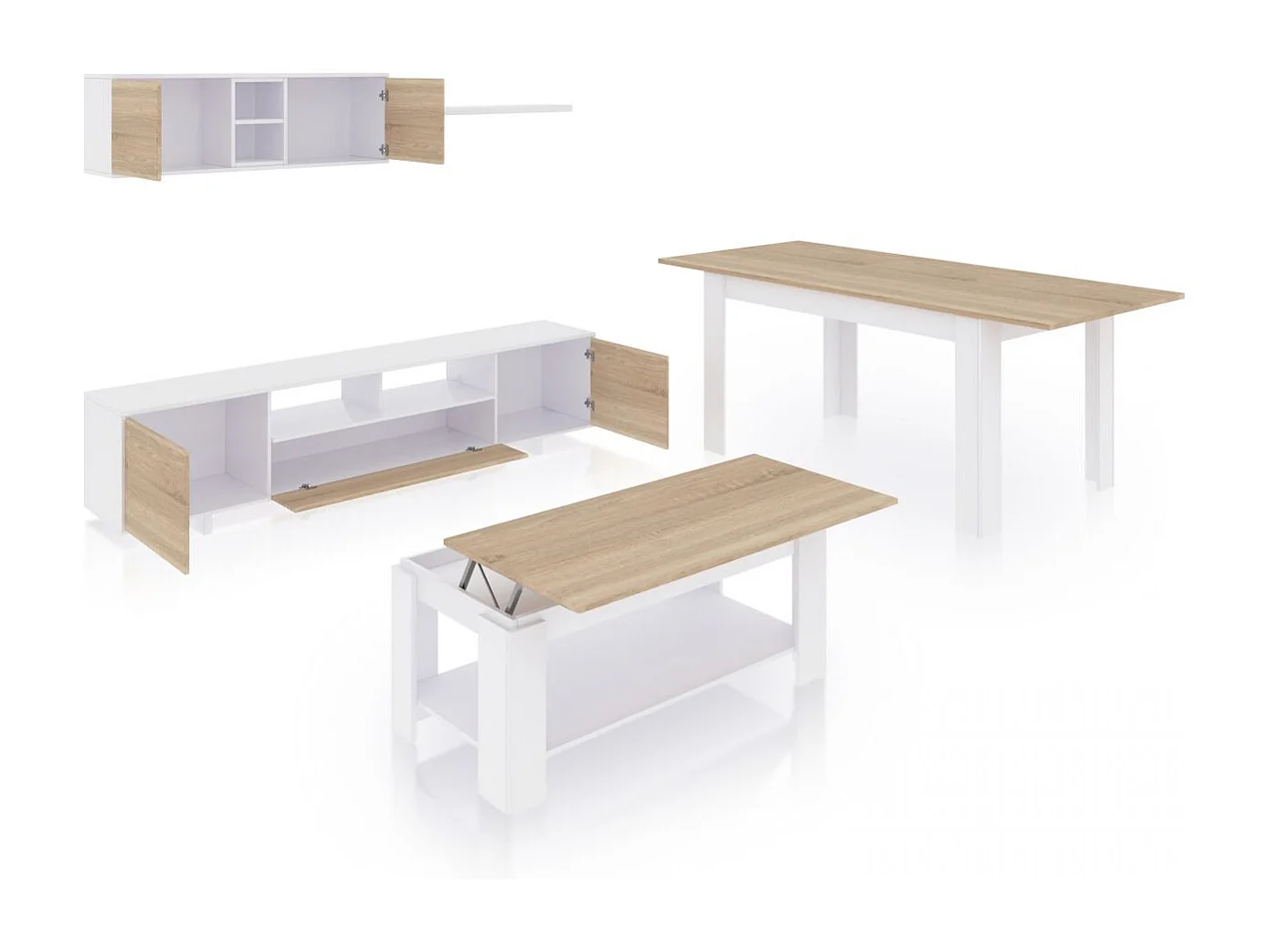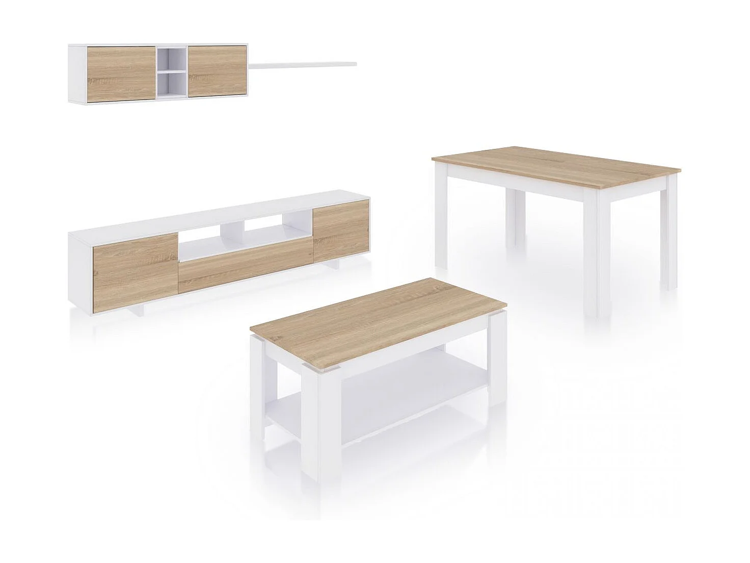 Pack salón con mesa de centro y mesa de comedor Kenzo Max V1A Blanco Artik (Blanco Mate) - Roble Canadian