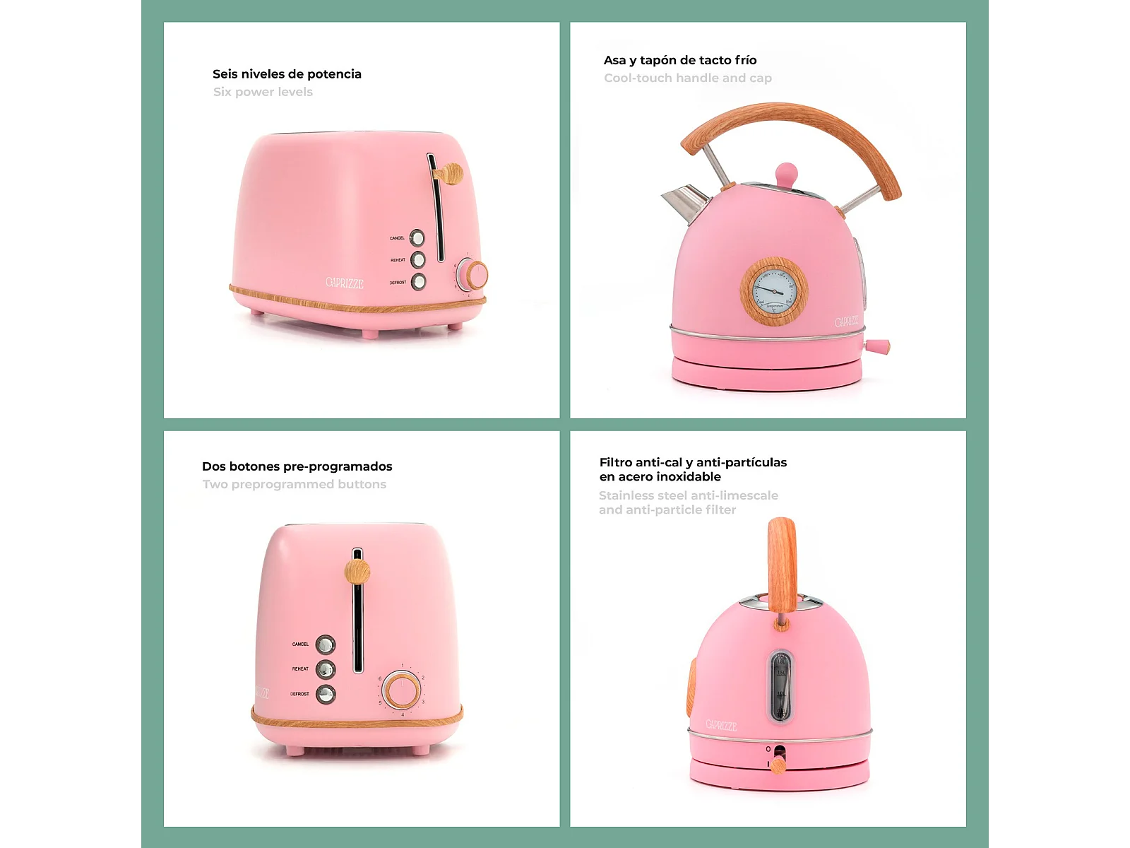 Pack Tostadora de Pan Caprizze Kaito con Doble Ranura Extra Ancha y Hervidora Nara Color Rosa Mate con Diseño Retro Vintage