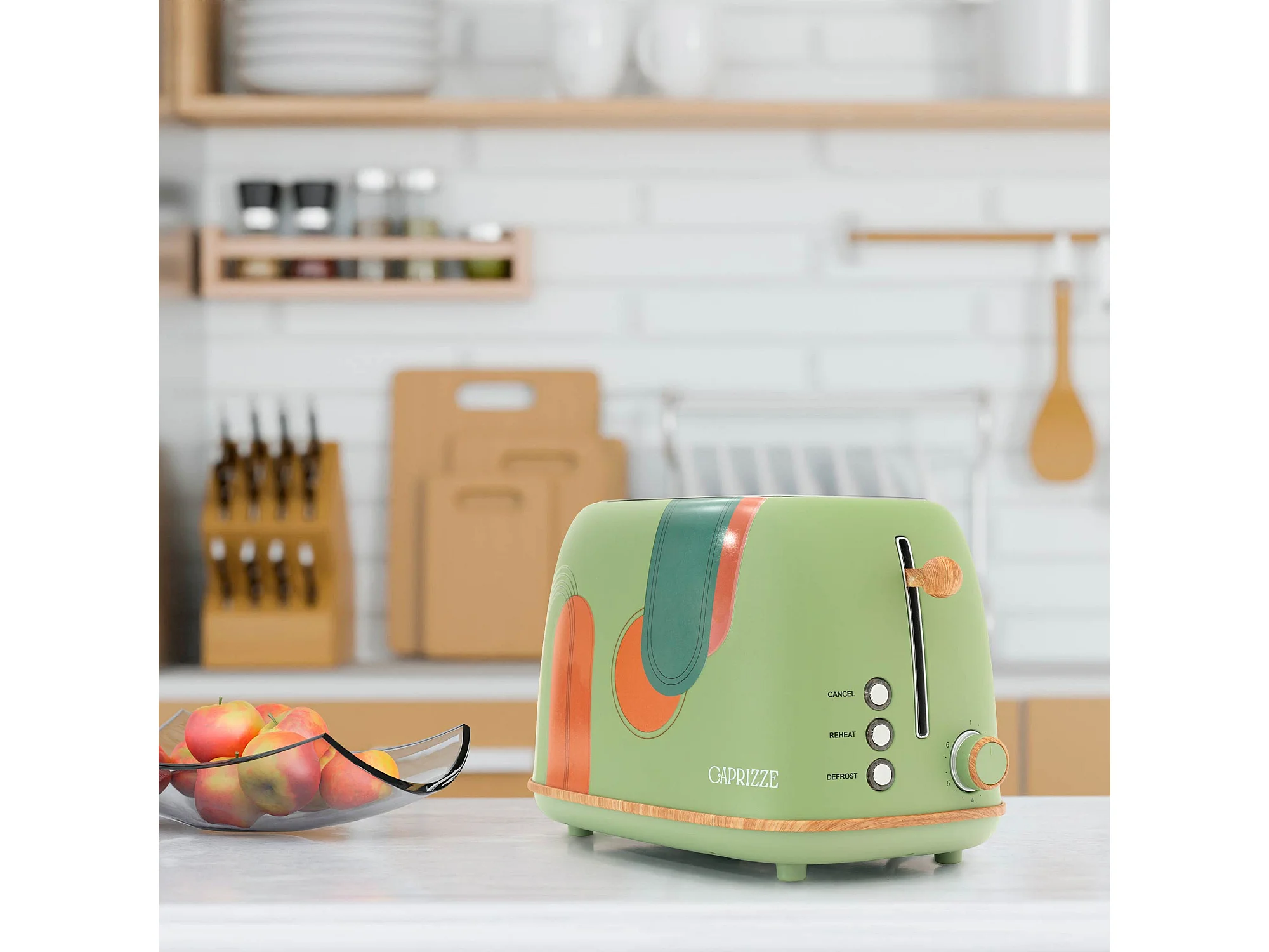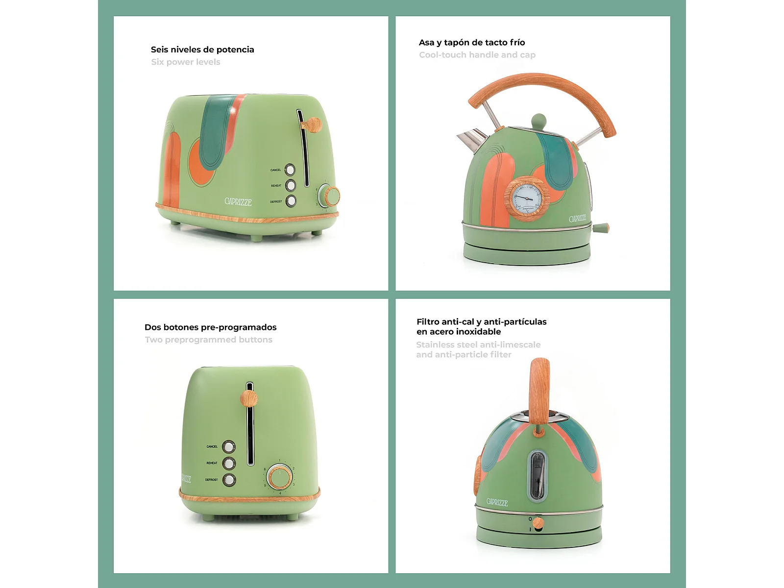 Pack Tostadora de Pan Caprizze Kaito con Doble Ranura Extra Ancha y Hervidora Nara Color Verde Mate Floral Diseño Retro Vintage