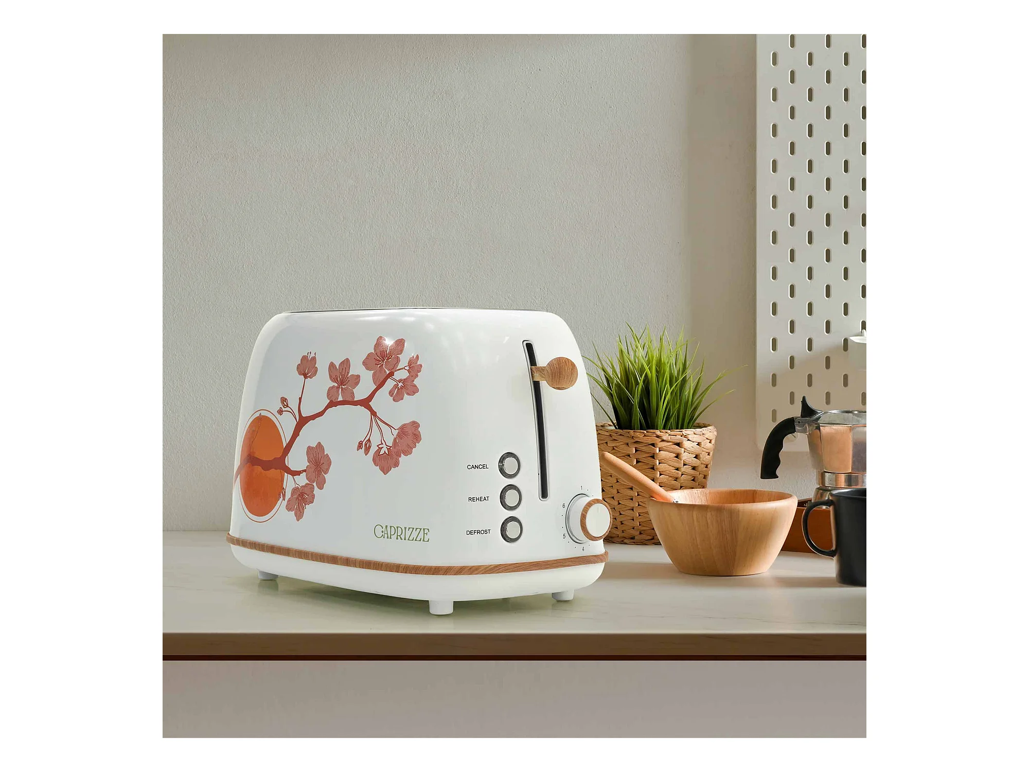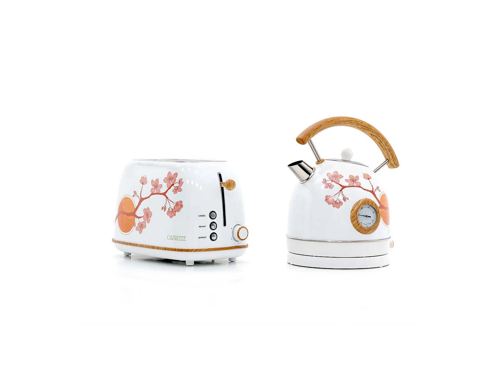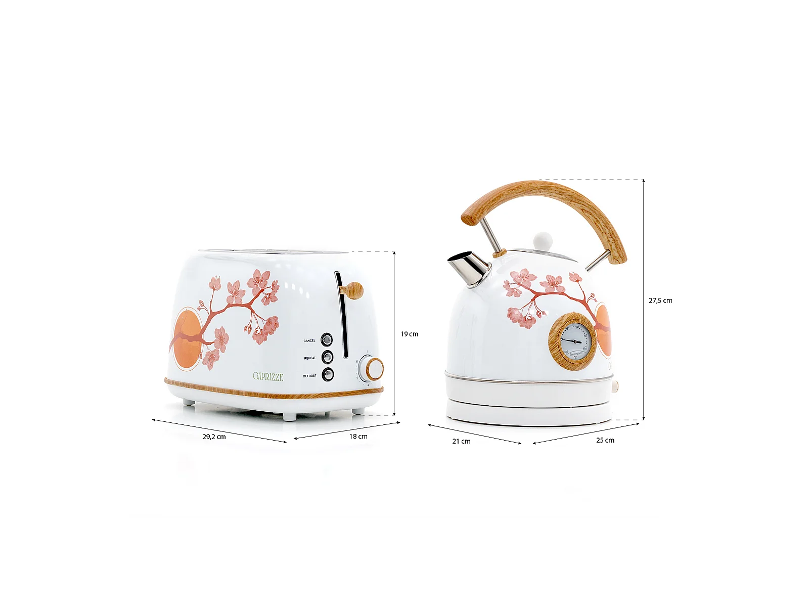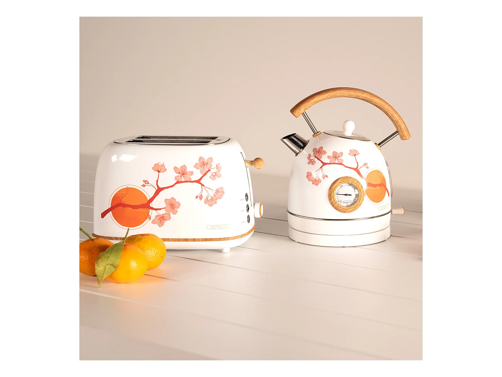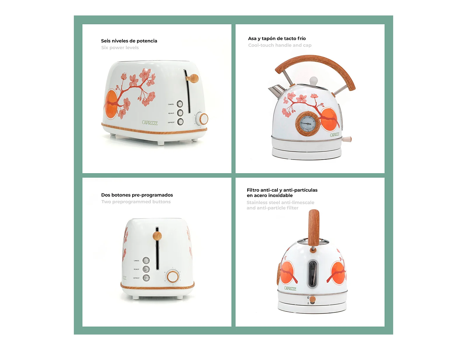 Pack Tostadora de Pan Caprizze Kaito con Doble Ranura Extra Ancha y Hervidora Nara Color Blanco Mate Floral Diseño Retro Vintage