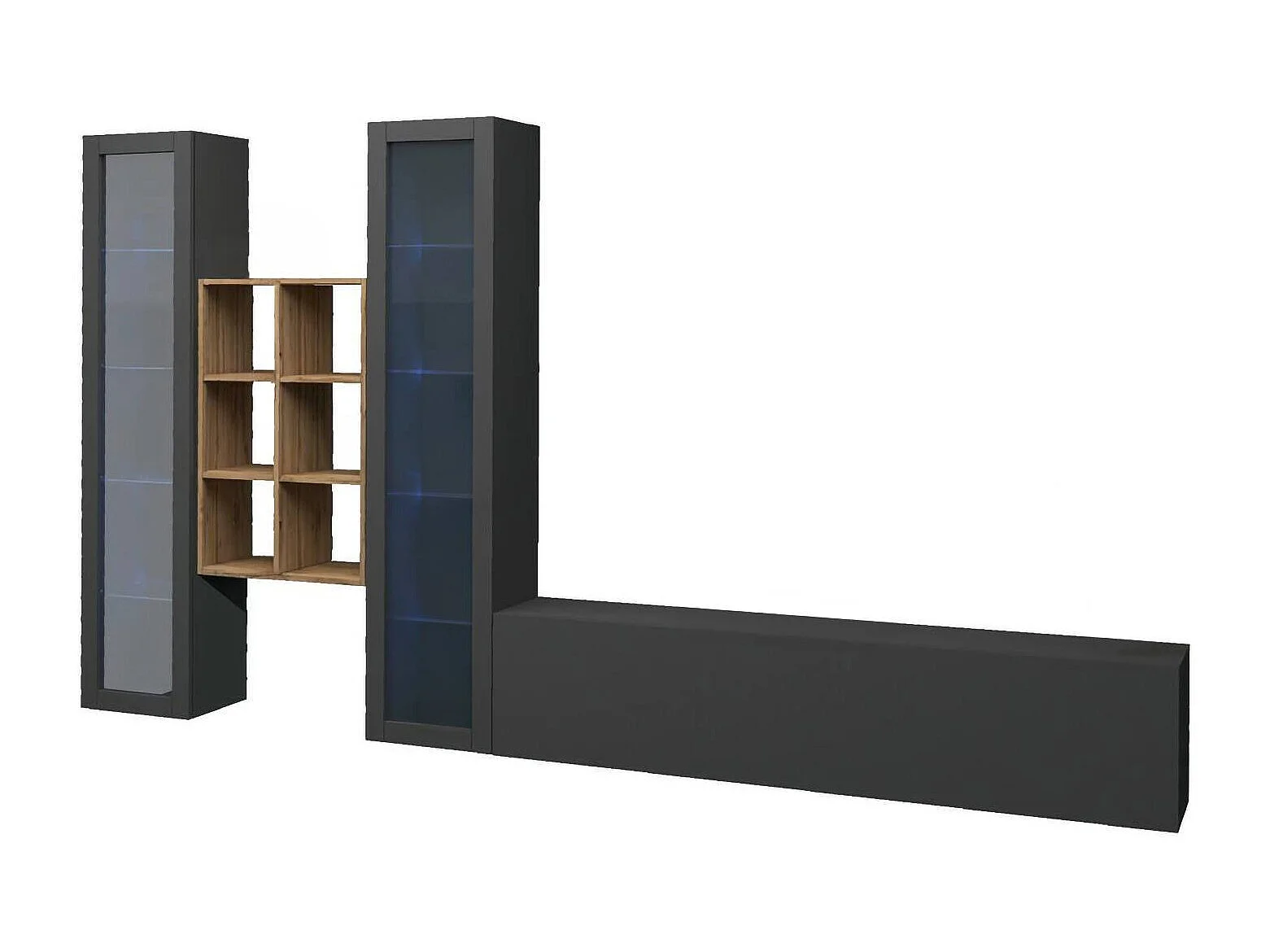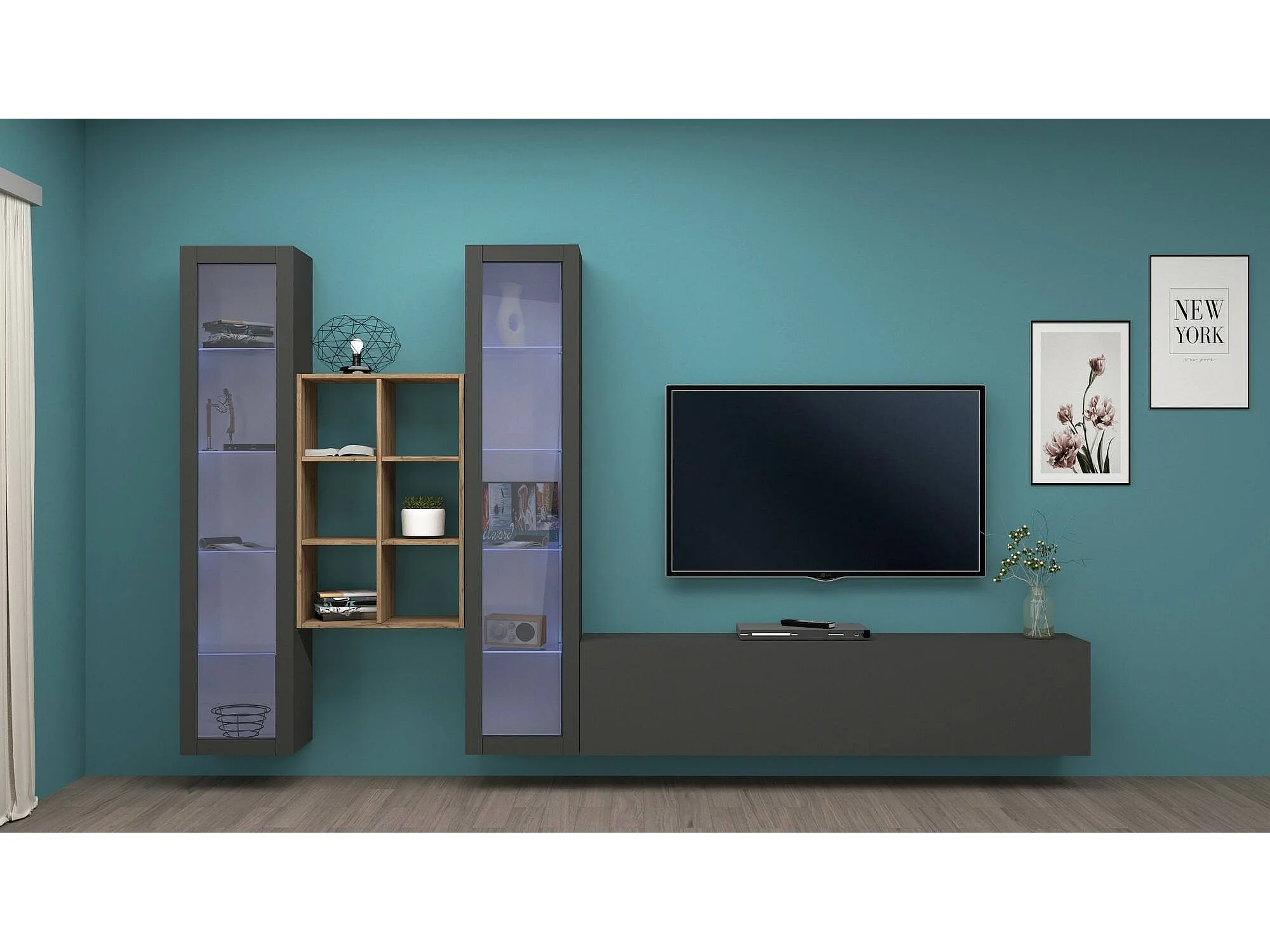 Pared Equipada Eros, Conjunto de salón Mueble de TV con 3 puertas, Mueble de salón polivalente con vitrina y luz LED, 100% Made in Italy, cm 320x30h180, Antracita